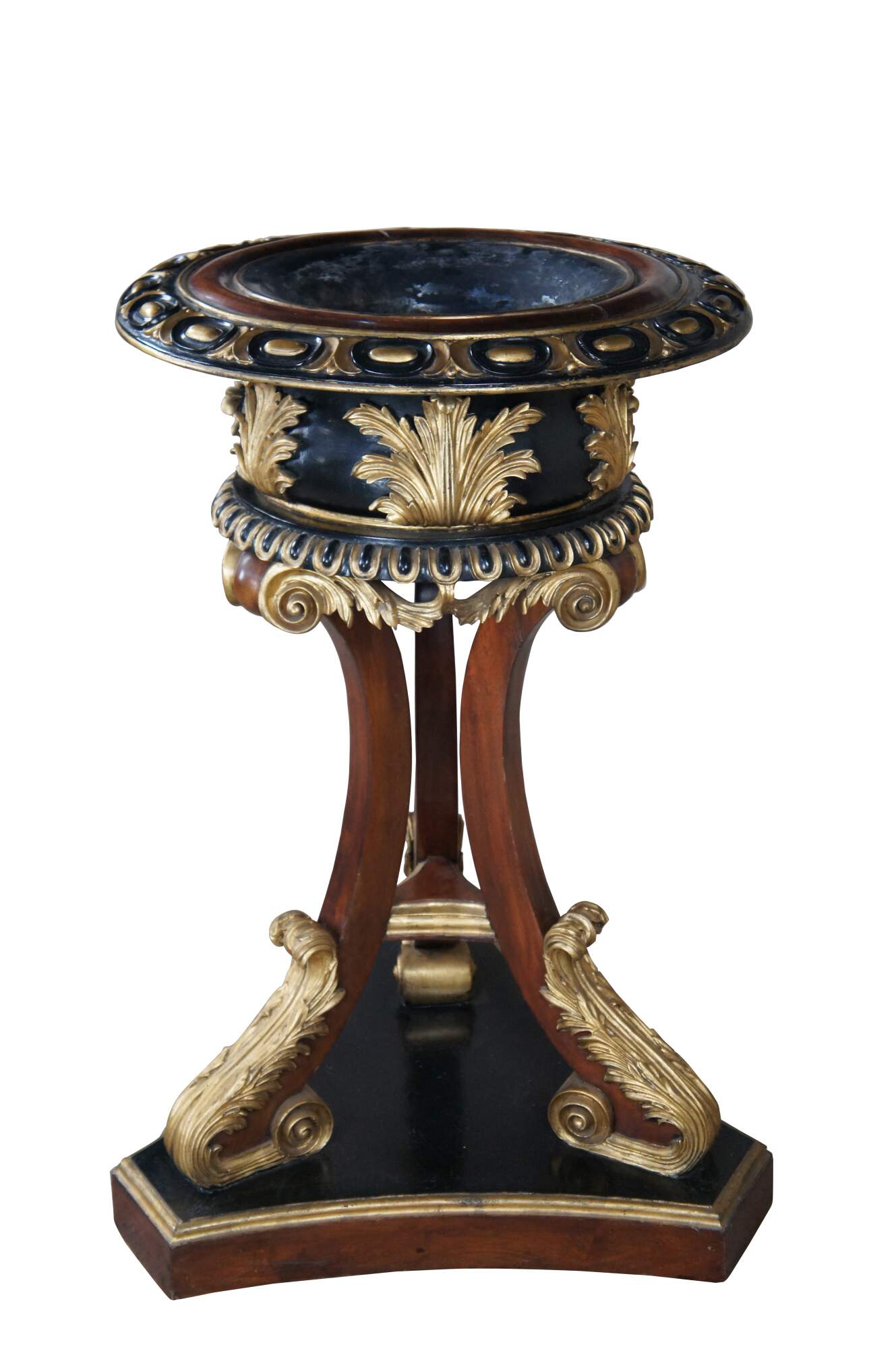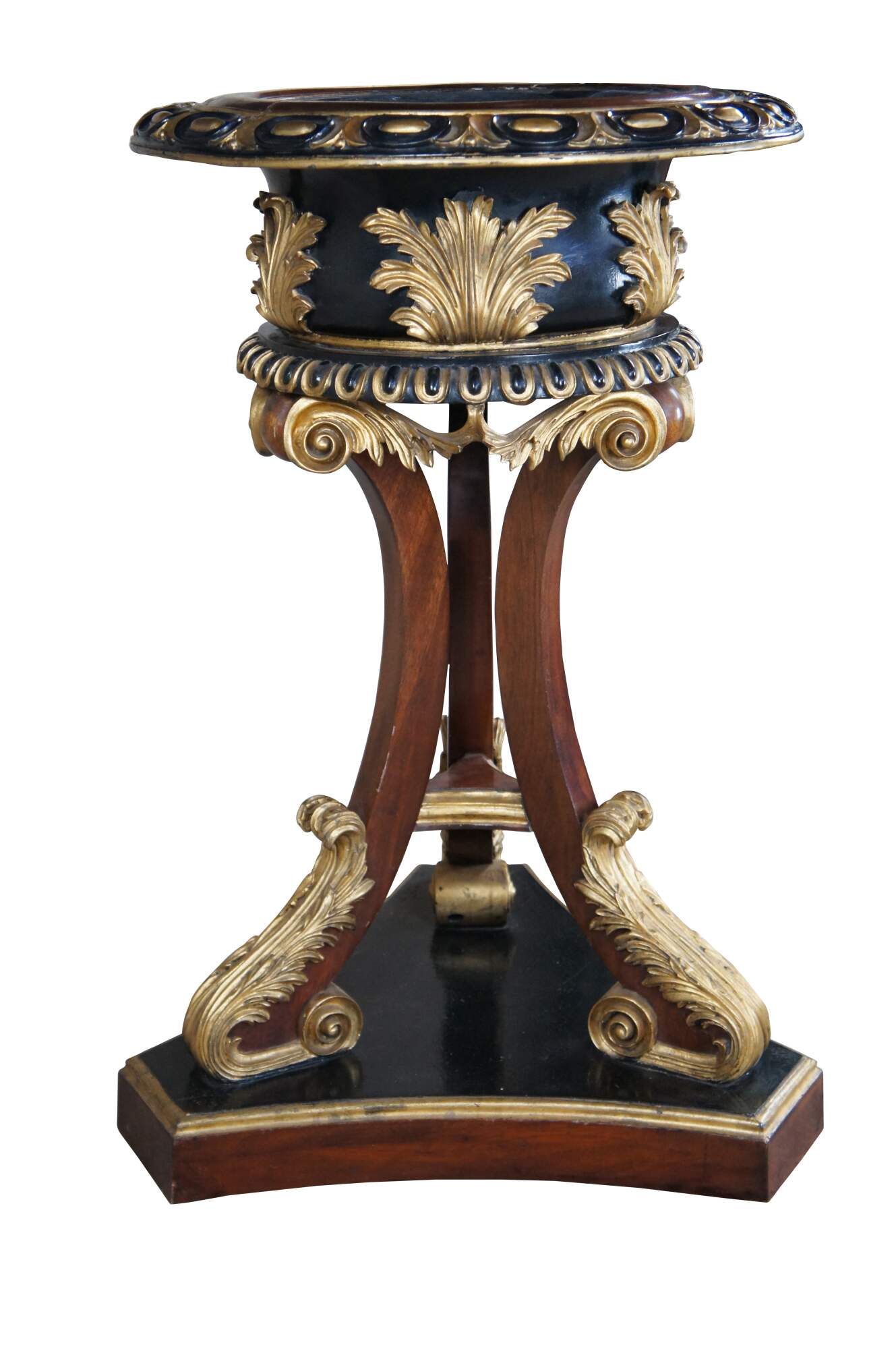 An exquisite Scottish Regency style jardinieres or planter in the manner of William Trotter, circa 19th Century. Constructed from mahogany with a parcel-gilt and ebonized finish. Features a circular basin with a border of cabochons above a shaped body with gilt leaves on a foliate and scroll carved tripod support with a tripartite plinth base. A very similar pair was sold at Christies in 1996 with an estimated value of 15,000-20,000.