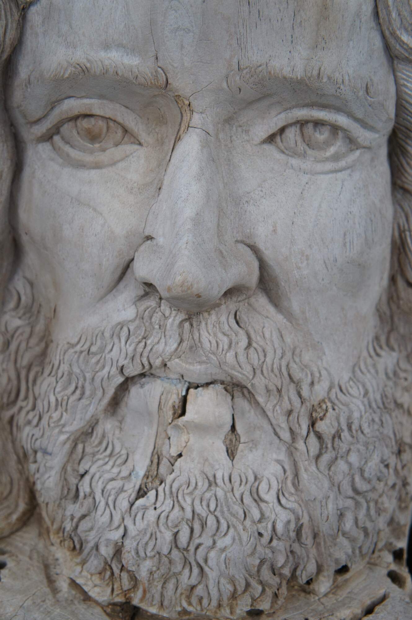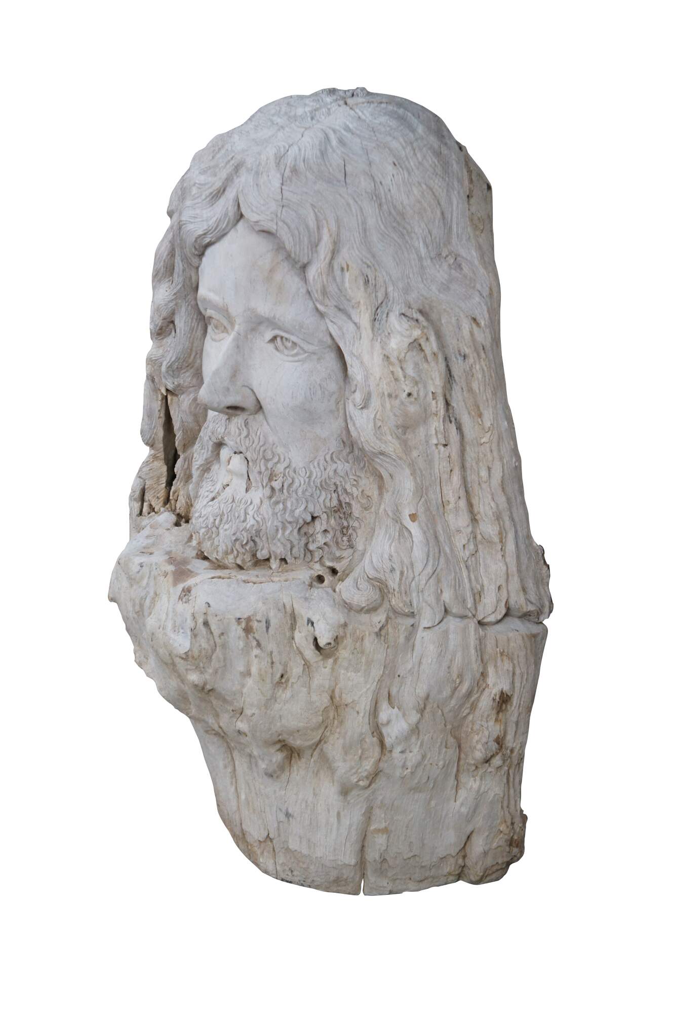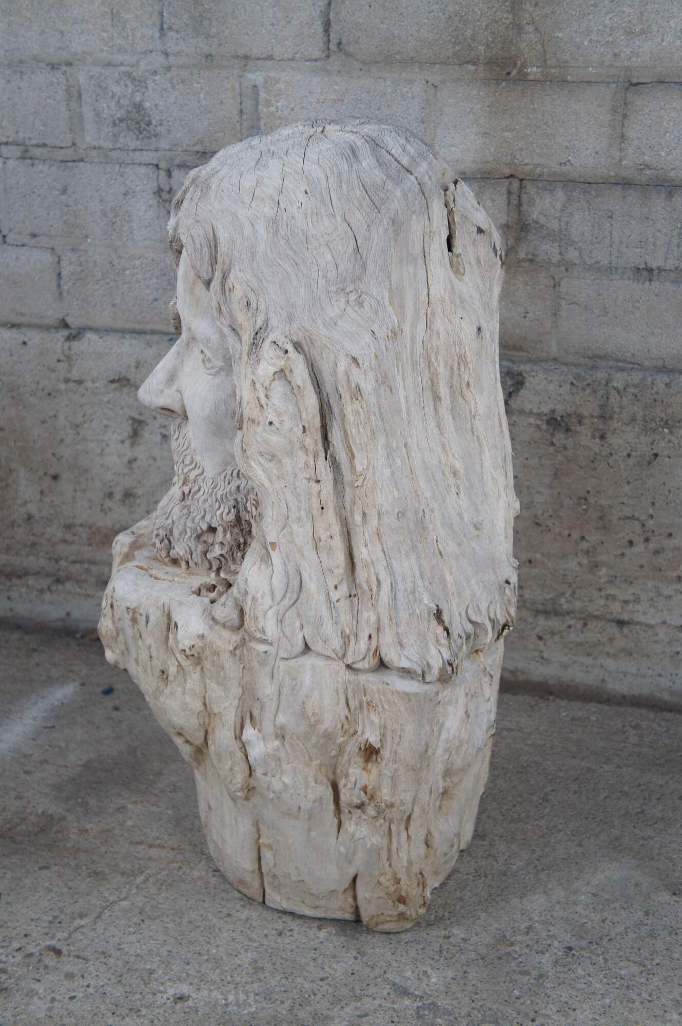 A large driftwood carving of Zues. Handcarved with natural detail from a very heavy piece of driftwood.