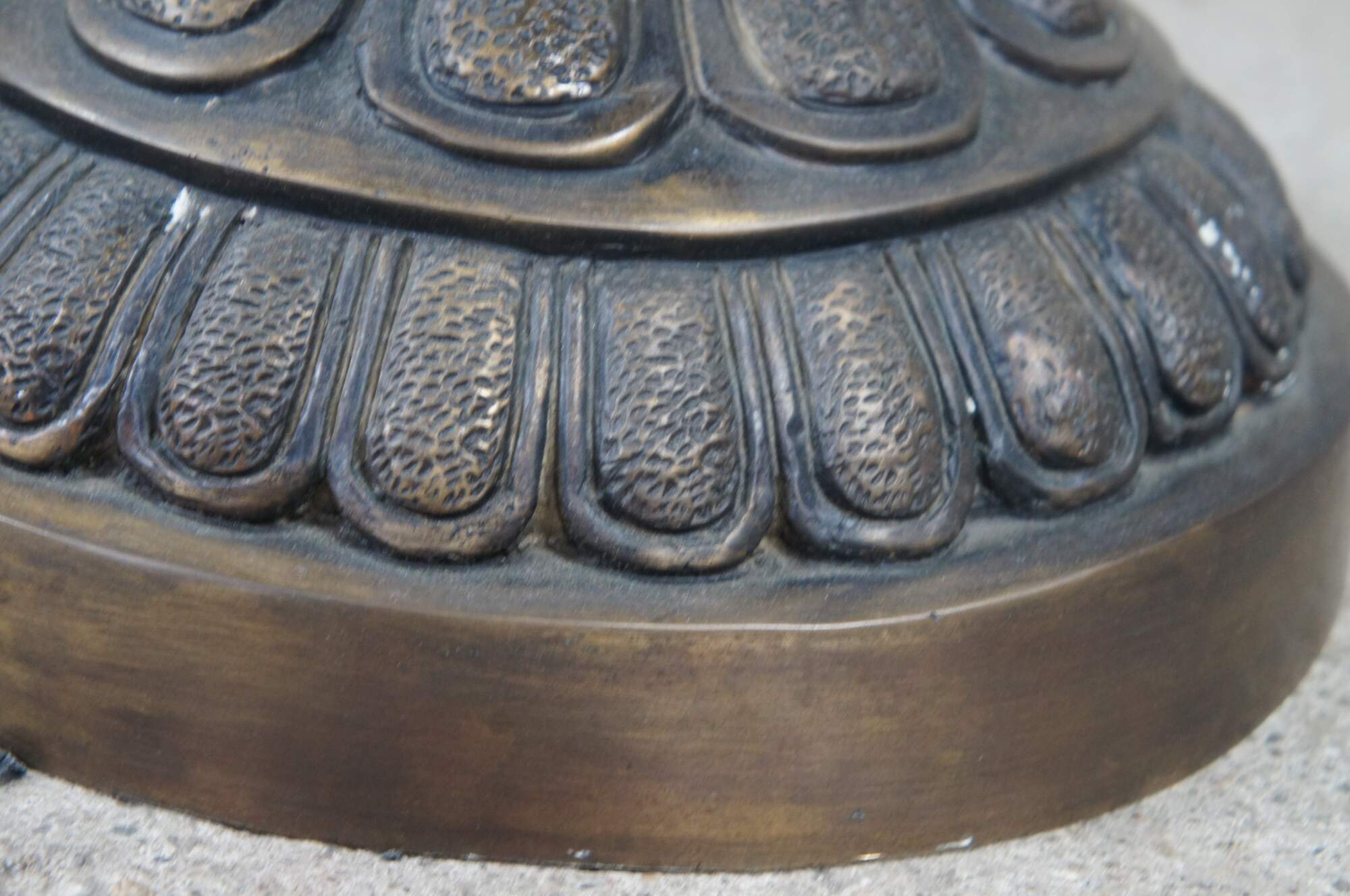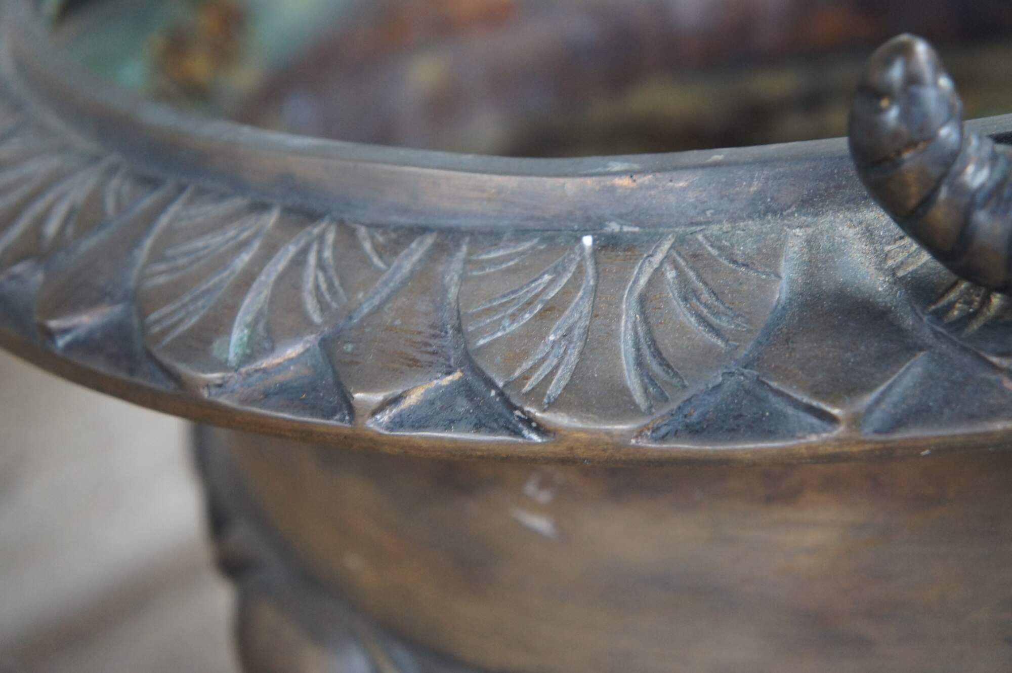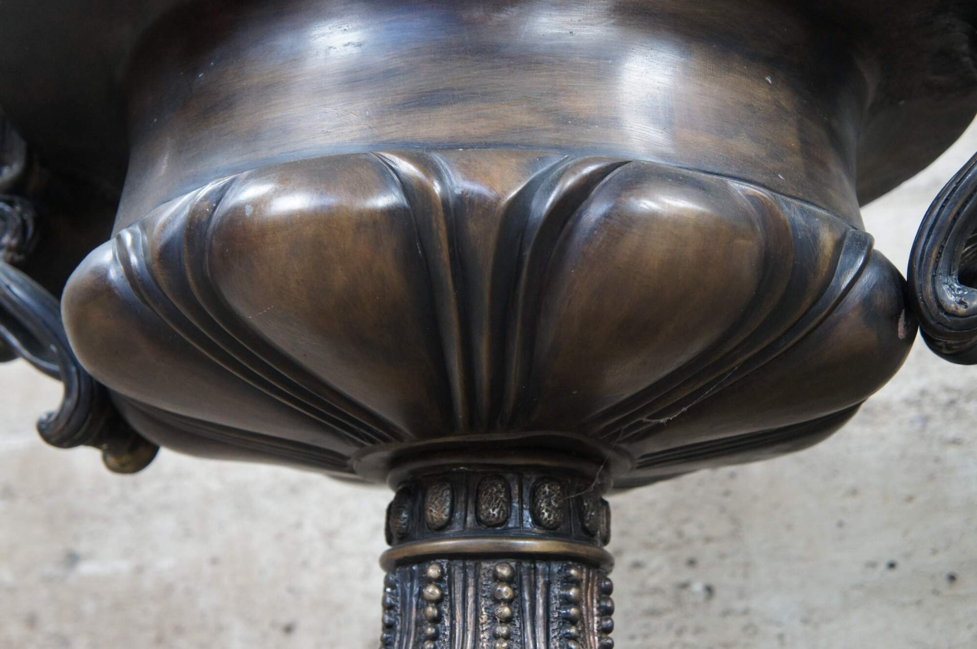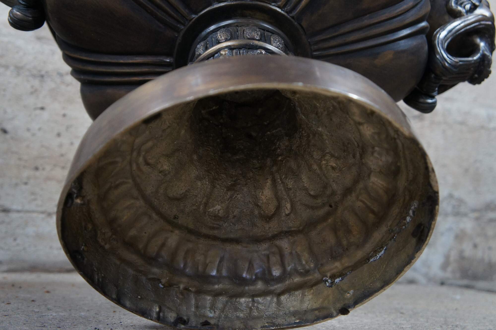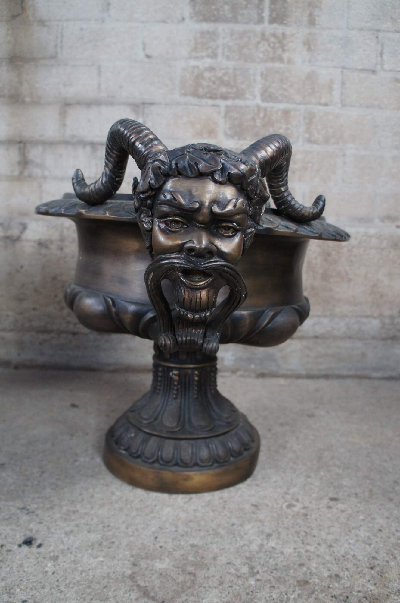 Exceptional set of footed bronze tazza urns. Features traditional Grecian form with gadrooned body and flared mouth with leaf trim. The urn is flanked on each side with magnificent figural Bacchus handles. He is poised with an open mouth, long goatee, serpentine ram horns and hair made from grape leaves.