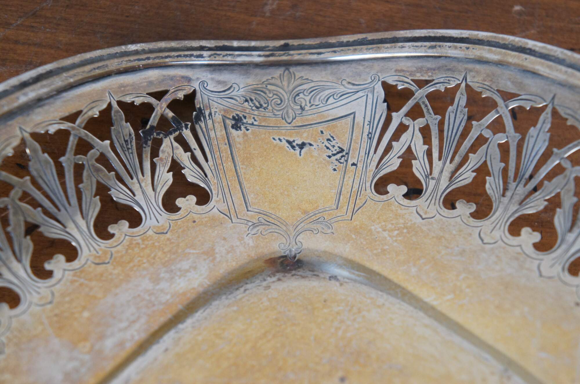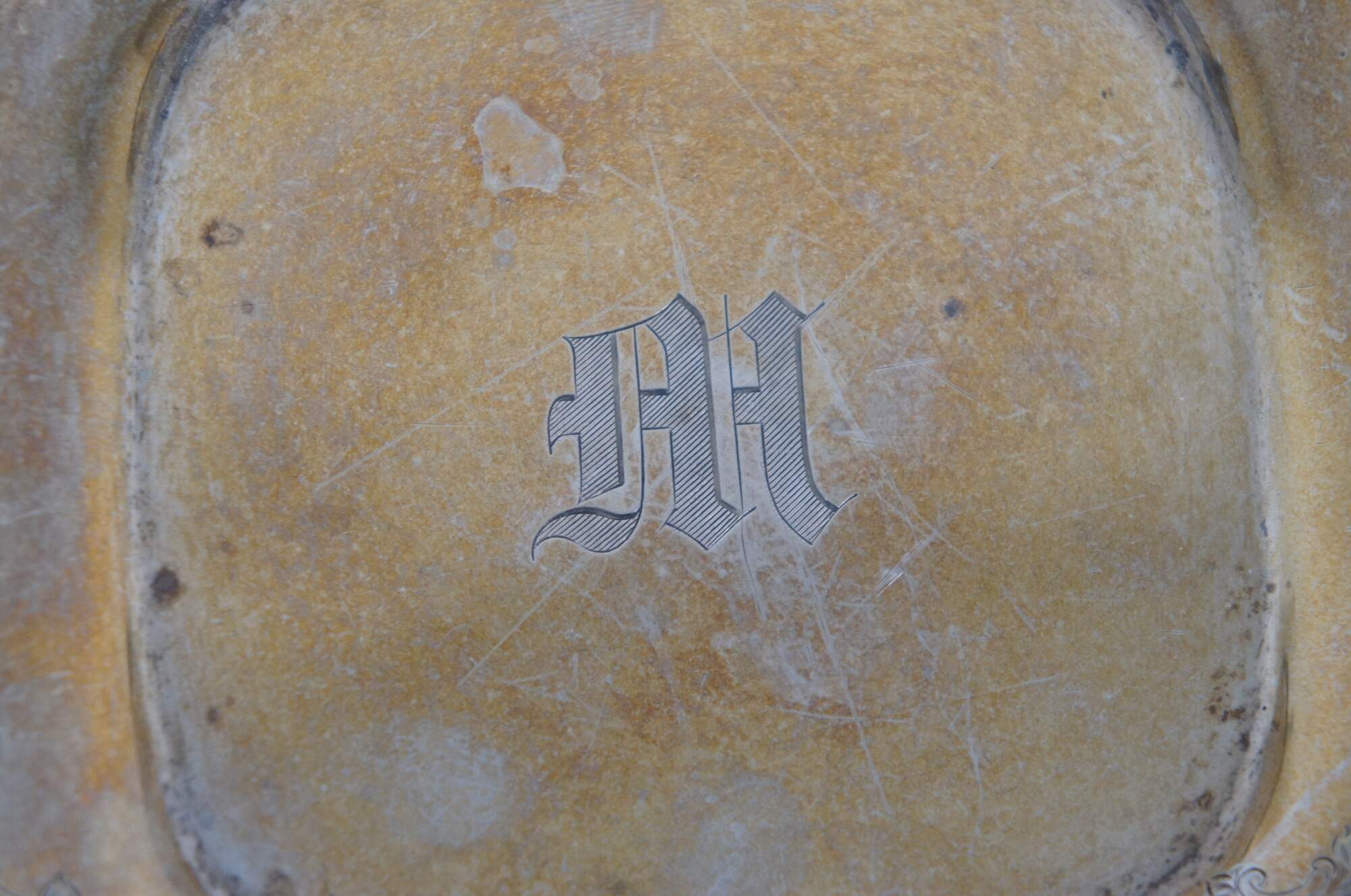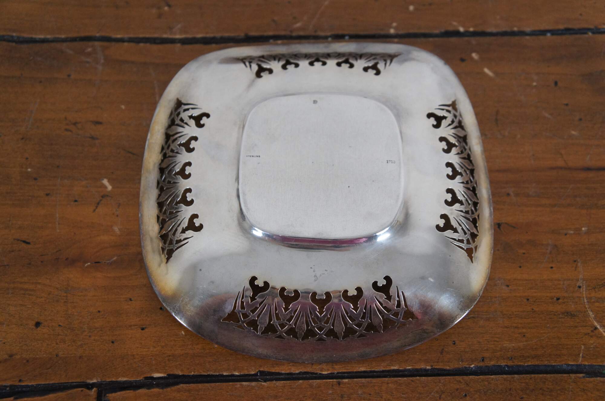 Late 19th to early 20th century sterling silver serving tray / dish, item number 1713, by James E. Blake & Company. Square serpentine shape with rounded corners and sides ruffled upward. Pierced leaf motif with etched foliate shields at the corners and engraved initial M at the center.