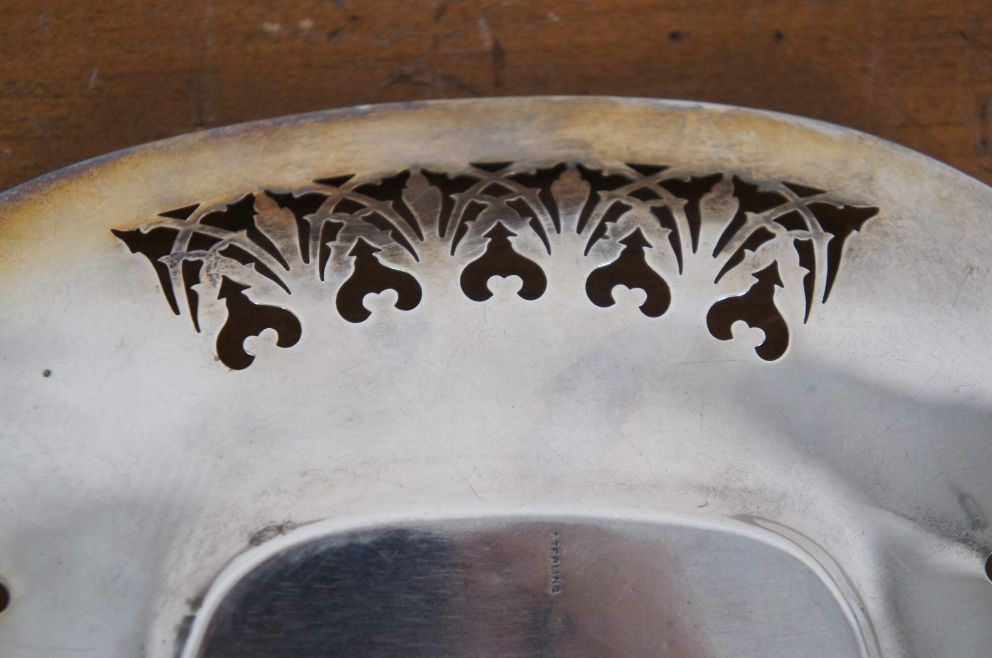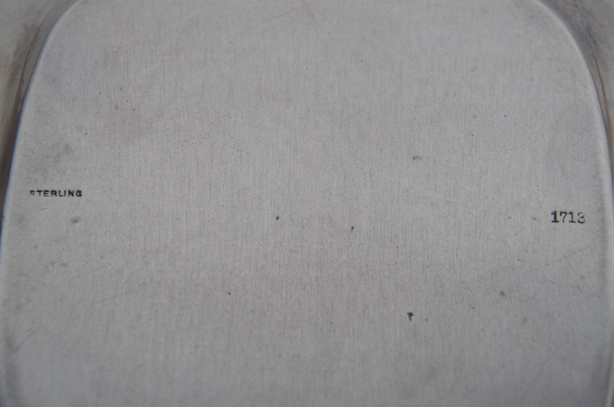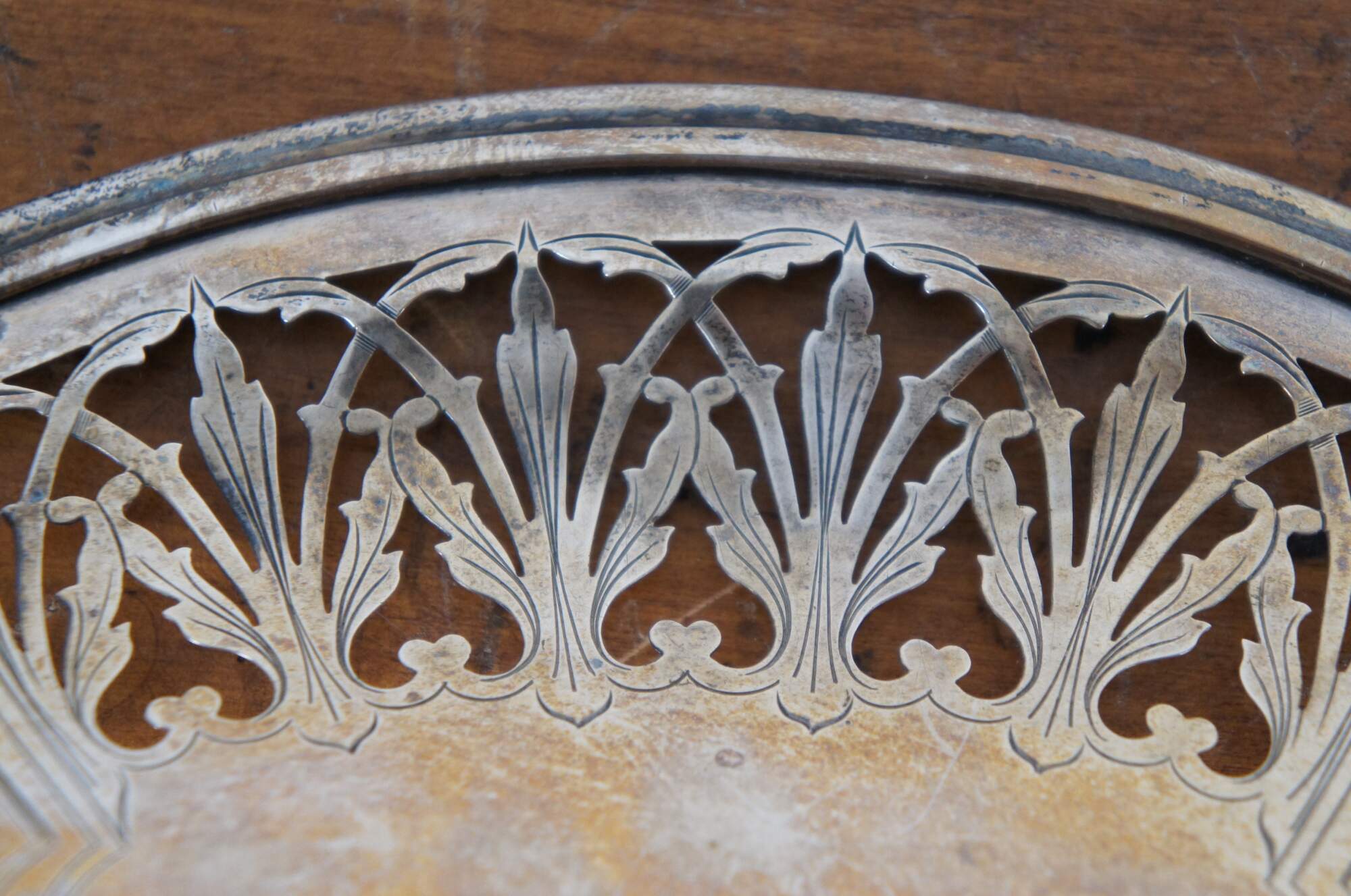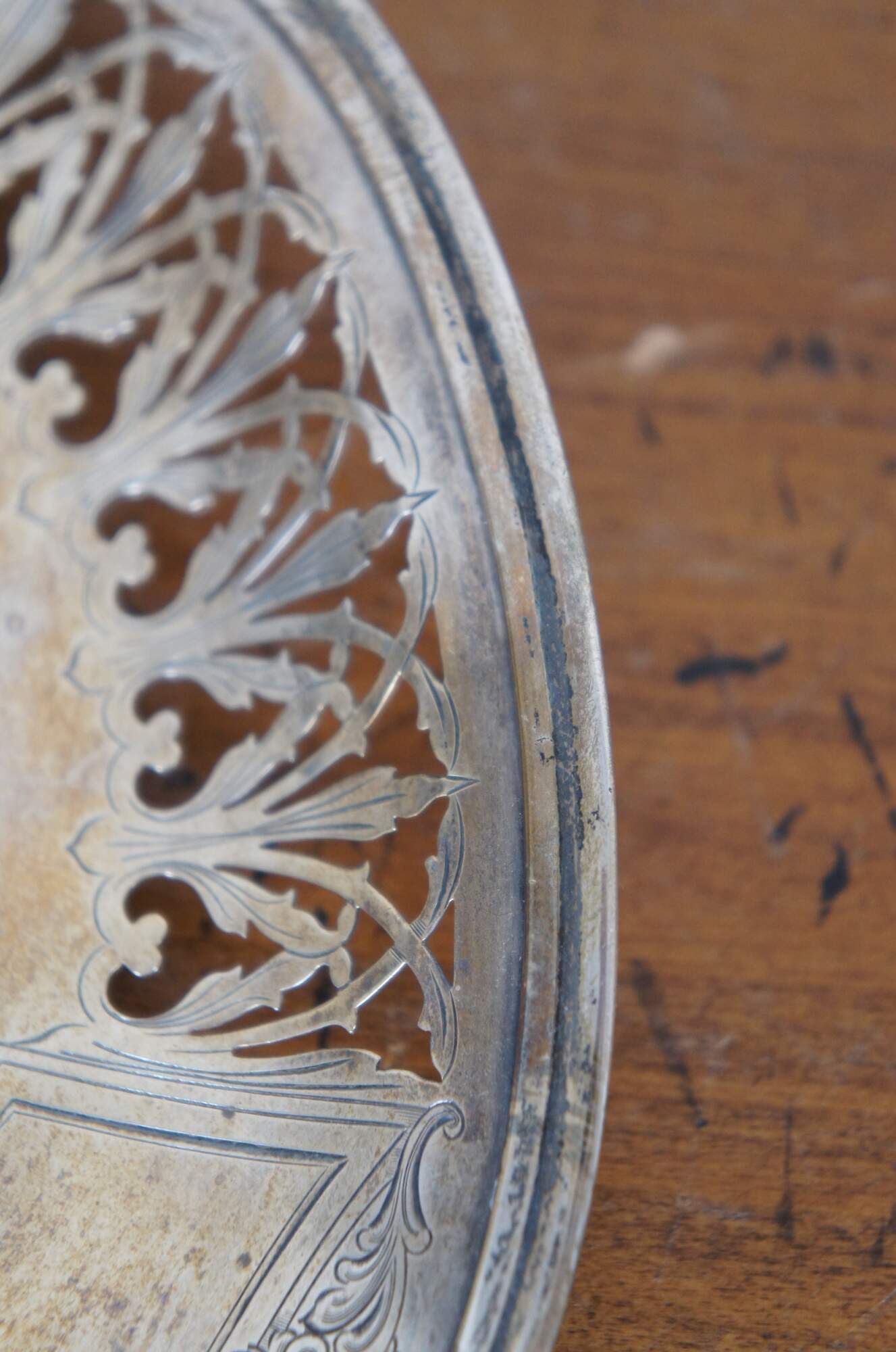 Late 19th to early 20th century sterling silver serving tray / dish, item number 1713, by James E. Blake & Company. Square serpentine shape with rounded corners and sides ruffled upward. Pierced leaf motif with etched foliate shields at the corners and engraved initial M at the center.