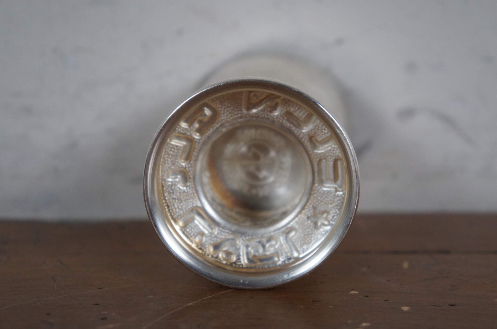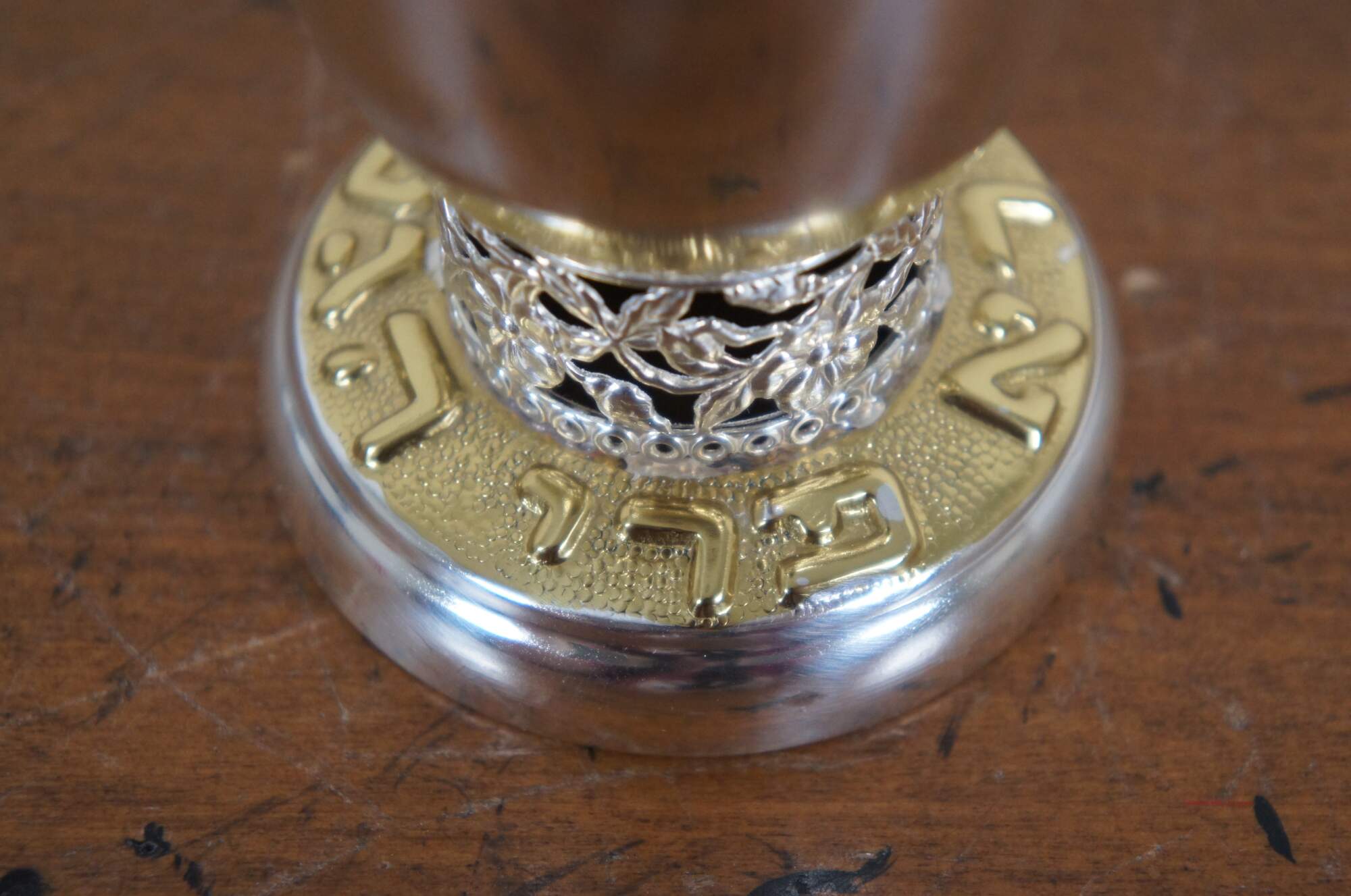 Late 20th century Oppenheim silver plate kiddush cup / goblet with pierced floral collar and band of gilt lettering around the base. Made in Israel.