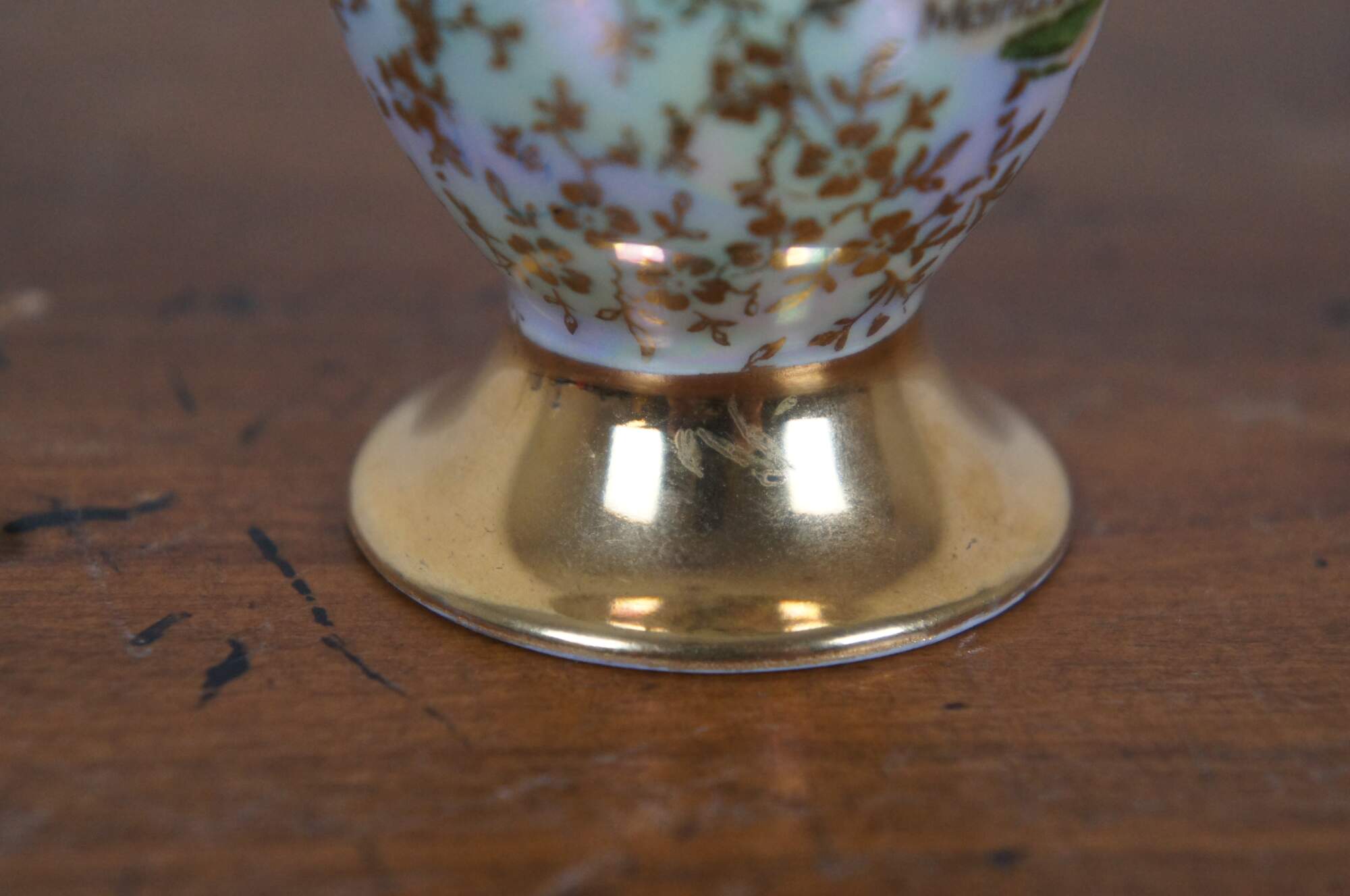 Circa mid 20th century souvenir bud vase - delicate pink and green iridescent finish under gilt flowers, surrounding and image of Basilica Mariä Geburt in Mariazell, Austria.
