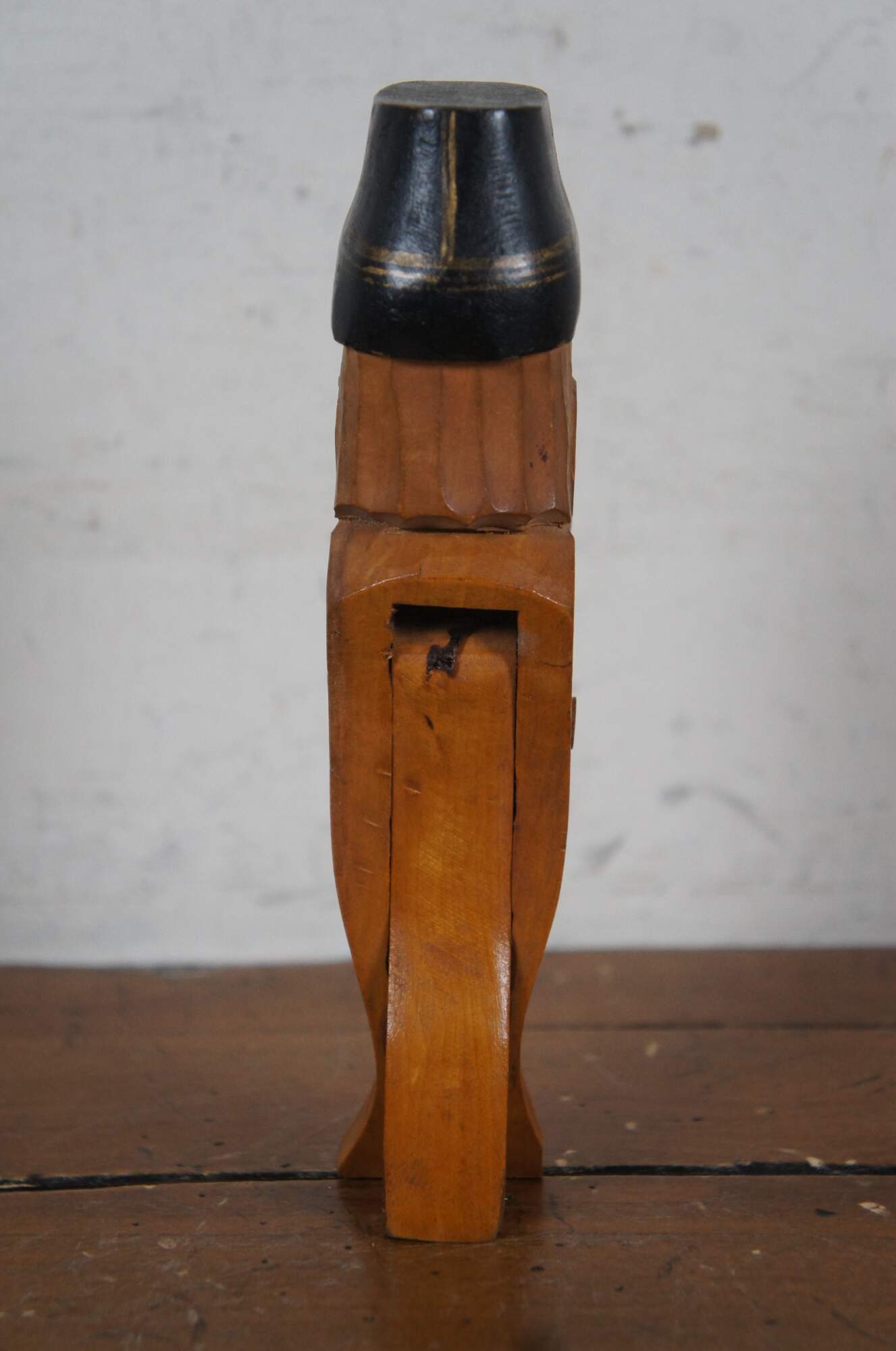 Antique Erik Molin (Swedish 1855-1933) hand carved birch nut cracker (Nötknäckare). Depicts an elderly man with moustache and monacle / eyepatch, wearing a double breasted coat and military style cap. The base of his torso terminates in a fish tail.