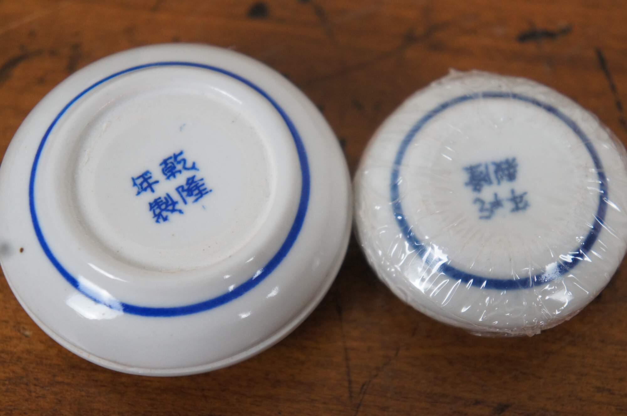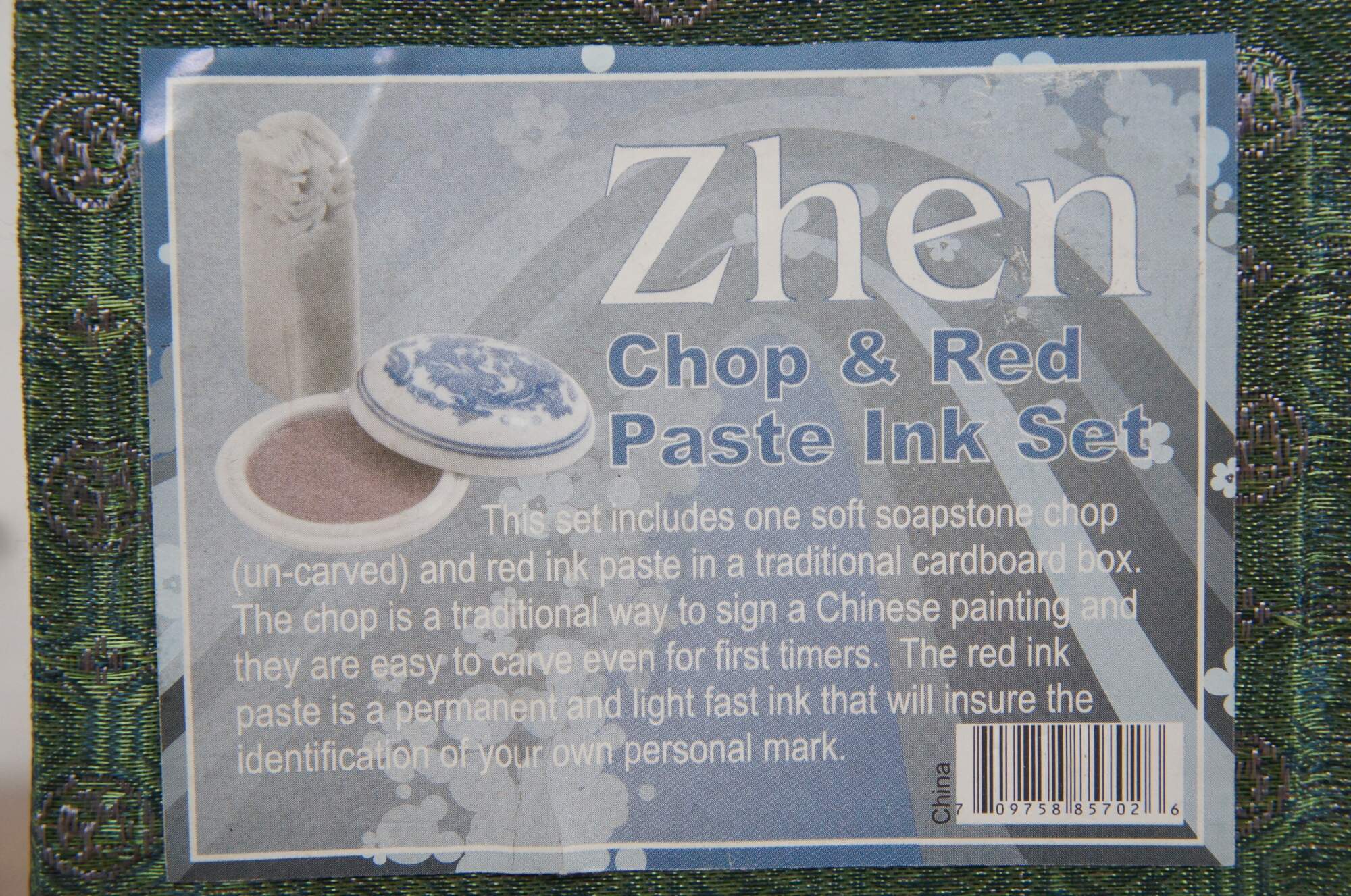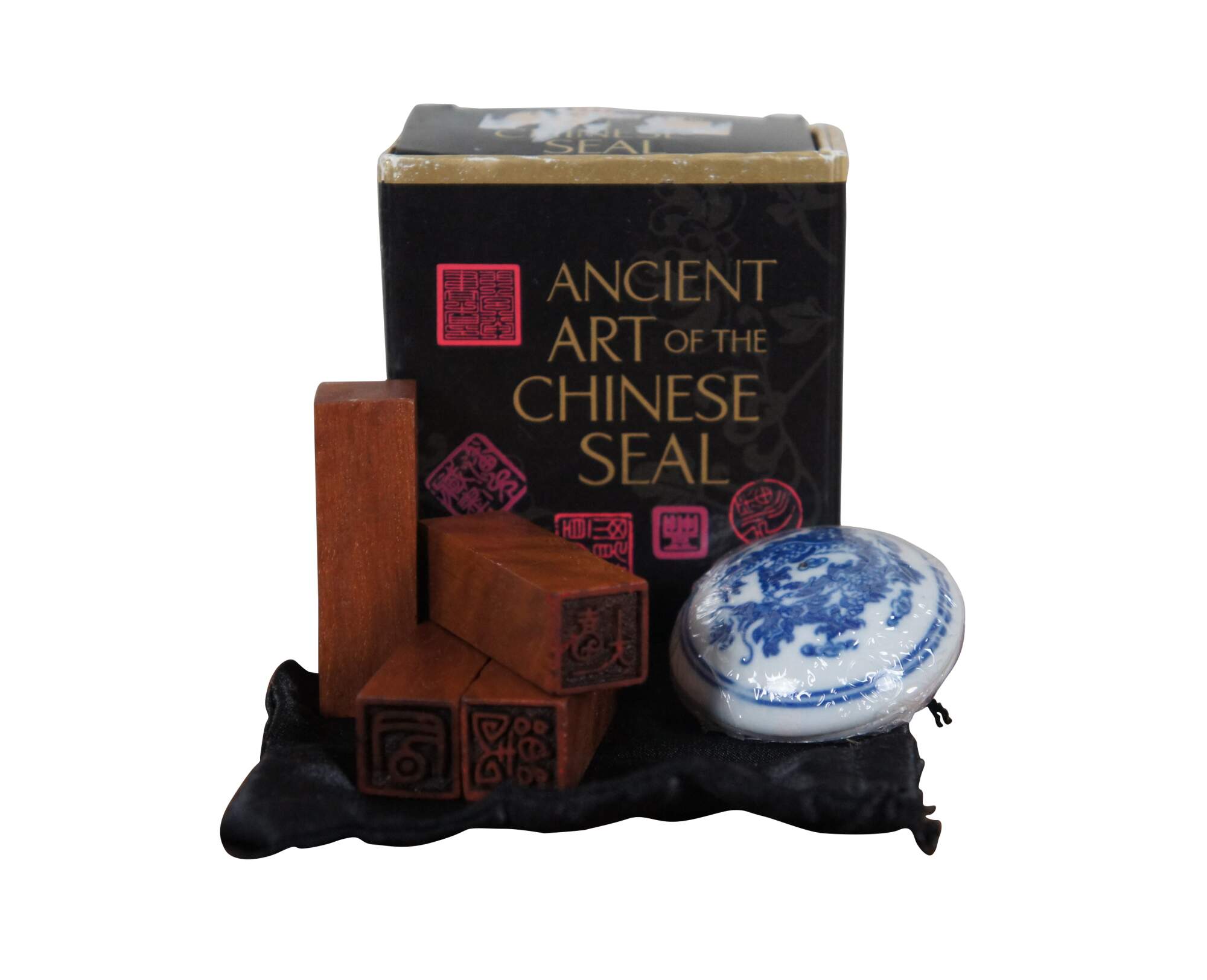 Pair of late 20th century miniature gift sets. Zhen Chop & Red Paste Ink Set - includes storage box, blue and white porcelain dish of red seal paste and soapstone seal, carved with initials PK by previous owner (can possibly be re-carved). And Ancient Art of the Chinese Seal - includes satin bag, sealed blue and white porcelain jar of red paste, and four wooden seals, carved with symbols representing Prosperity, Joy, Peace, and Good Luck.