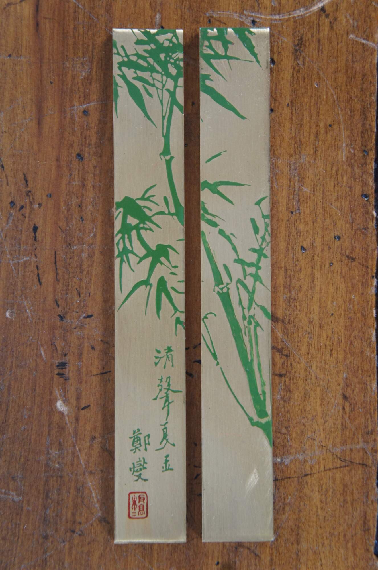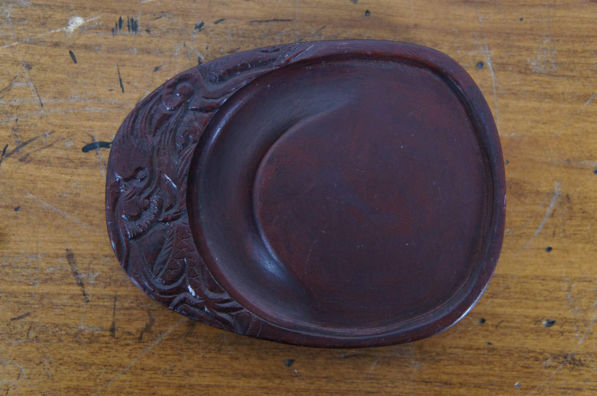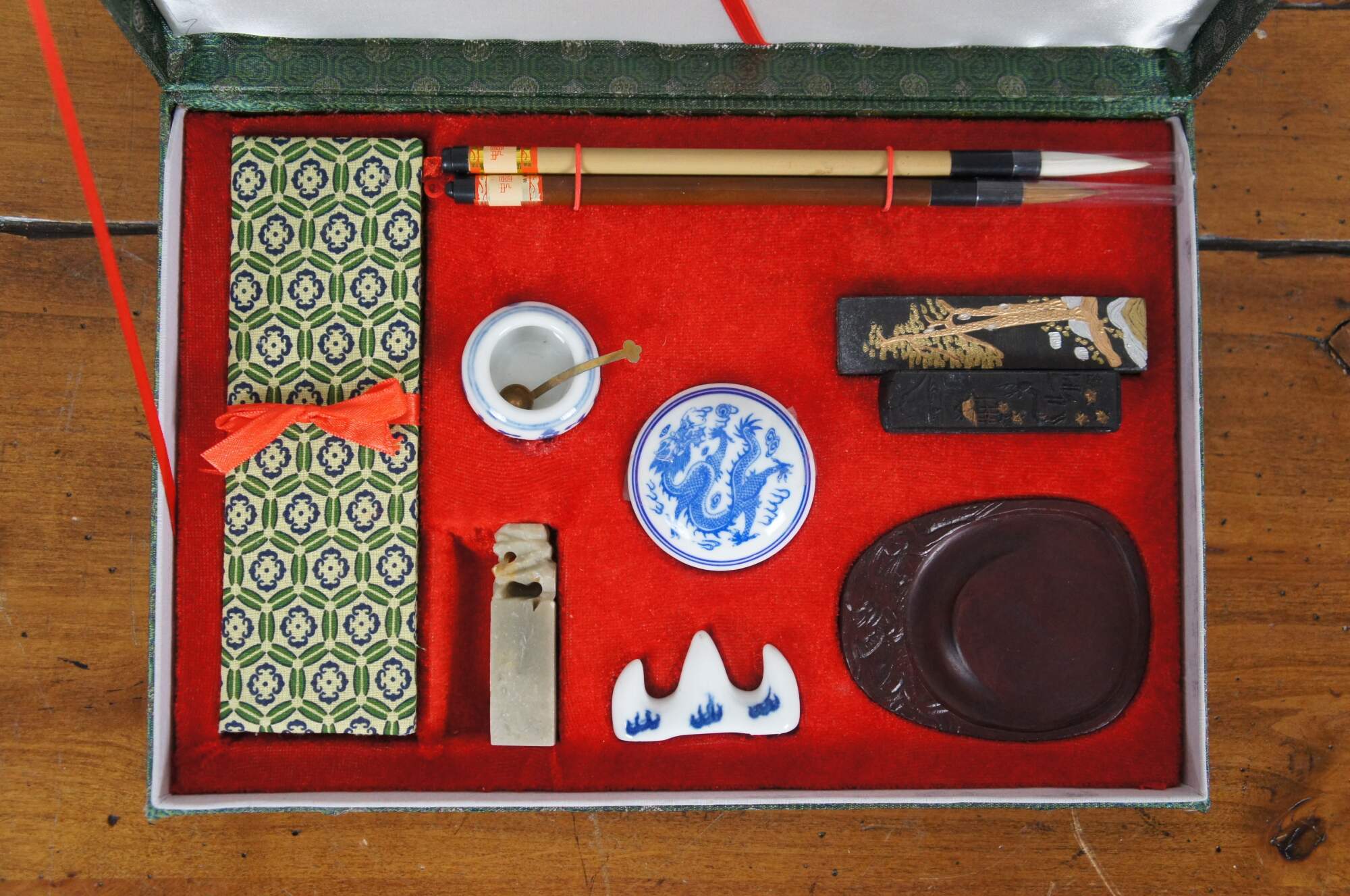 Late 20th century Chinese calligraphy / writing set. Includes: storage box, two brass paperwights, two brushes, brush rest, blue and white dragon jar of red seal paste, gray guardian lion soapstone seal (un-carved/plain), brown dragon carved inkstone, two inksticks, blue and white water dish and tiny brass spoon. One inkblock appears partially used and likely came from another set.