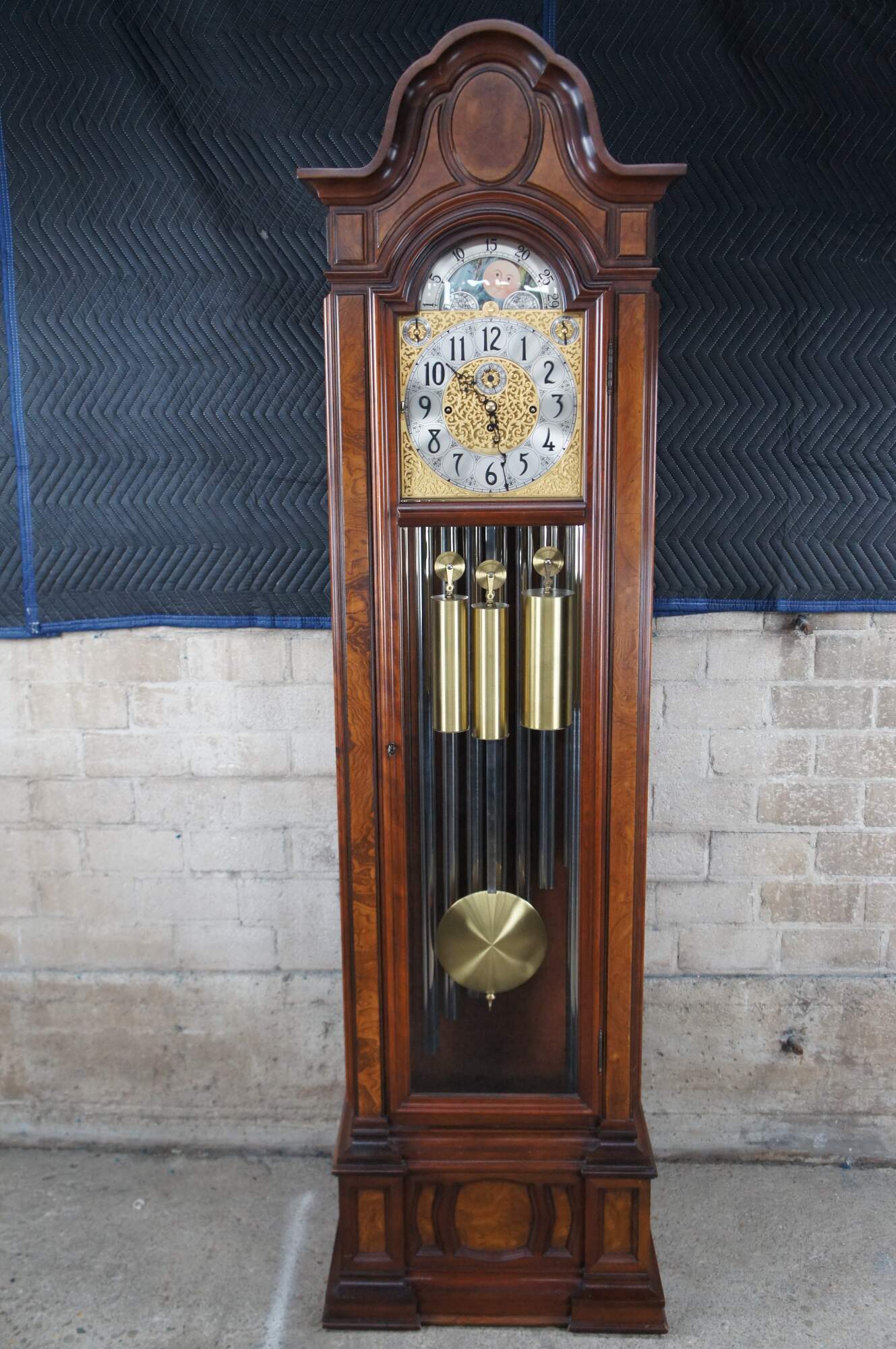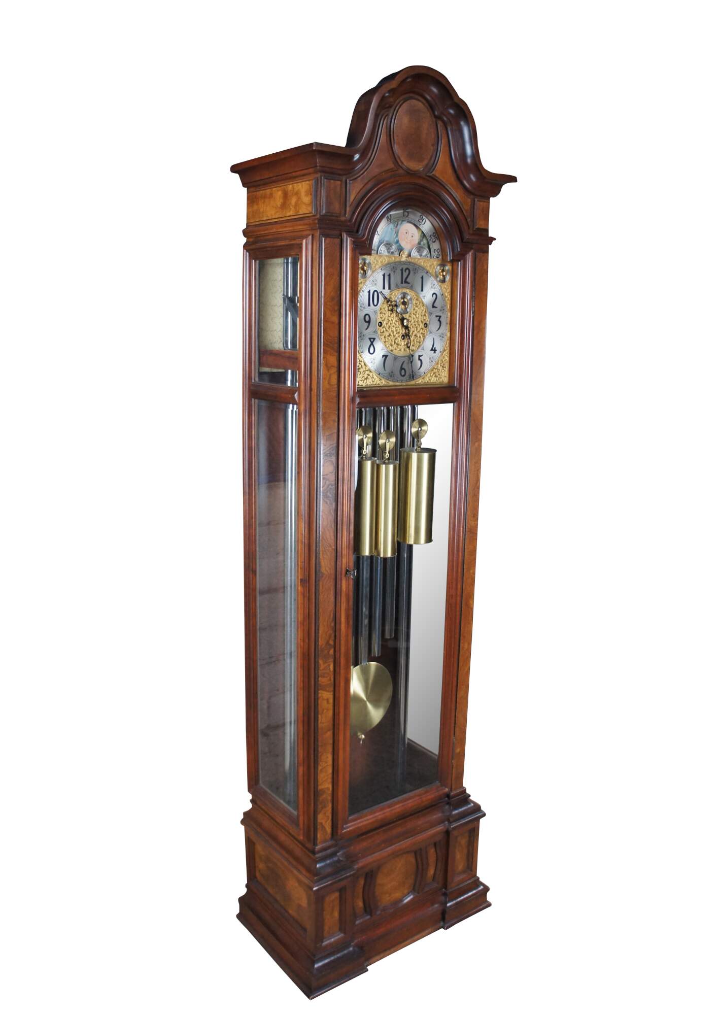Vintage 1976 Herschede Hall Clock Company tall case grandfather clock, model 230 aka The Sheffield. Made of cherry featuring serpentine crown with ash burl panels and reticulated 14k gold plated sun and moon face. Plays / Chimes Whittington, Westminster and Canterbury.
