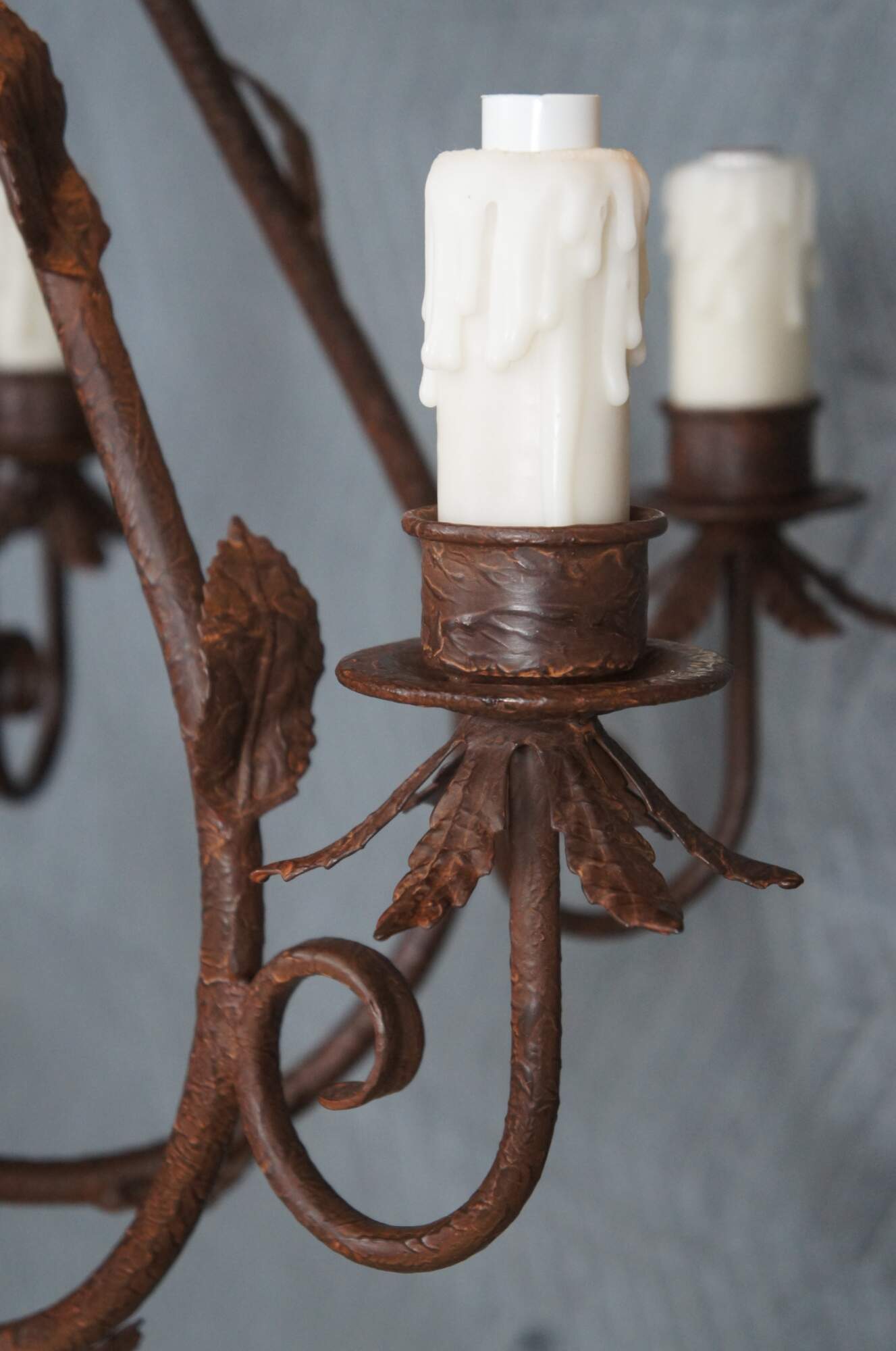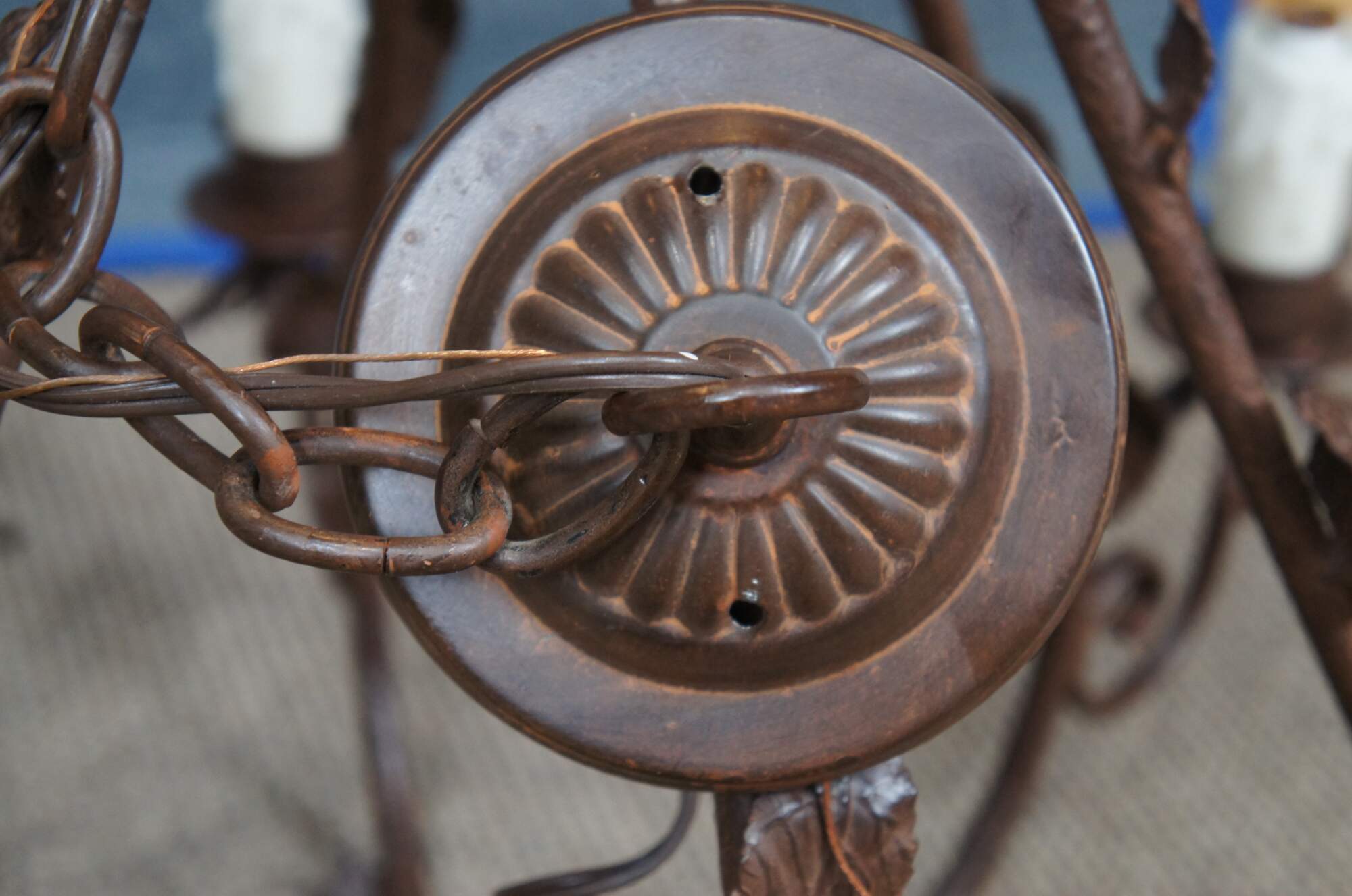 Late 20th century scrolled iron 6 arm chandelier by Dana Creath Designs. Cage like shape of six scrolling arms decorated with acnthus leaves, terminating in wax faux candles. Rough bronze finish. Includes white fabric shades. Hard wired.