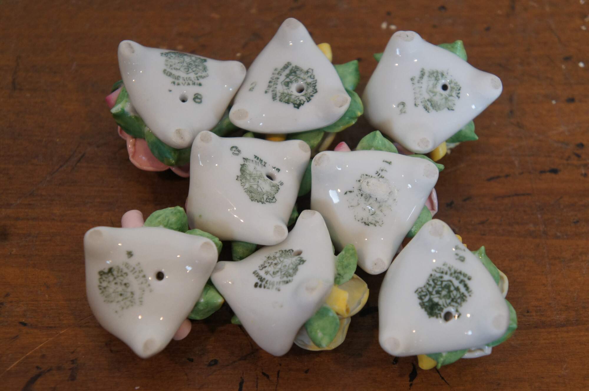 Set of 8 porcelain place card holders by Gerold and Co, in shape of pink and yellow roses on small white stands.