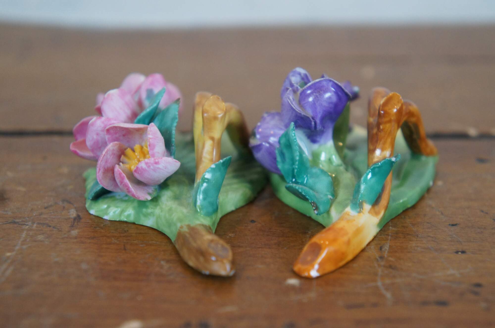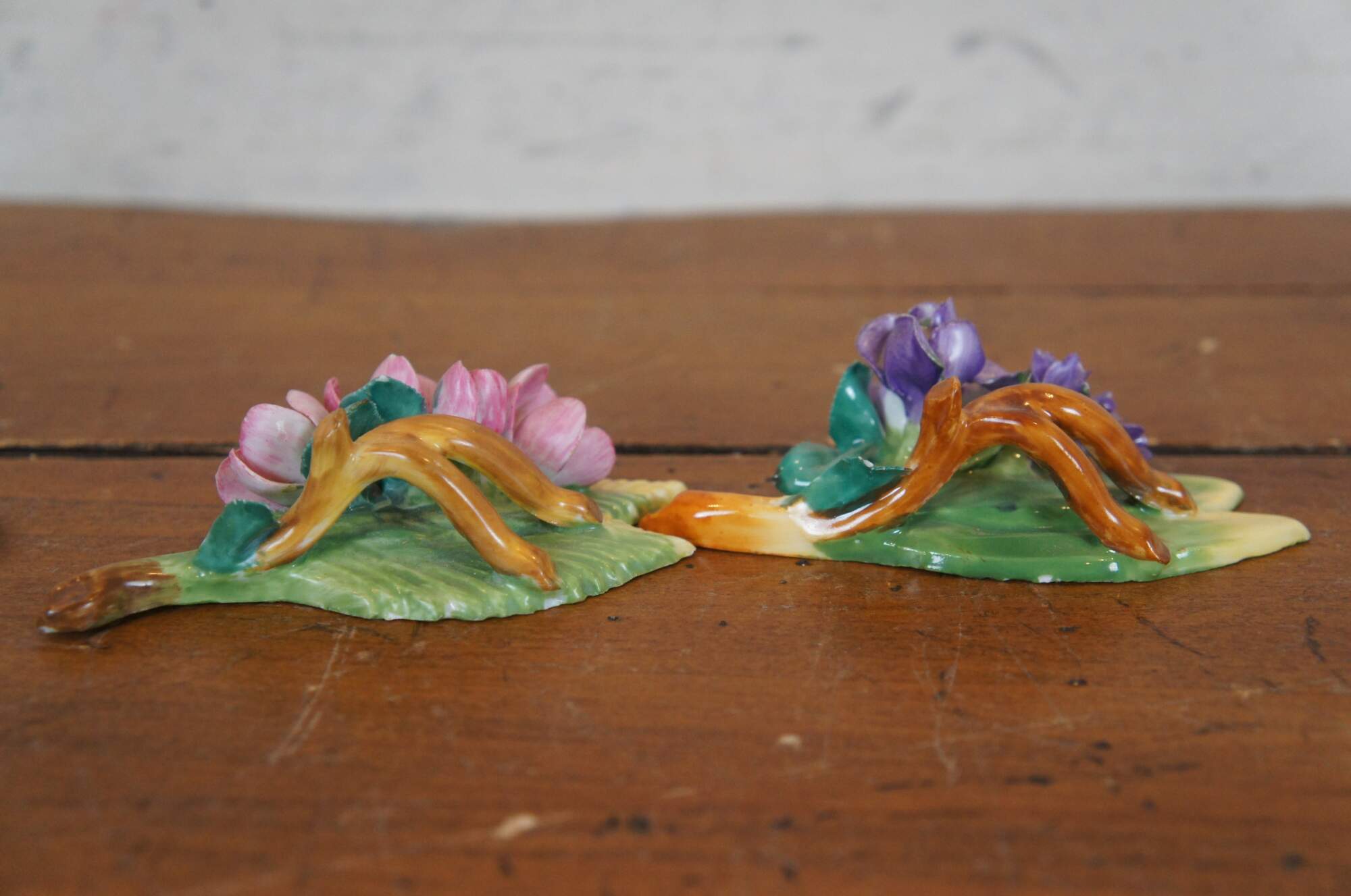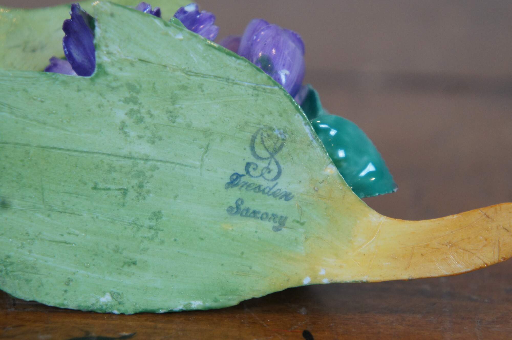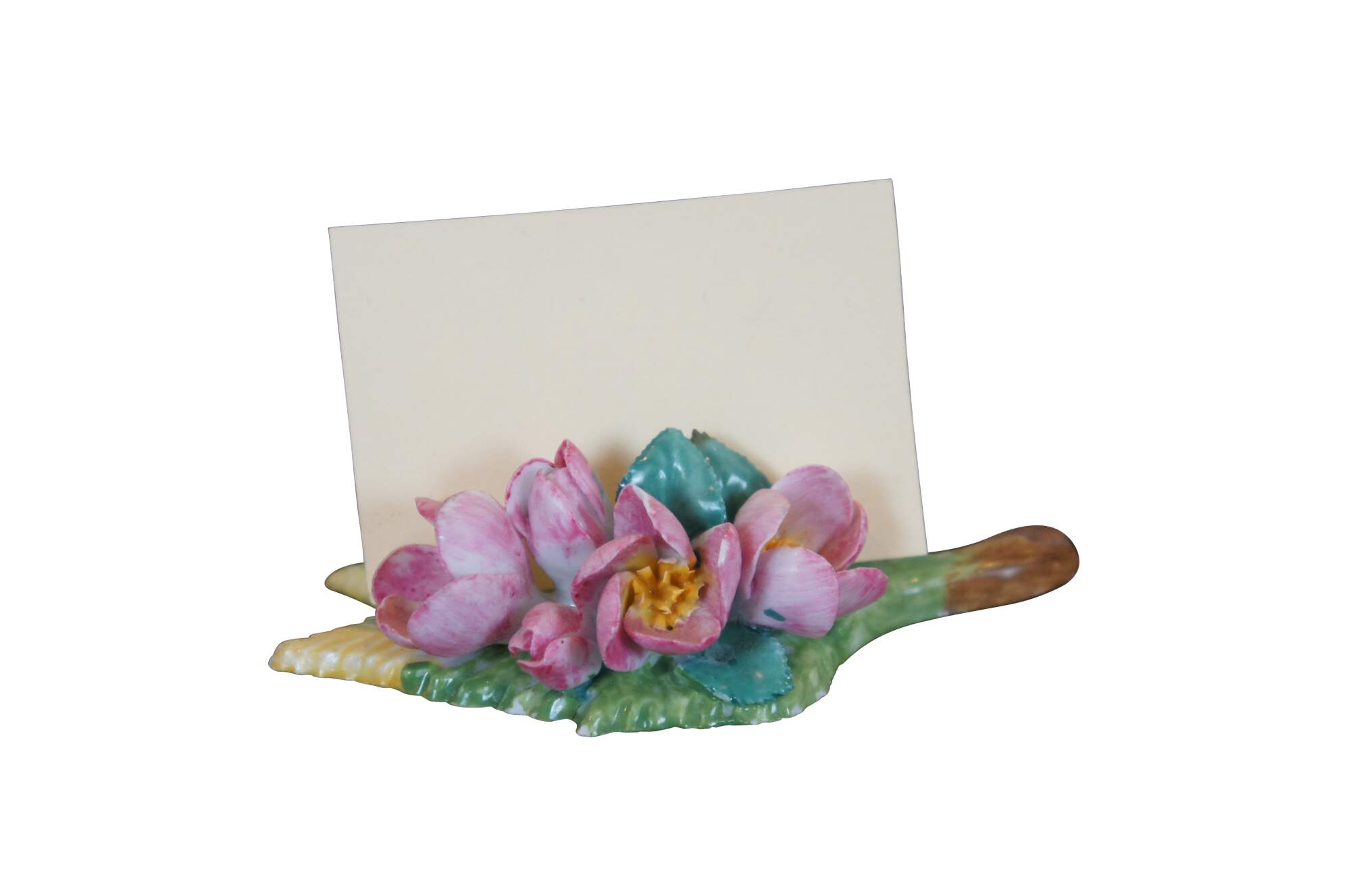 Pair of vintage 20th century Dresden Porcelain place card holders in the shape of flowers on a leaf.
