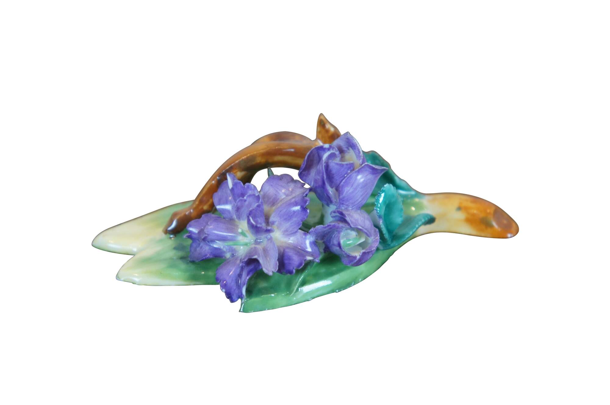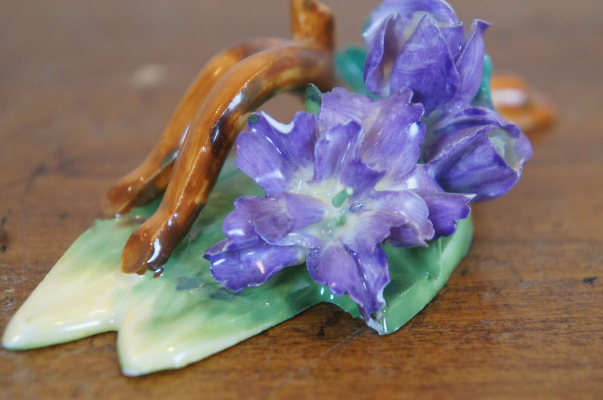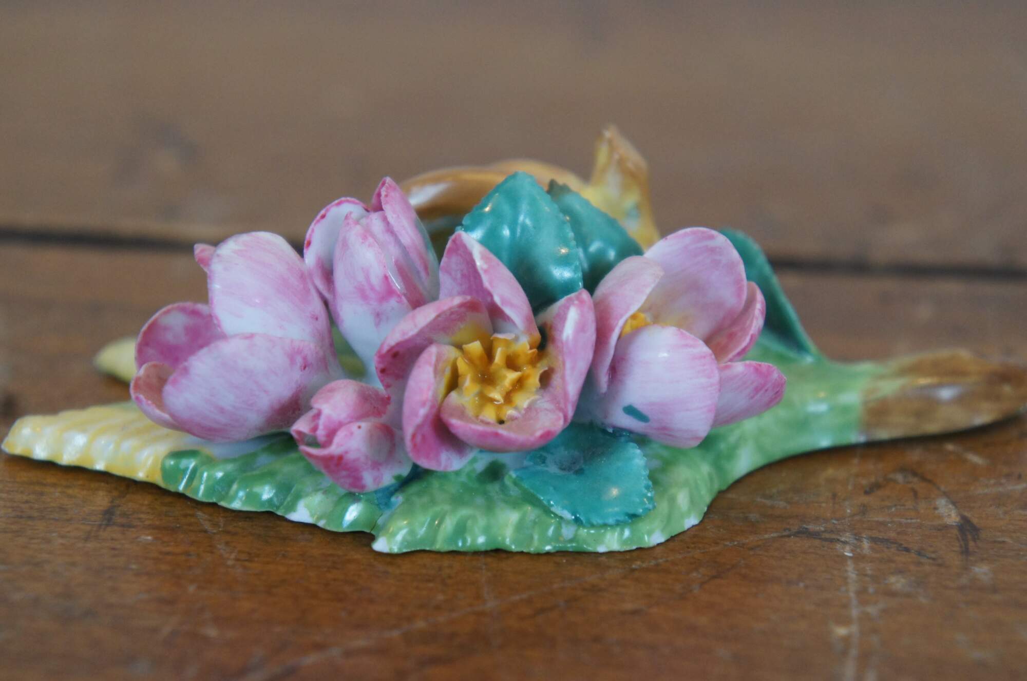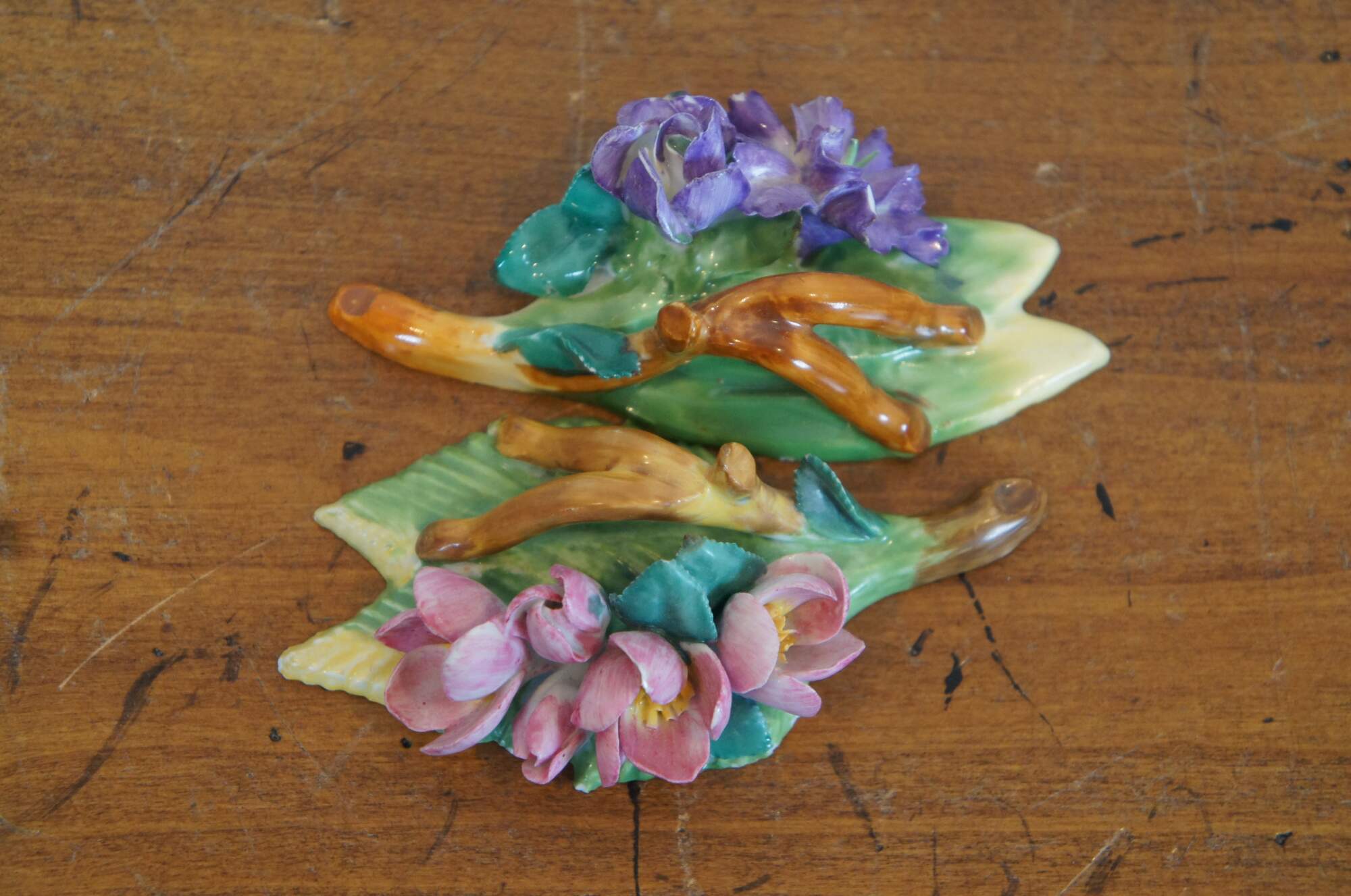 Pair of vintage 20th century Dresden Porcelain place card holders in the shape of flowers on a leaf.