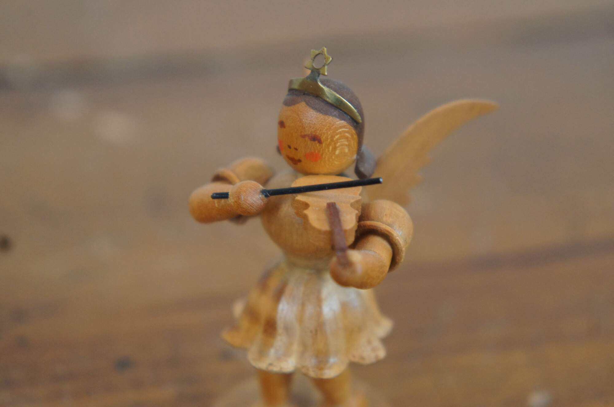 Set of 3 circa mid 20th century miniature wooden angel figurines. Hand crafted from unfinished wood with painted faces and hair, topped with brass star crowns, these angels are part of a larger orchestra, playing harp, guitar, and violin. Likely made in Erzgebirge, Germany.