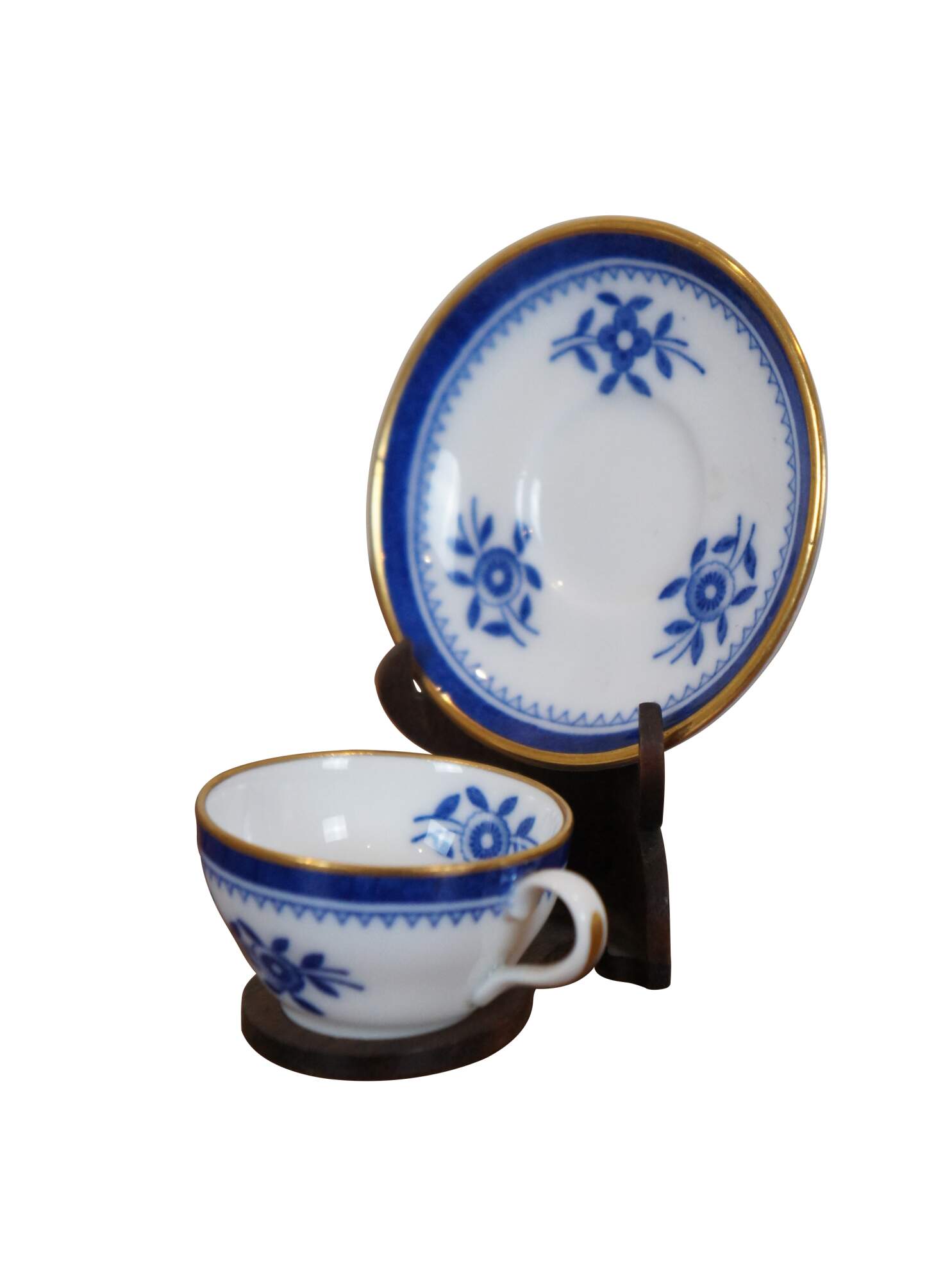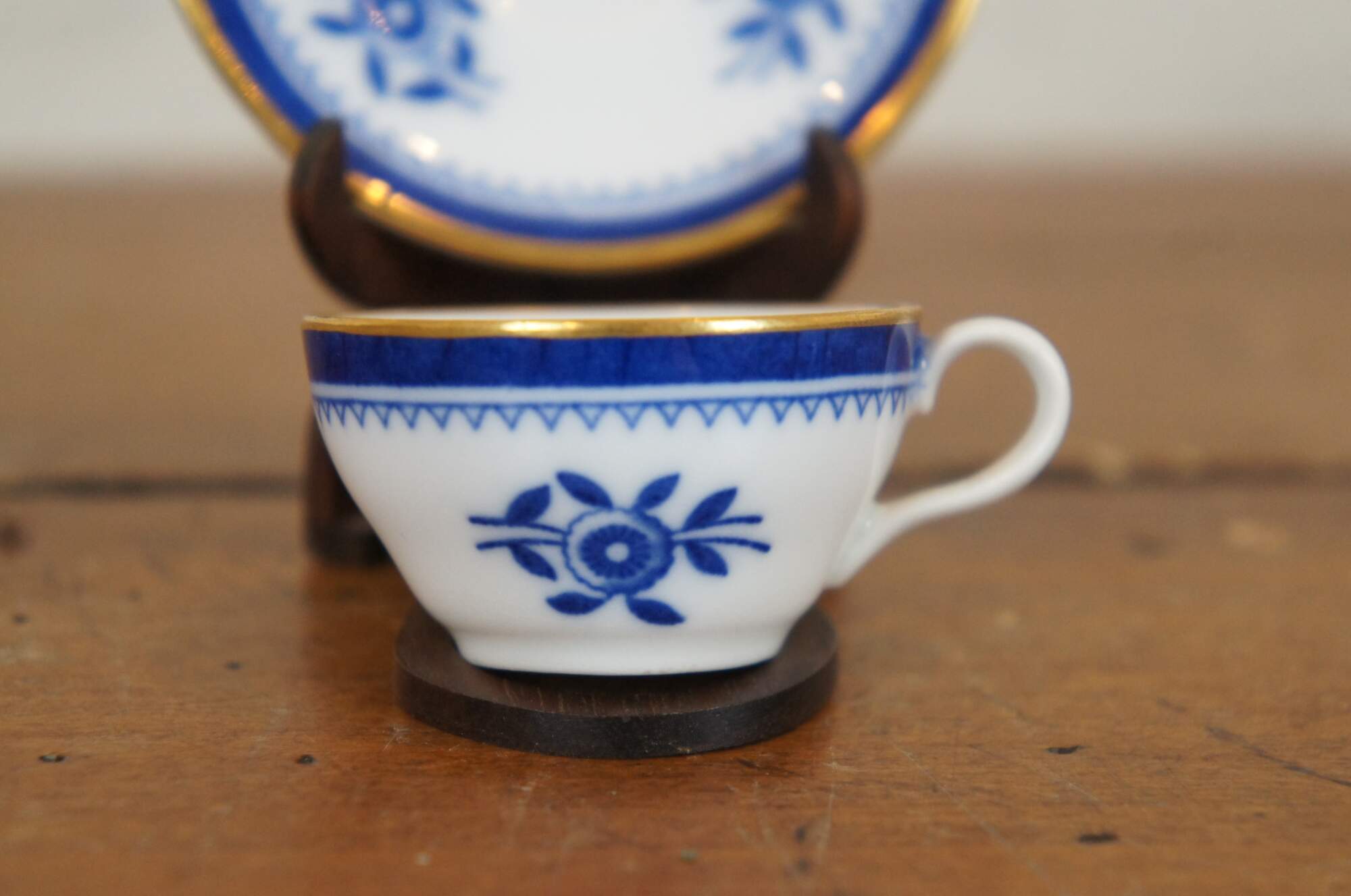 Vintage Copeland's Spode miniature teacup and saucer, marked 13 and Y6135, possibly a variation of the Gloucester pattern. Features a simple design of folk art style flowers and sawtooth blue border, with gilded accents. Includes wooden display stand.