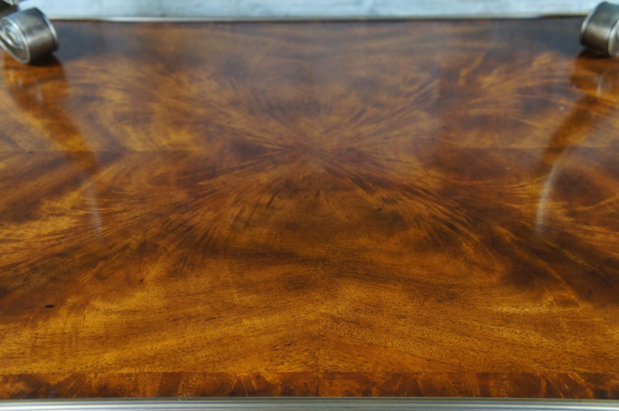 Late 20th century Louis XVI table by Theodore Alexander. Part of their Replica Collection. The original dating to 1780. A two tier crotch mahogany frame with drawer, the pierced brass galleried tier on leaf vast brass scroll supports trailing to the larger top with intricately cast brass swag and ribbon tied mounted frieze, on turned, fluted and tapering legs terminating in brass capping's and ball feet.