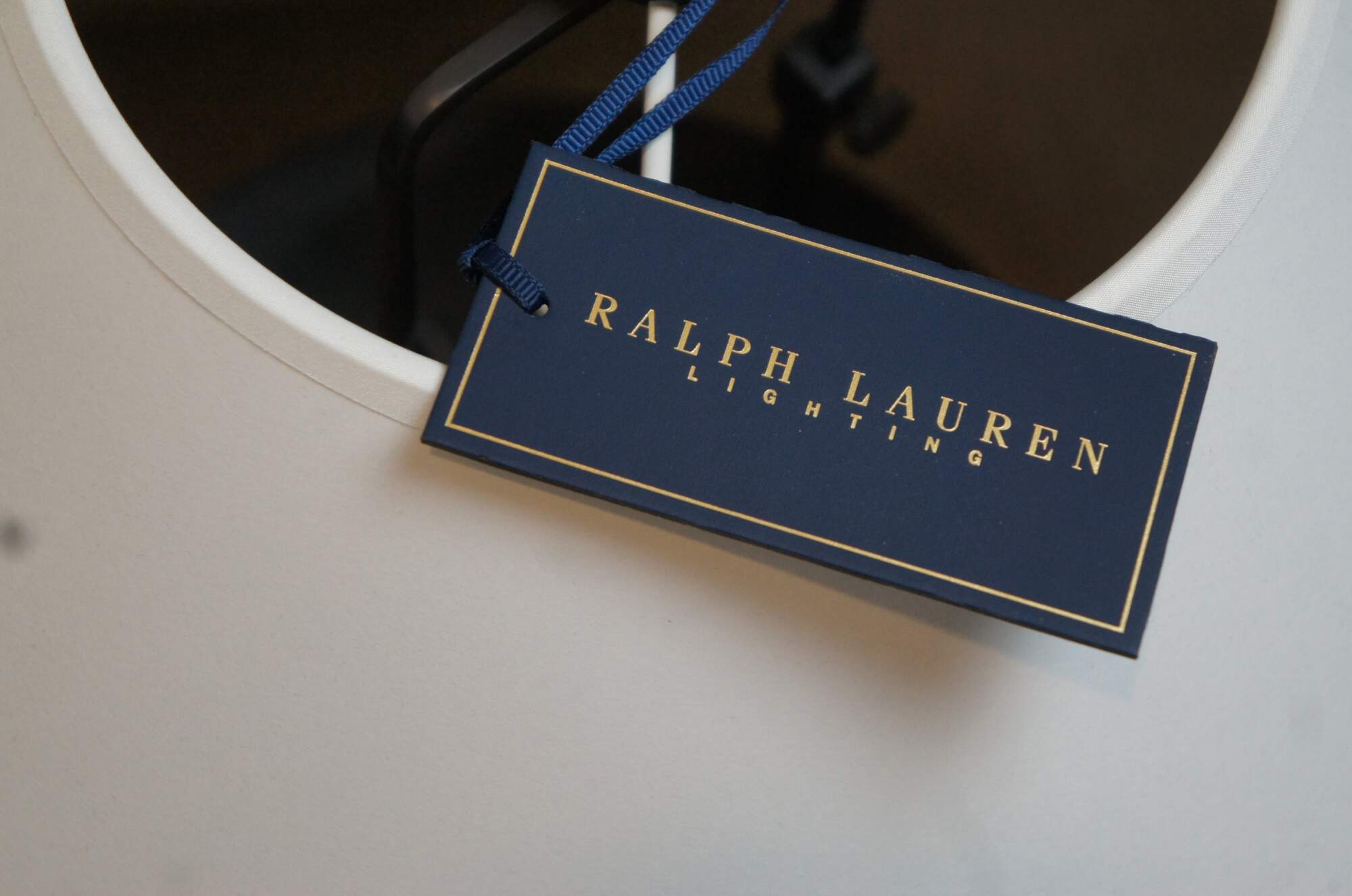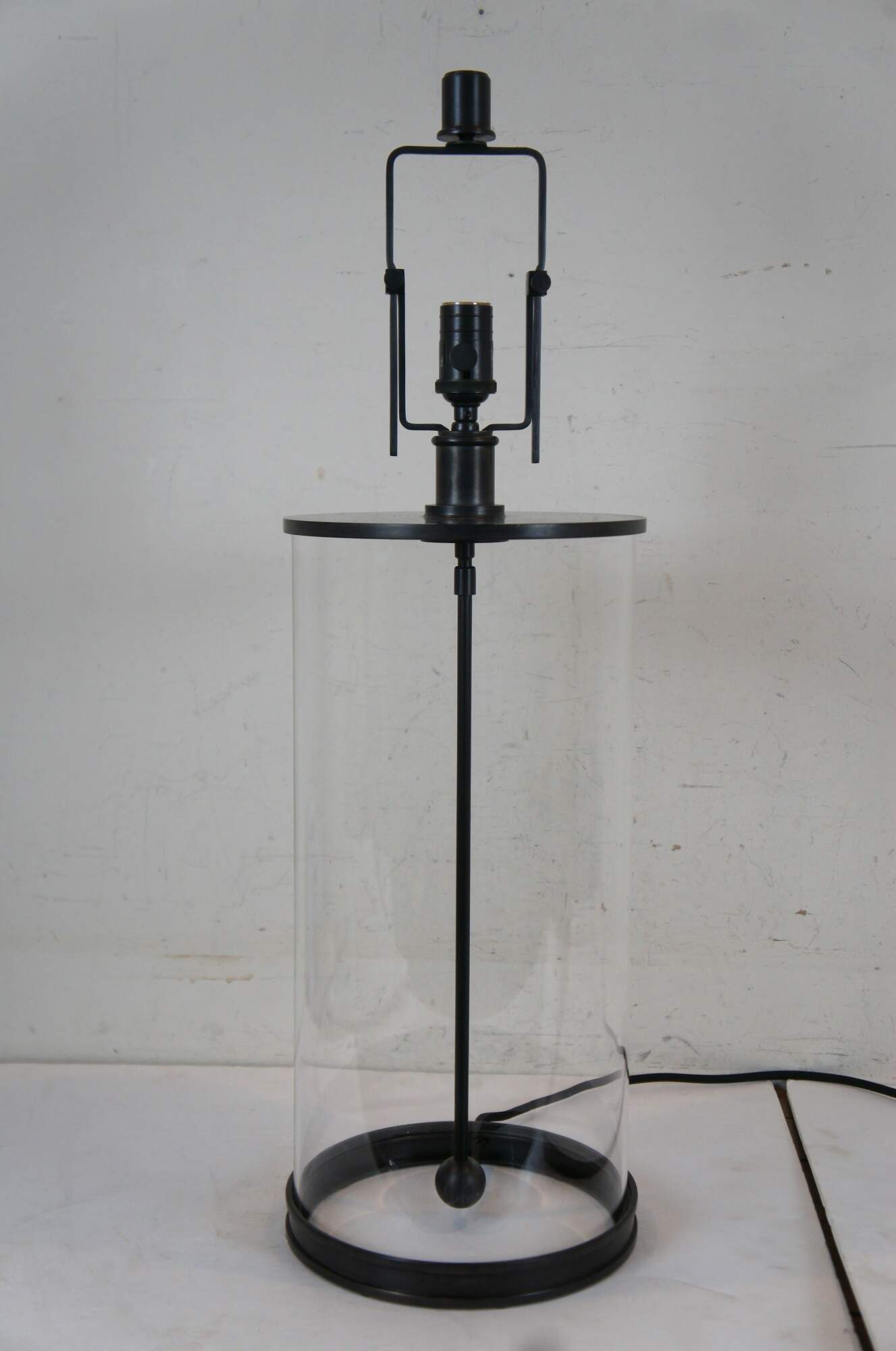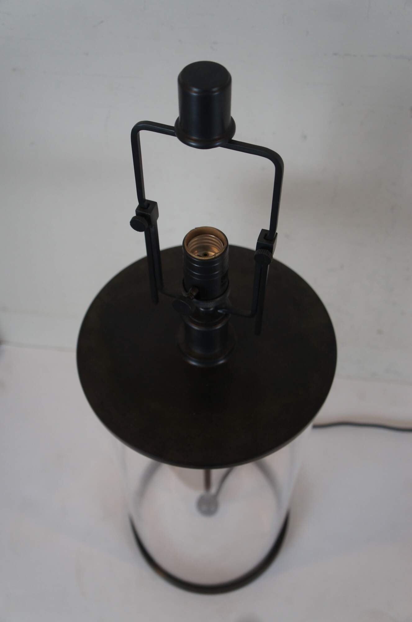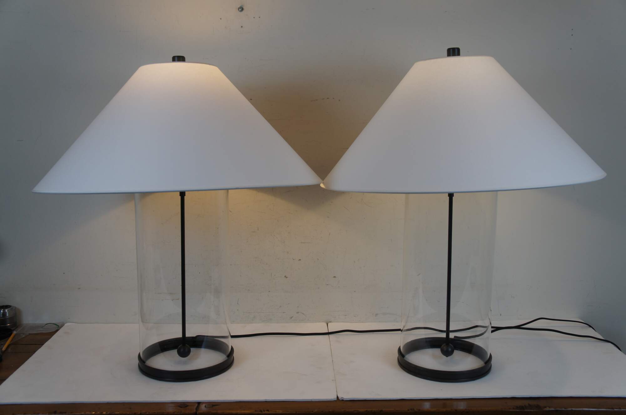 Pair of Ralph Lauren Lighting Modern Table Lamps. The minimalist design features a glass cylinder accented with Bronze finished metal rims and pendulum shaped cord cover suspended inside. Includes cylindrical finials and white paper shades. Height of the fixed harp is adjustable. Model No: LB4638. SKU: RL11167BZ. Made in China. MSRP: $1280