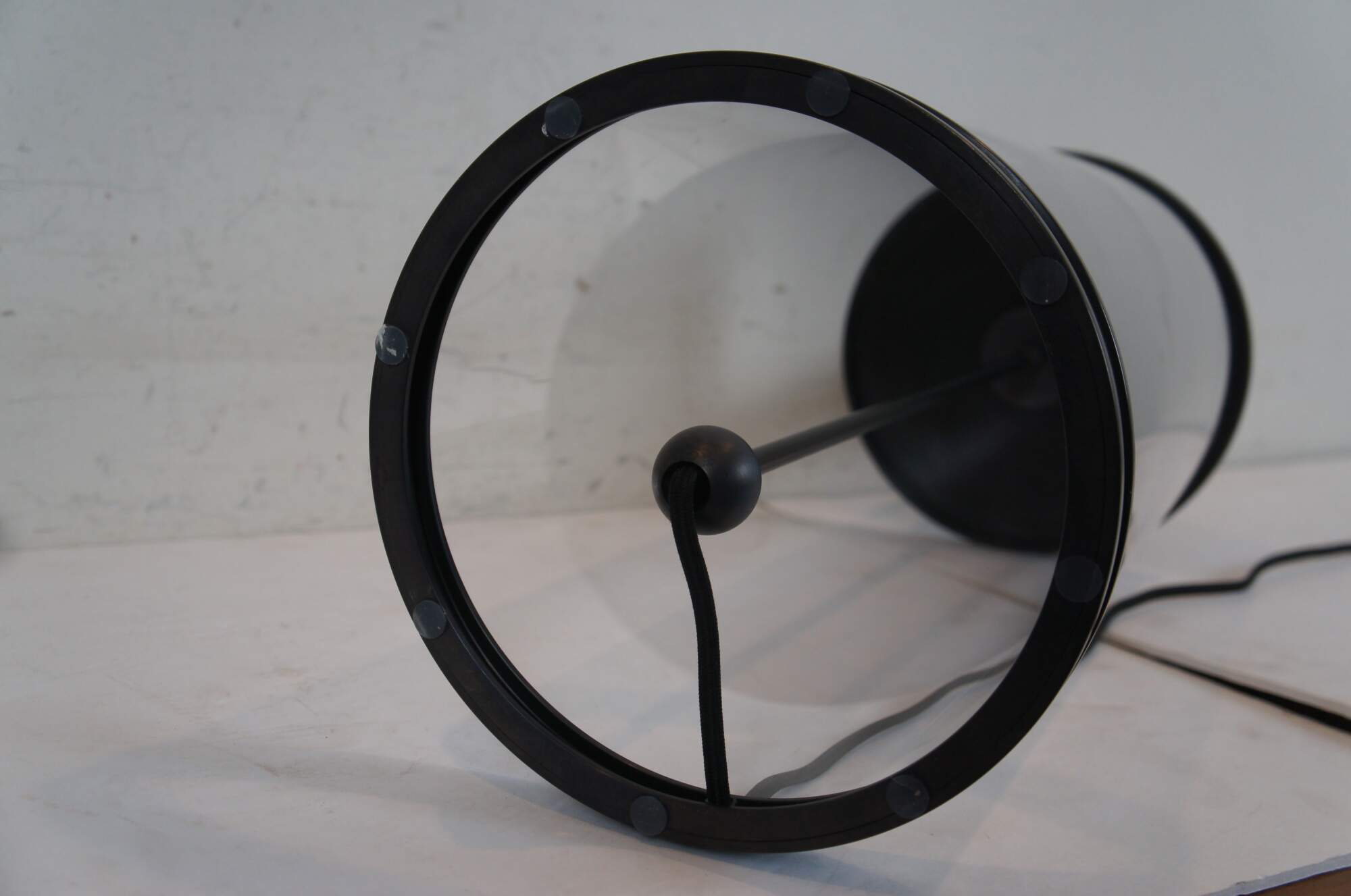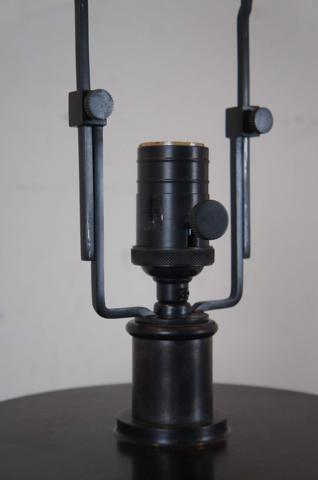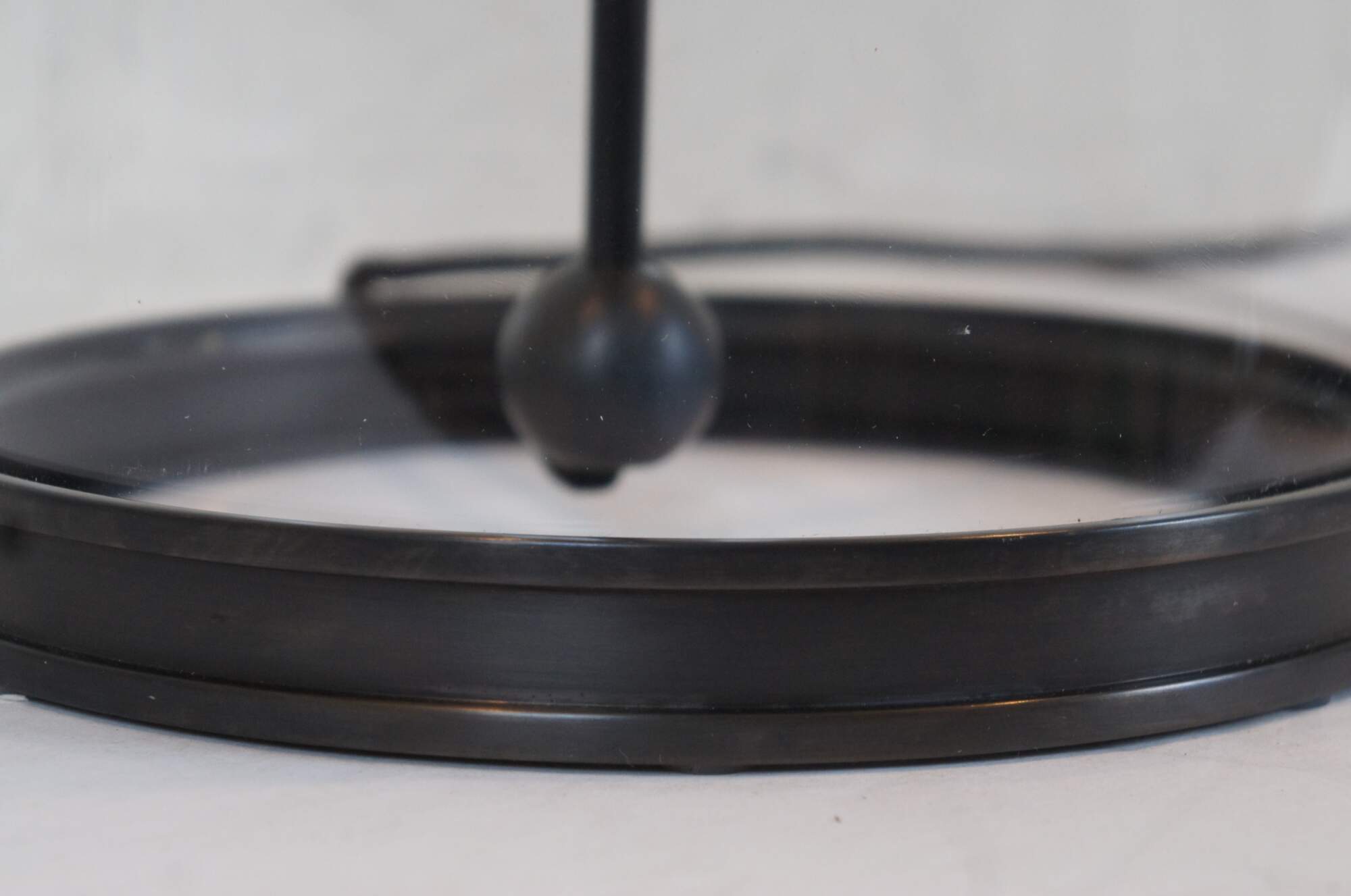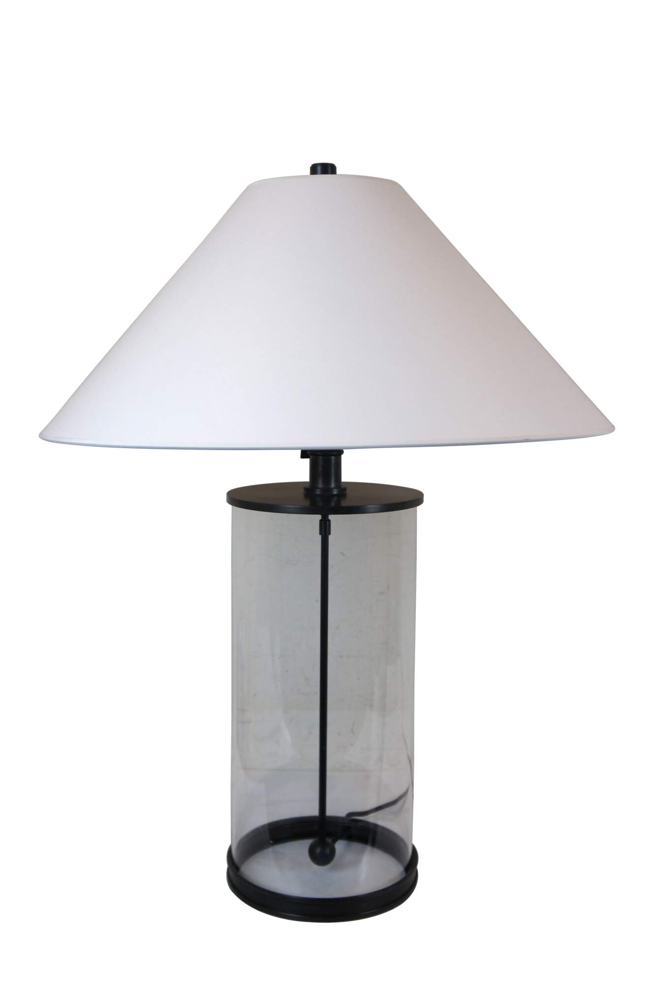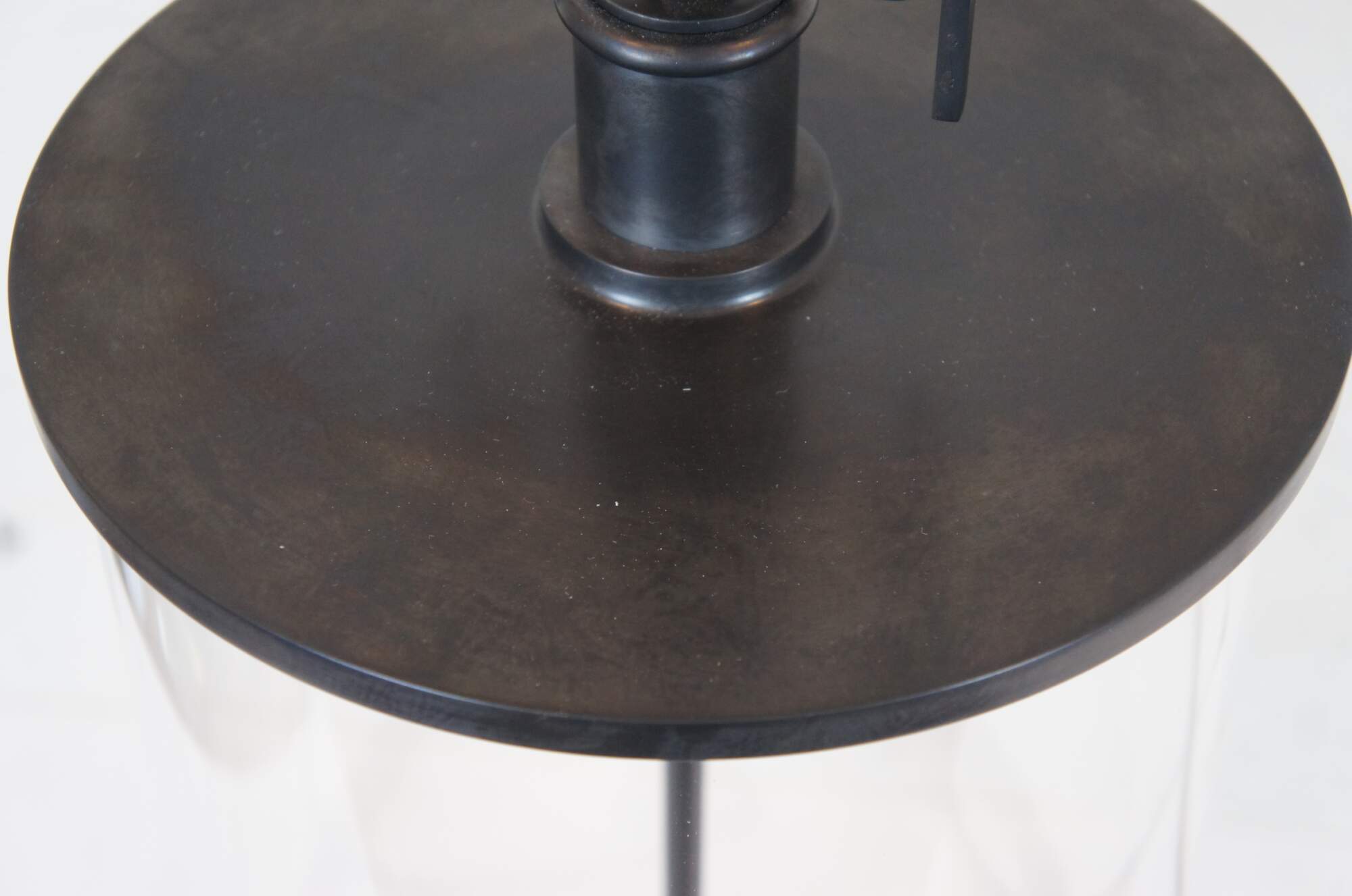 Pair of Ralph Lauren Lighting Modern Table Lamps. The minimalist design features a glass cylinder accented with Bronze finished metal rims and pendulum shaped cord cover suspended inside. Includes cylindrical finials and white paper shades. Height of the fixed harp is adjustable. Model No: LB4638. SKU: RL11167BZ. Made in China. MSRP: $1280
