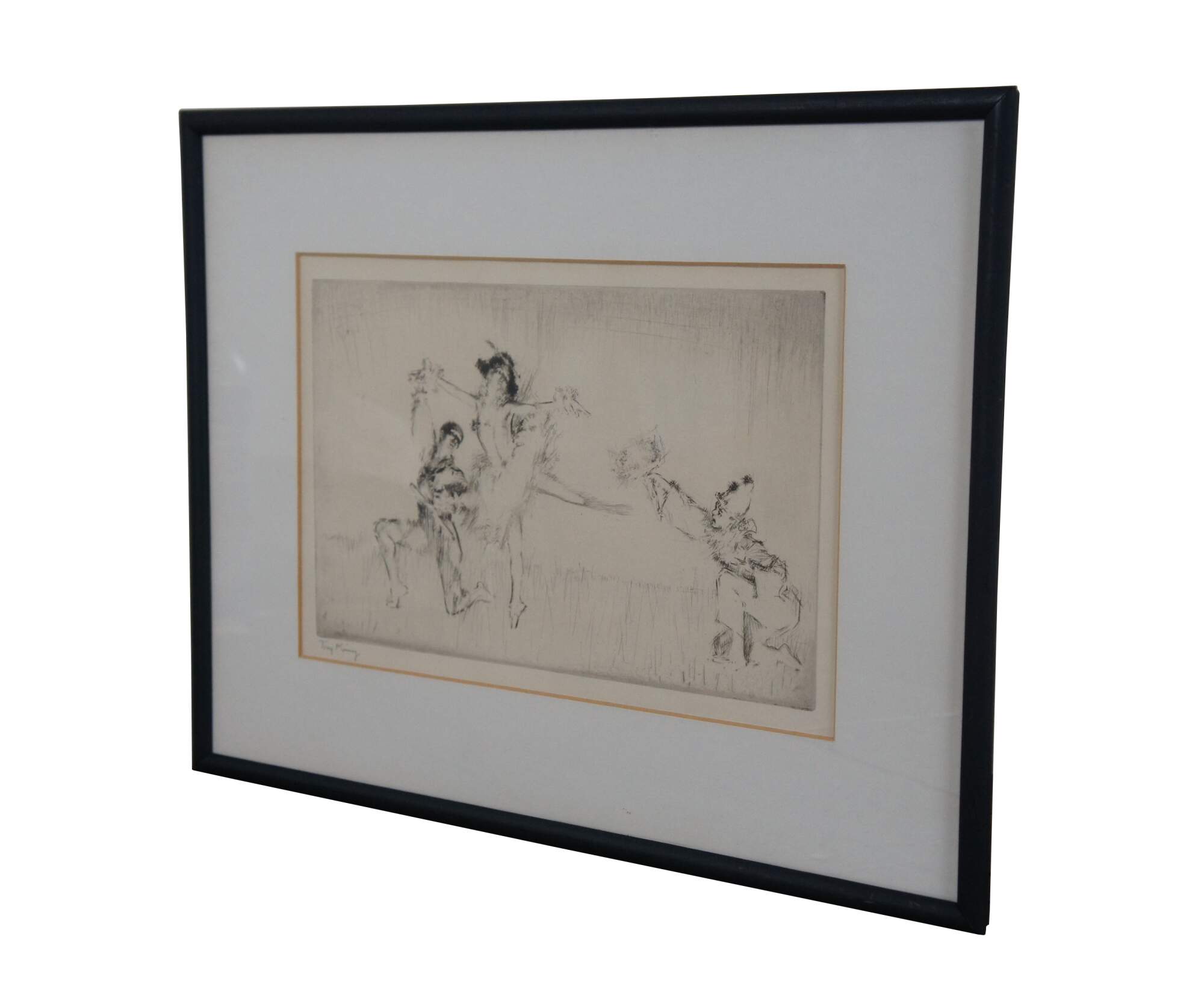 Antique circa 1920s Troy Kinney etching, showing a trio of dancers dressed in the costumes of Commedia del Arte. Pencil signed in lower left. Titled Footlight.