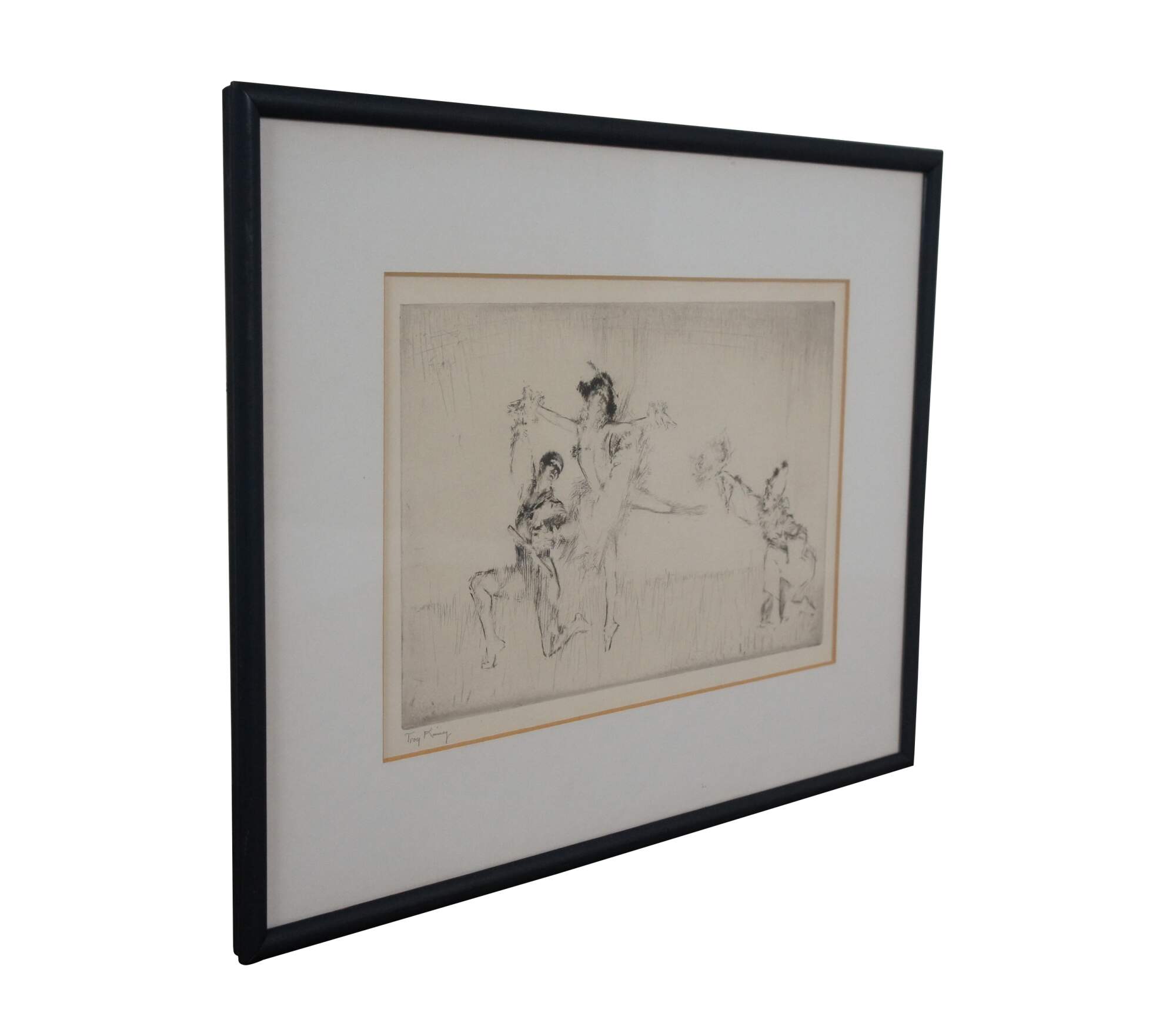 "Troy Kinney (December 1, 1871 - January 29, 1938) was a notable American artist, etcher, and author. He was most notable for his works portraying dance performers, fanciful subjects, and classically styled nudes. He worked with dance performers, including Ruth St. Denis, Anna Pavlova, and Sophie Pflanz among others. His artistic works are part of the collections of the Chicago Art Institute, the Cleveland Museum, New York Public Library, the Library of Congress, and many others. Troy Sylvanus Kinney was born the son of William and Mary Kinney in Kansas City, MO. He attended Yale University, graduating in 1896, and then after a brief time illustrating for newspapers in the Baltimore, Maryland area, he moved to study at the Art Institute of Chicago, where he would later become a full member of the Chicago Board of Etchers. He met and in 1900 married his wife and collaborator Margaret West Kinney. They were premier illustrators of the early 20th century, creating works under the joint name "The Kinneys", including scores of books, and covers for Harper's Bazaar magazine. Perhaps Troy Kinney's greatest legacy is his contributions in the area of dance. He co-authored with his wife the books Social Dancing of Today and The Dance: Its Place in Art and Life, for which he traveled throughout the world to study various dance styles. It remains to this day one of the most comprehensive works on the subject. Besides being a member of the Chicago Society of Etchers, Troy Kinney was a member of the Society of American Etchers, and the National Academy of Design. Troy Kinney died near his art studio in Falls Village, Connecticut, leaving his wife and only child, John West Kinney." (Source: askART)