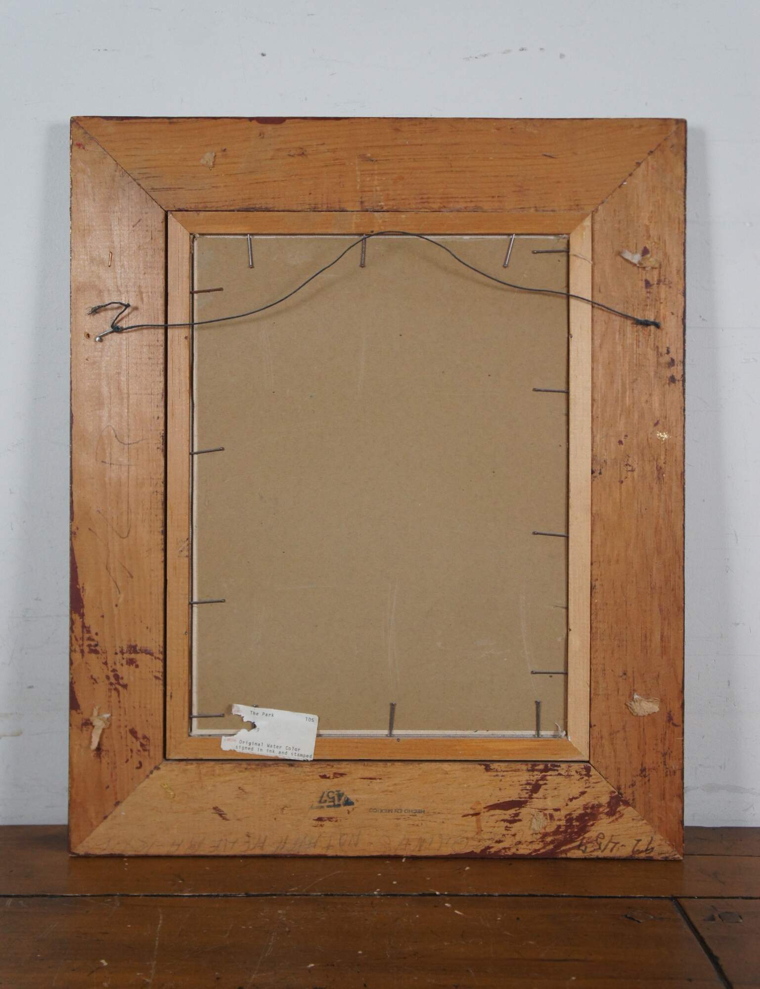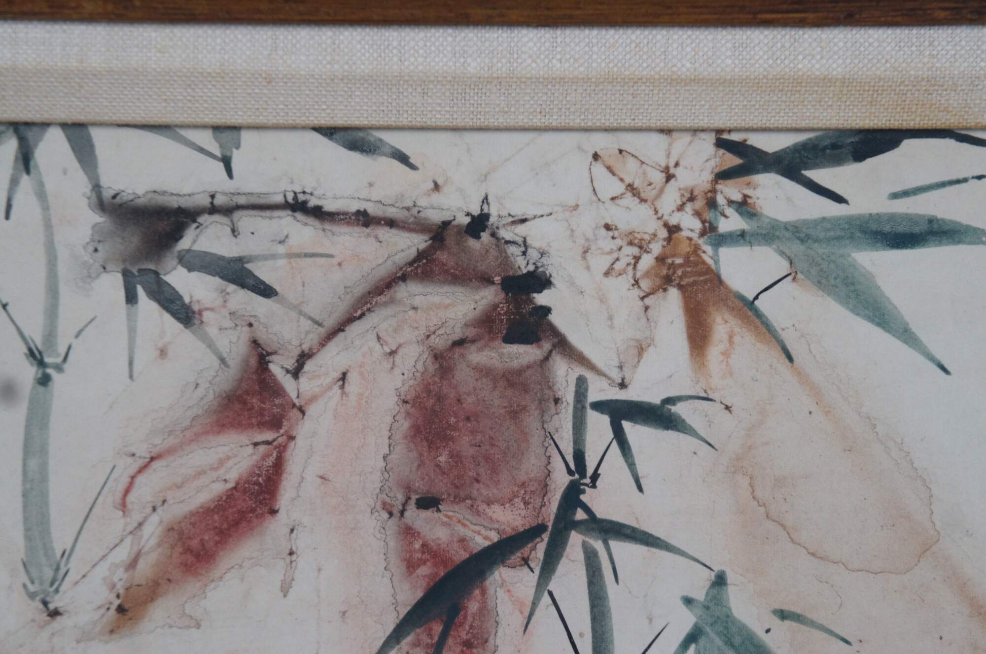 Mid 20th century Chinese watercolor painting titled "The Park," showing a semi abstract tree surrounded by stalks of bamboo and a few small birds. Signed in ink and stamped by the artist in the middle left side. Red painted and giltwood frame with raised bevel and carved details; linen mat.