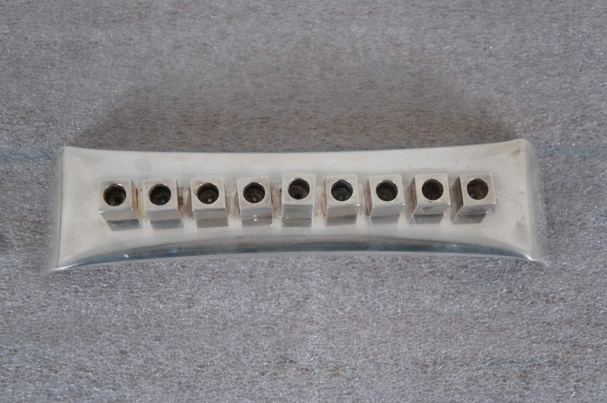 Mid to late 20th century Hannukkah menorah. Industrial style with mid century modern cubic candle cups - eight for each day of Chanukah and one shamash candle. Signature on base.