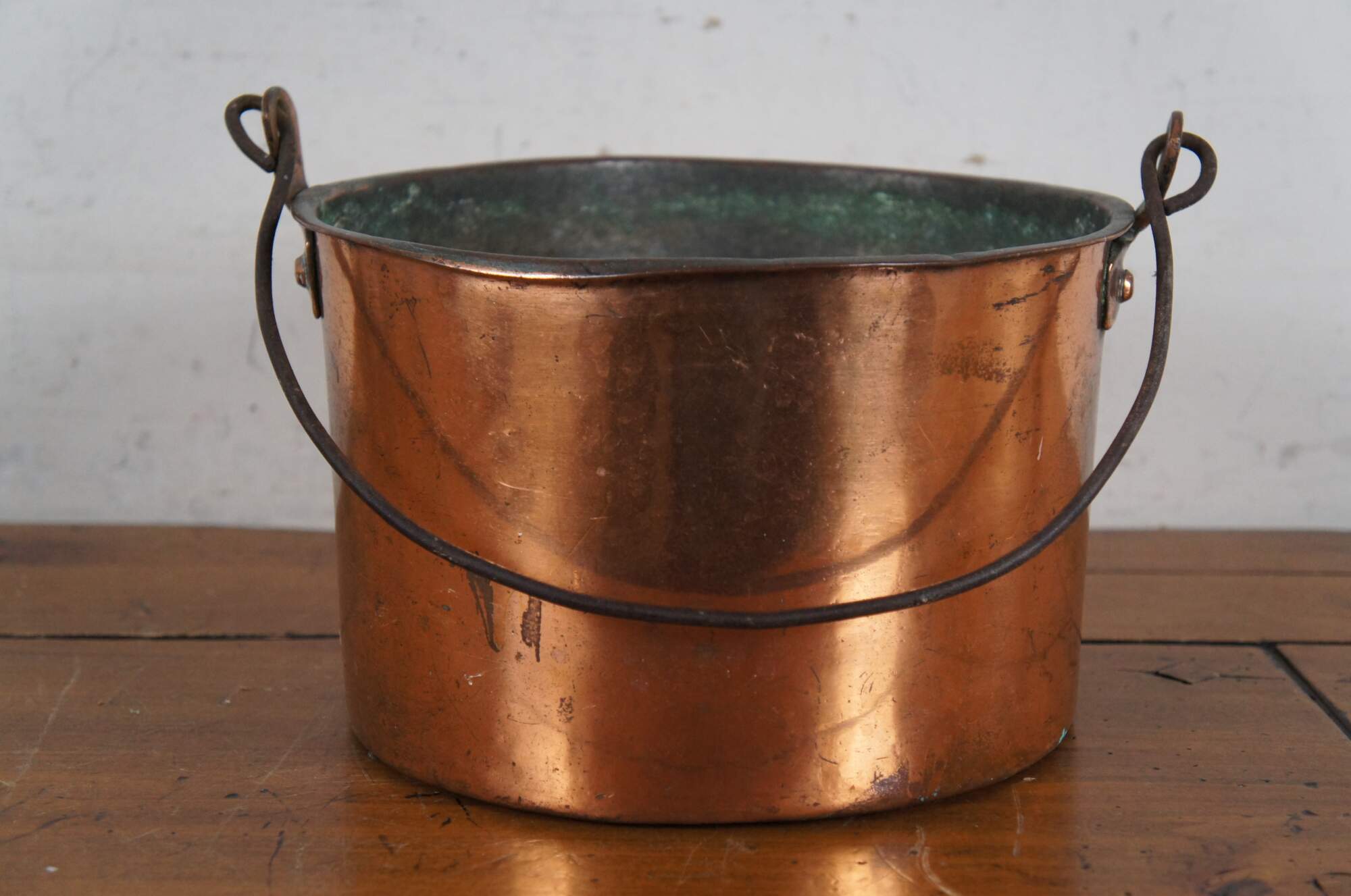 Late 19th to early 20th century dovetailed copper cooking pot with rotating rattail bail handle.