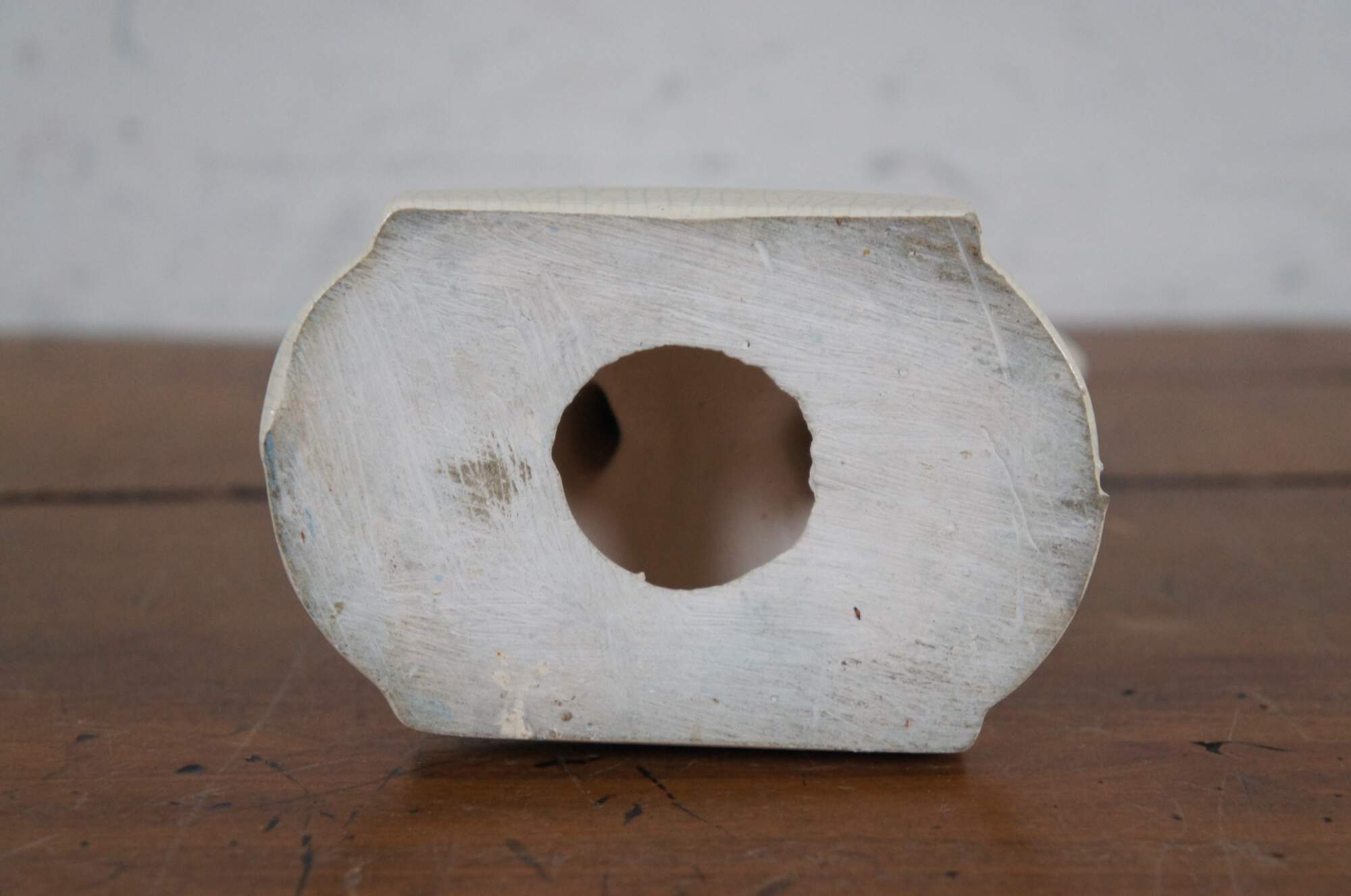 Mid 20th century ceramic horse figurine. Stylized art Deco inspired design with long legs and head turned back, staning on a oblong plinth edged with leaves. Cream coloring with pale blue artificial crazing.