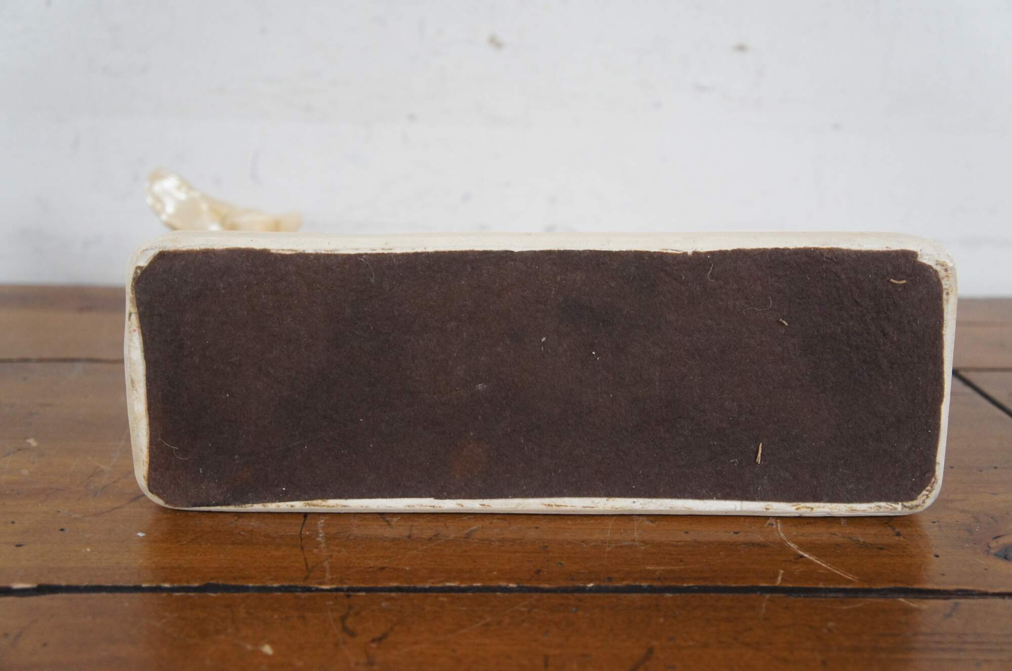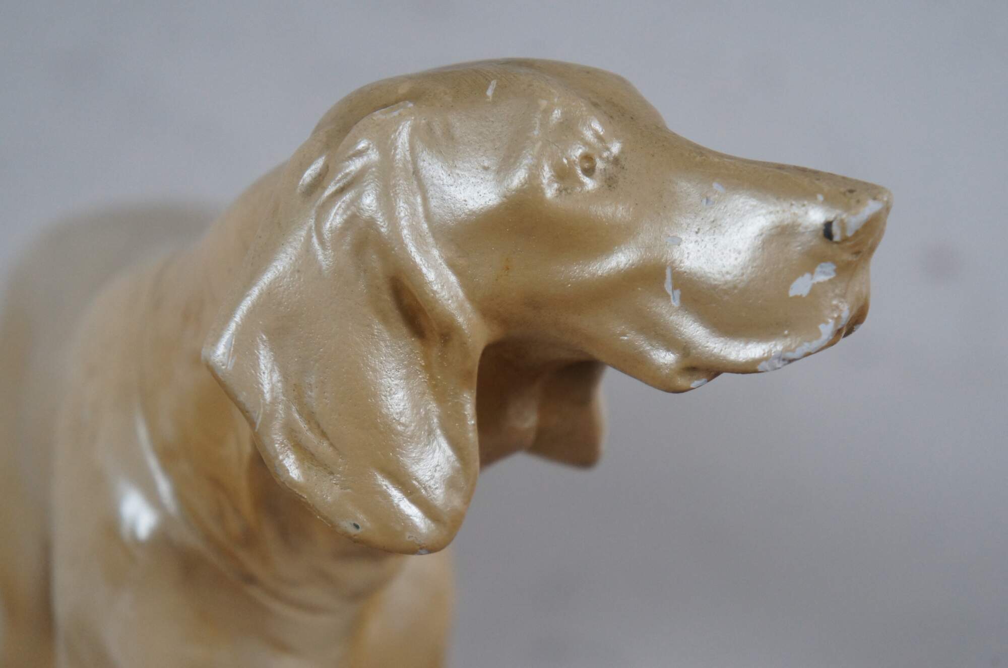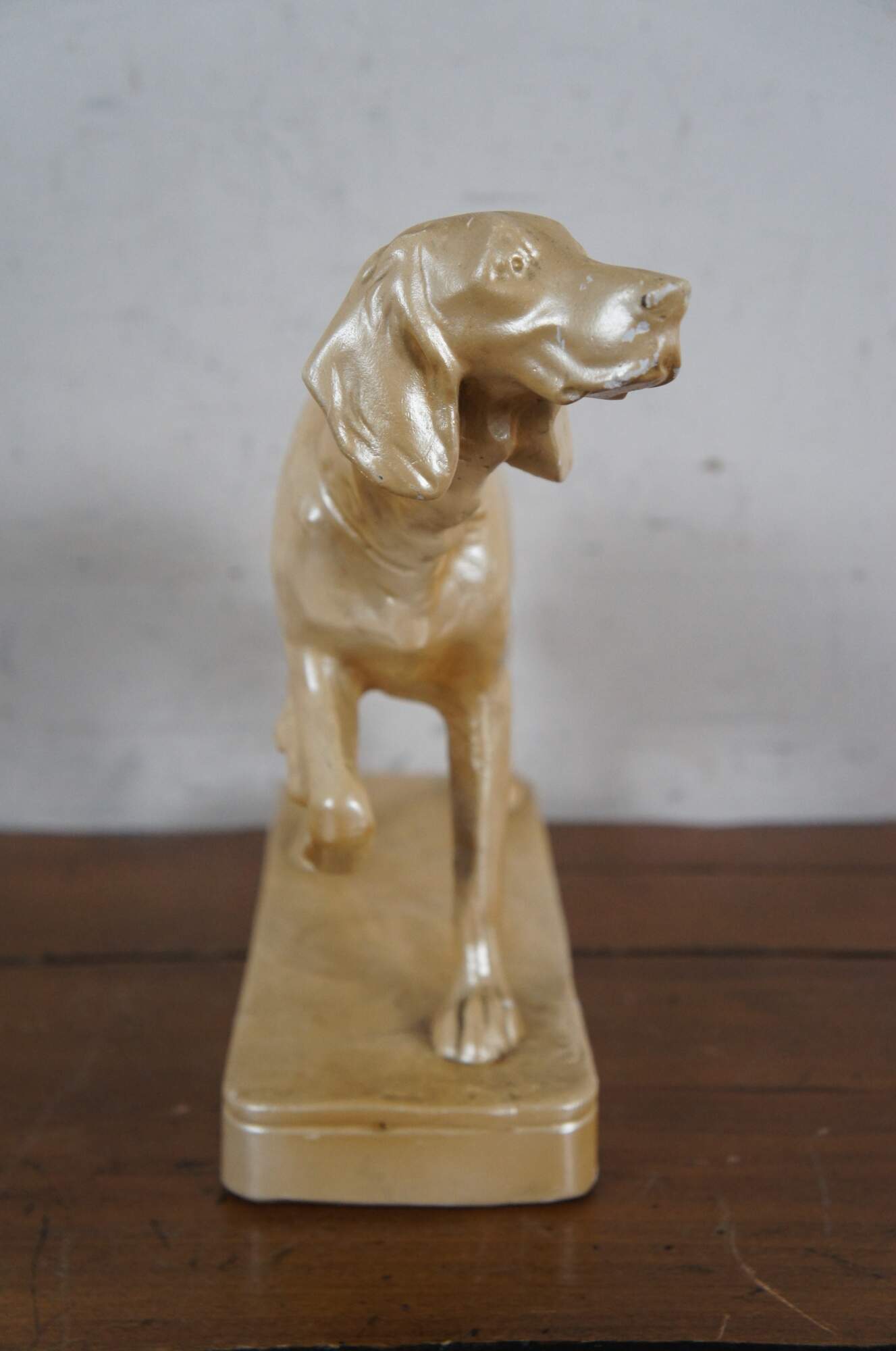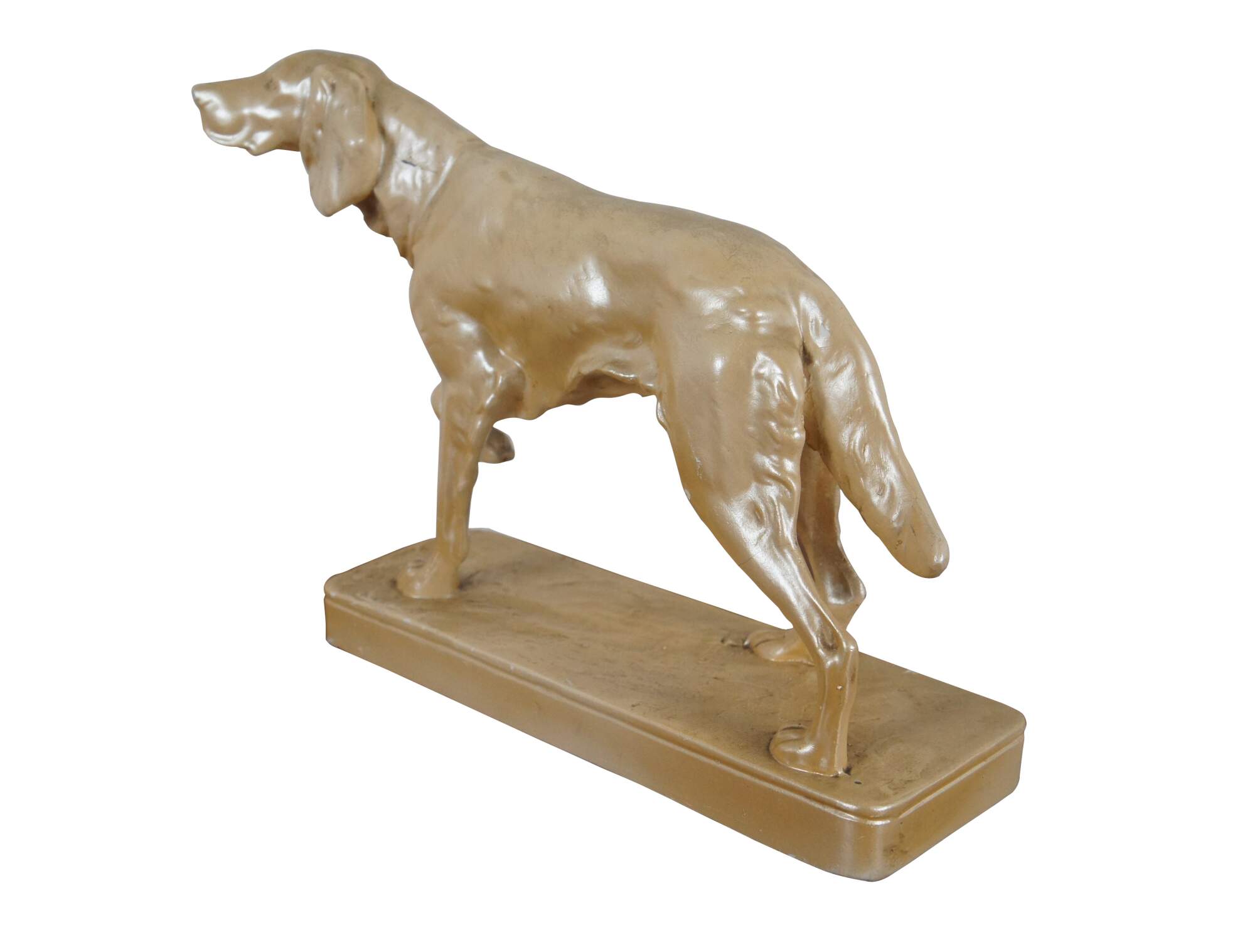 Mid to late 20th century chalkware figurine of a hunting dog / Spaniel / Retriever pointing at his prey, set on a rectangular plith and finished with a cream colored metallic paint.