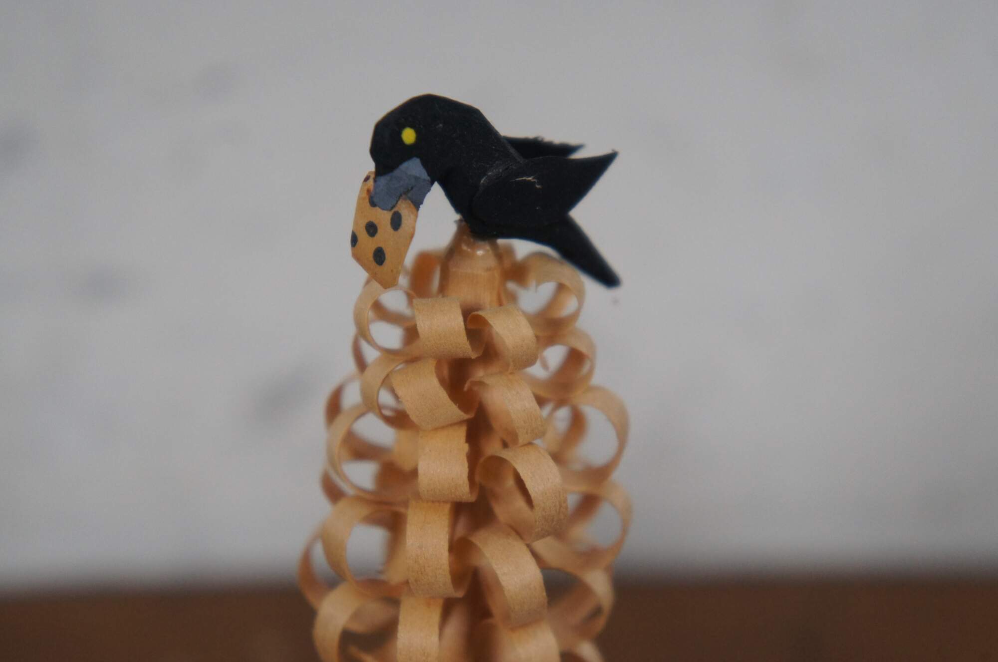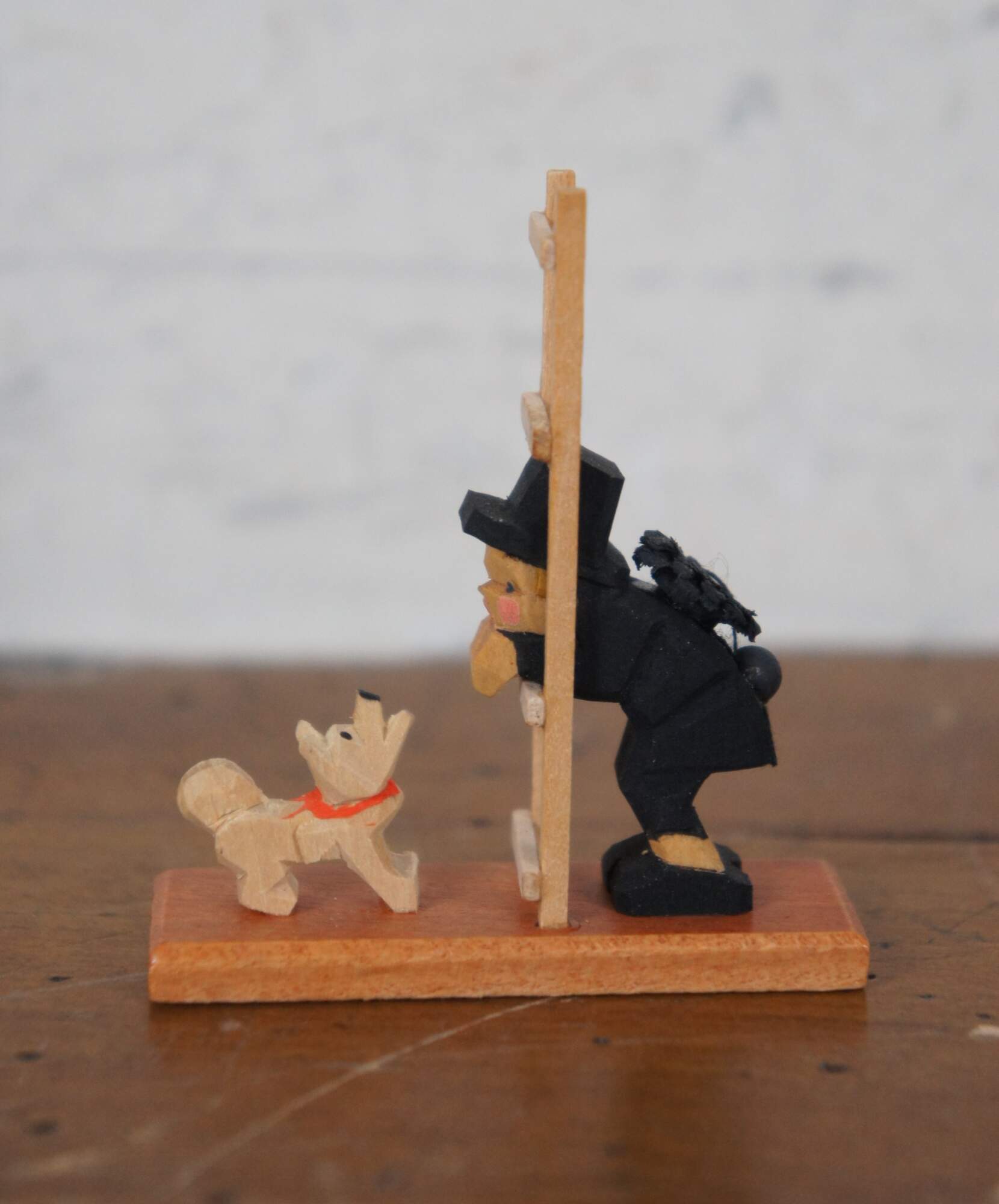 Lot of eight mid to late 20th century hand crafted German Erzgebirge / Expertic wooden figurines. Lot includes: Pair of rabbits and a fox with an oversized Easter Egg under a tree; by Emil Helbig. A fox looking up at a crow in a tree, inspired by Aesop's fable The Fox and the Crow; by Emil Helbig. A fox looking up at a bunch of purple grapes, inspired by Aesop's fable The Fox and the Grapes; by Emil Helbig. A chimney sweep leaning on a ladder, peering at a small dog; by Emil Helbig. An artist with paint palette and brush and a partial painting on an easel; by Wilhelm Busch. A fox perched on top of a wooden bucket, under which a duck or goose is hiding; by Emil Helbig. And a little Dutch girl in a striped skirt, carrying baskets of flowers; by Emil Helbig.