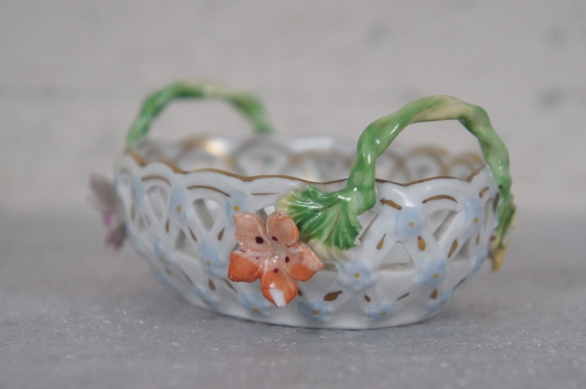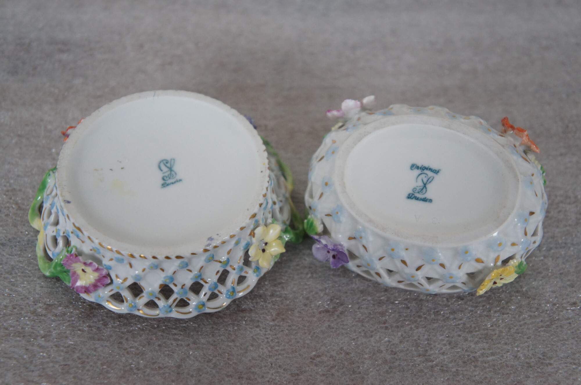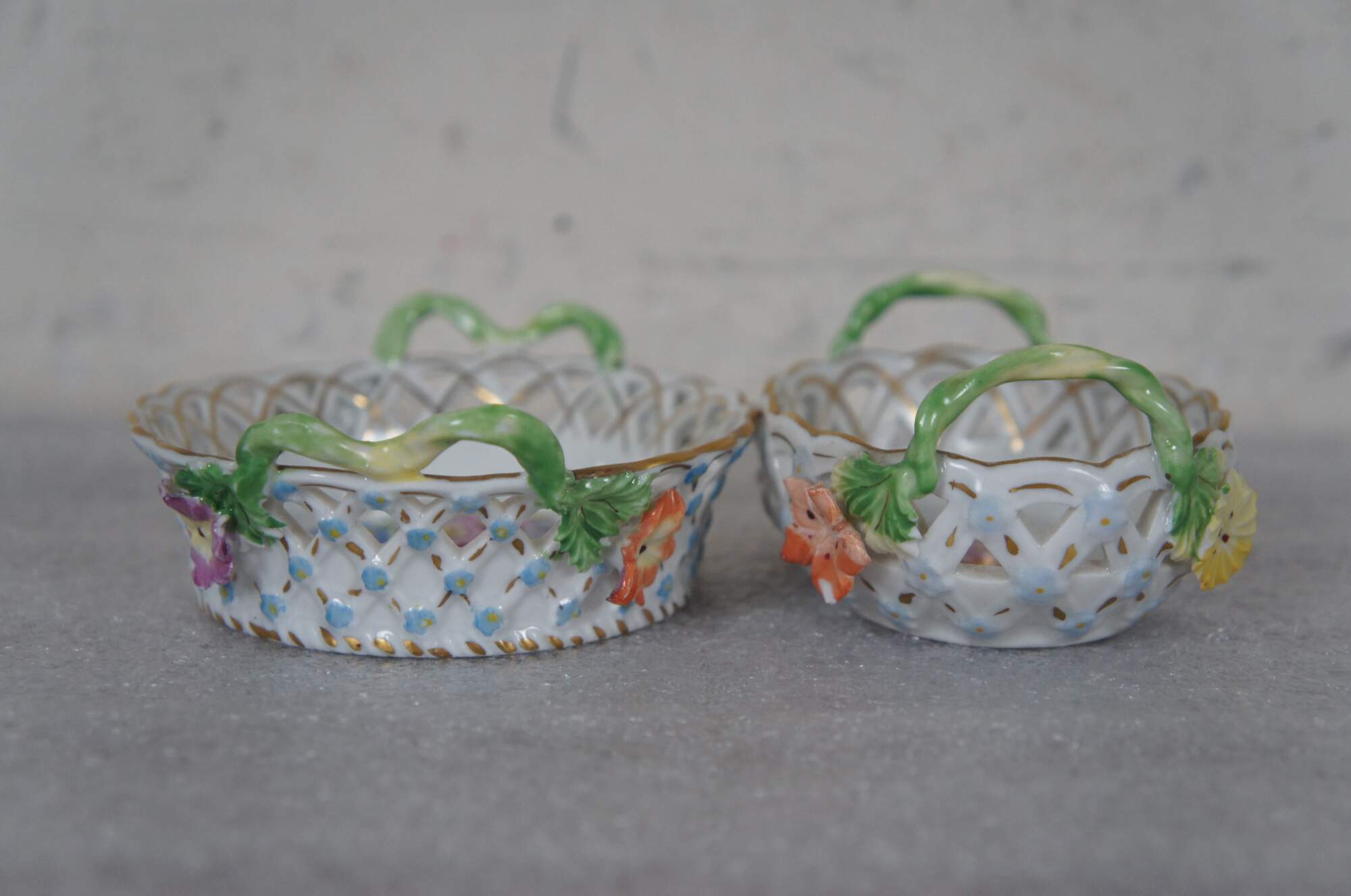 Pair of vintage Dresden Porcelain miniature dishes, one oval and one round, with pierced basketweave sides, twisted branch handles, hand painted with sprays of flowers. One incised 337A.