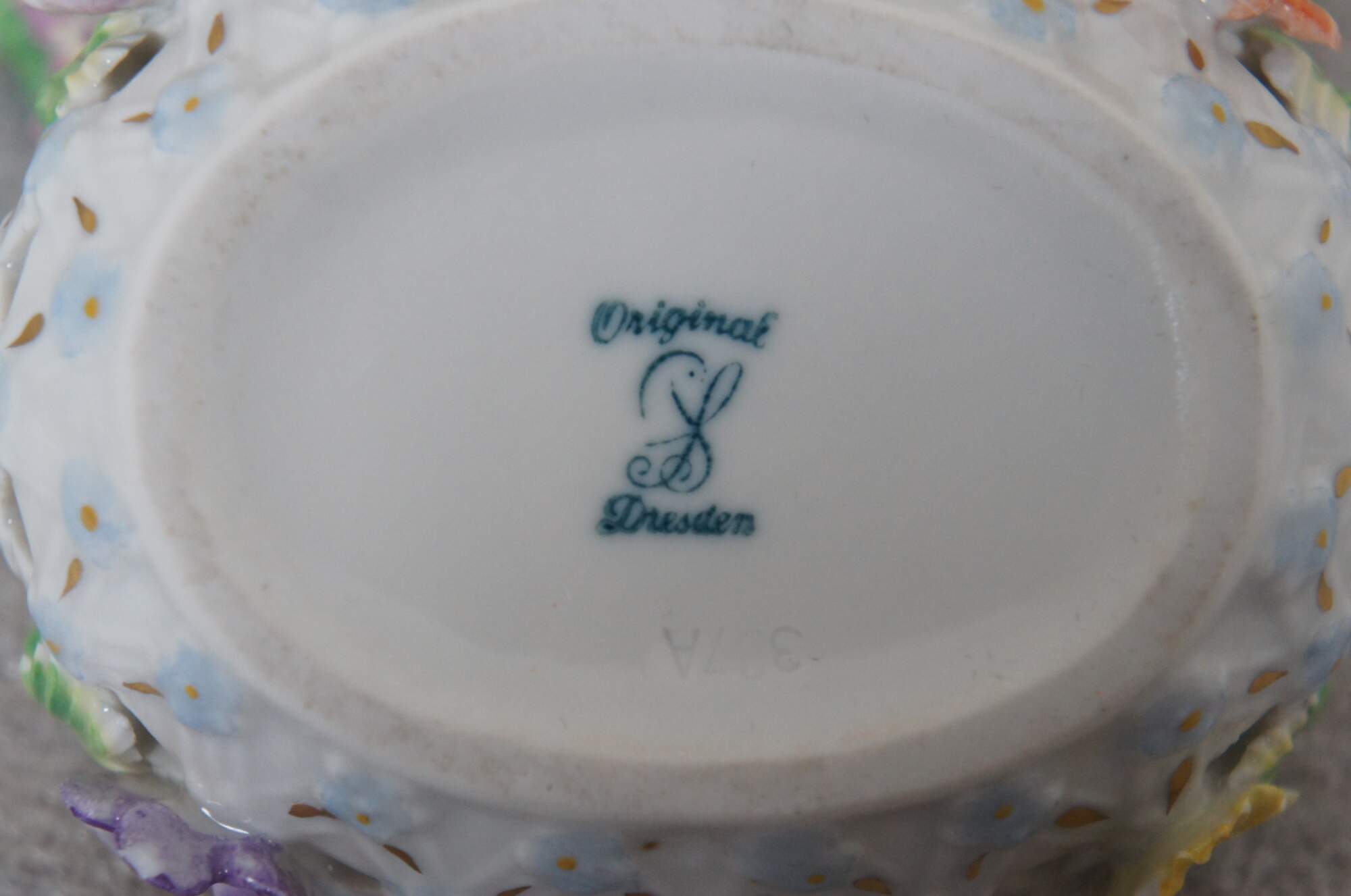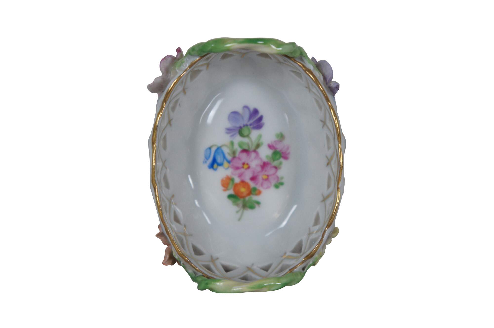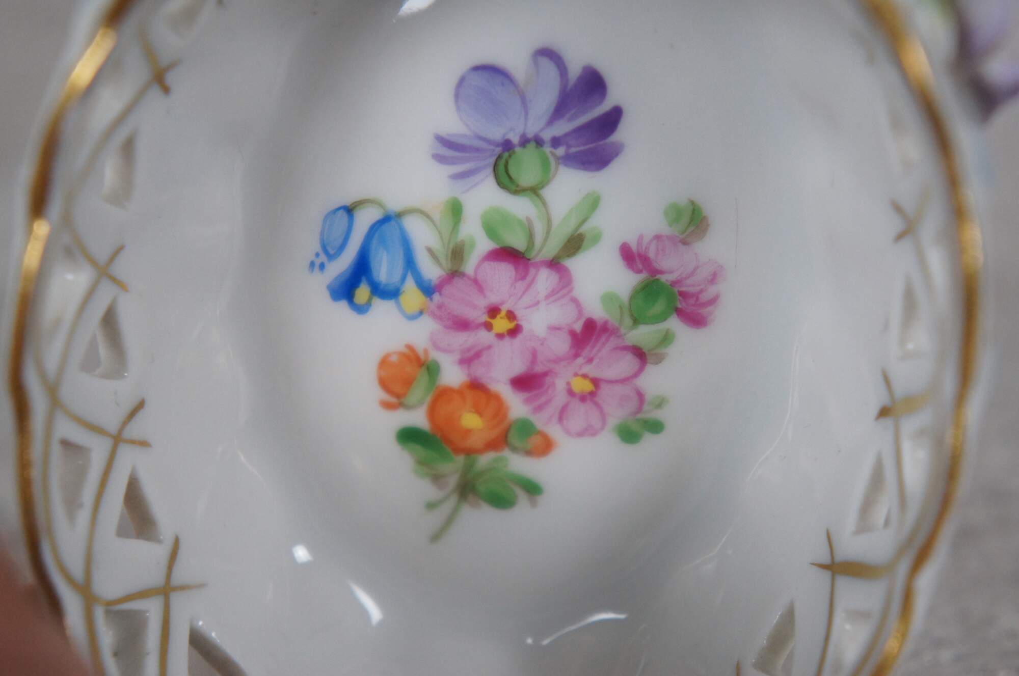 Pair of vintage Dresden Porcelain miniature dishes, one oval and one round, with pierced basketweave sides, twisted branch handles, hand painted with sprays of flowers. One incised 337A.