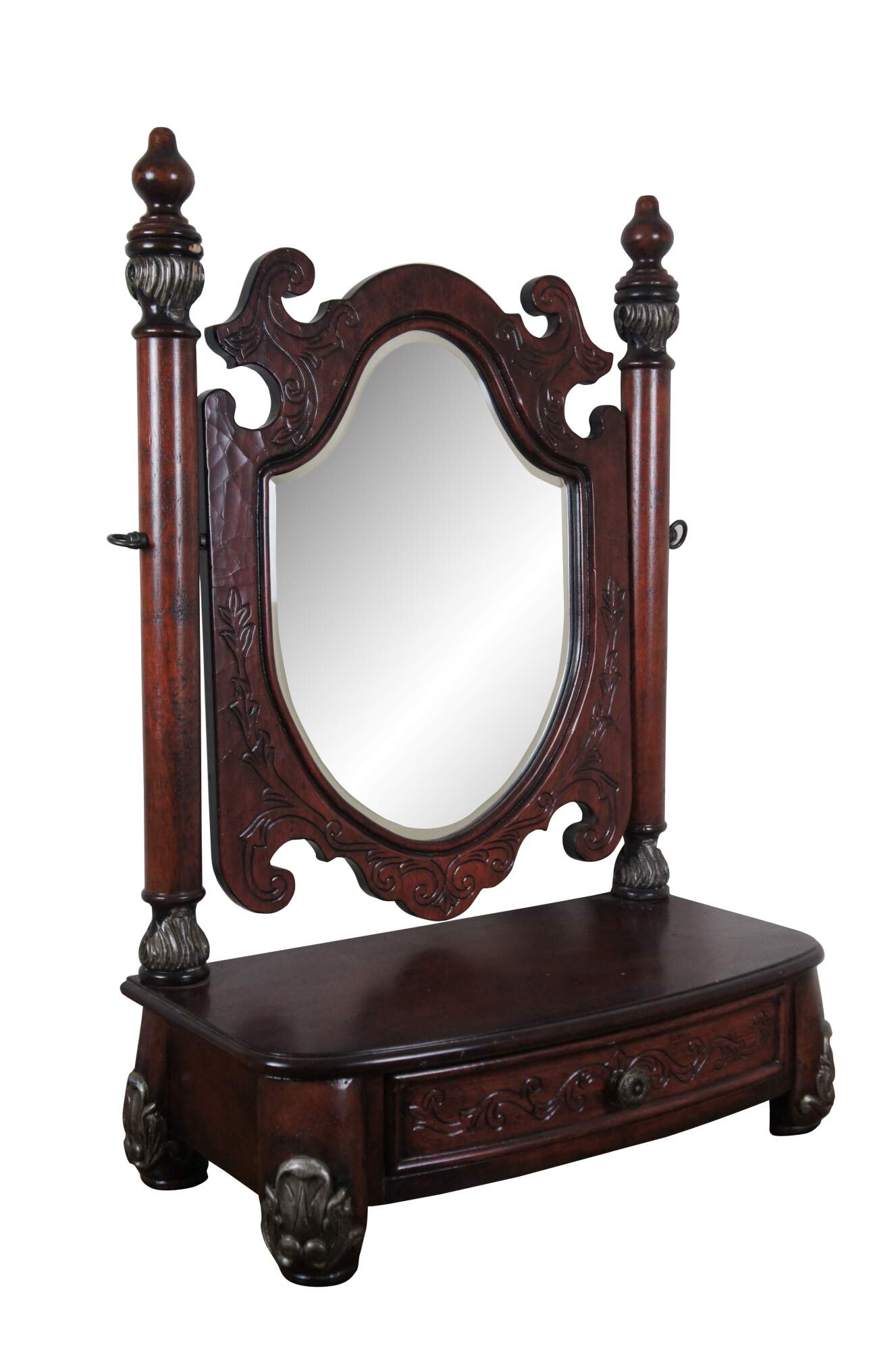 Late 20th century Victorian style tabletop vanity / shaving mirror / stand with one drawer. Scrolled mirror frame, turned uprights, one velvet lined drawer in base. Metallic painted carved accents. Made in China. 870-022M.