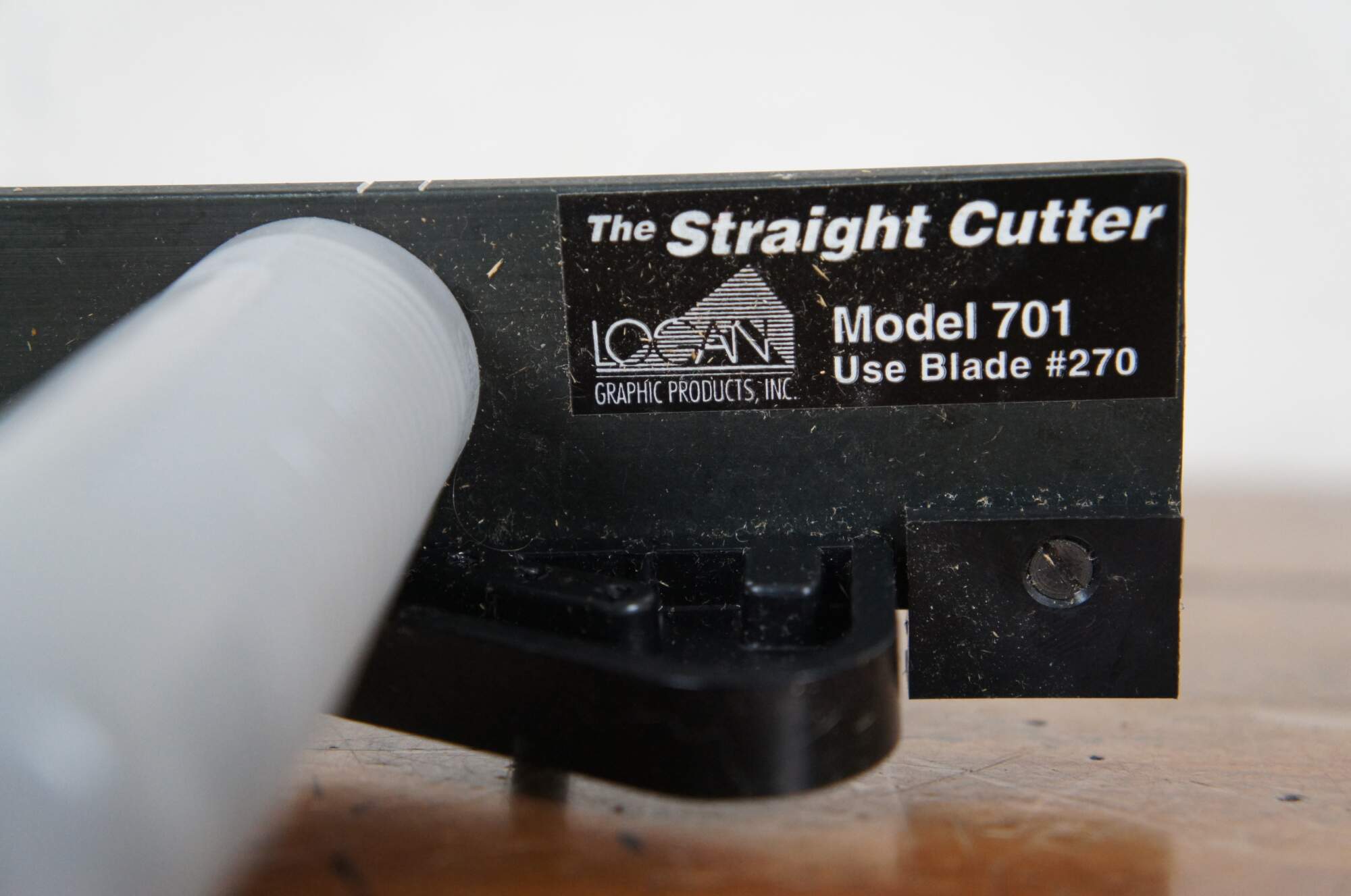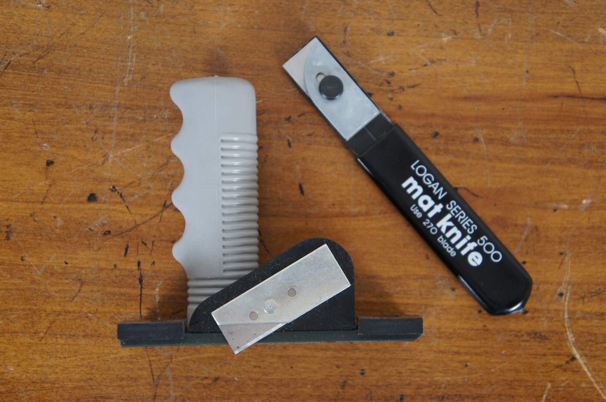 Lot of picture mat cutting tools and instructional book. Logan Graphic Products Inc 90 Degree Straight Cutter, Model 701 and Series 500 Mat Knife. "Basic Mat Cutting" by Vivian Kistler - paperback - Columbia Publishing company, Akron, Ohio - Copyright 1998, 1996, 1995 by Logan Graphic Products Inc - Second Edition - ISBN: 0-938655-45-0. Also included: three packages of #270 replacement blades (approximate quantity 120), plastic box for storage, and two Staedtler Lumocolor Waterproof marking pens, 317 and 313.