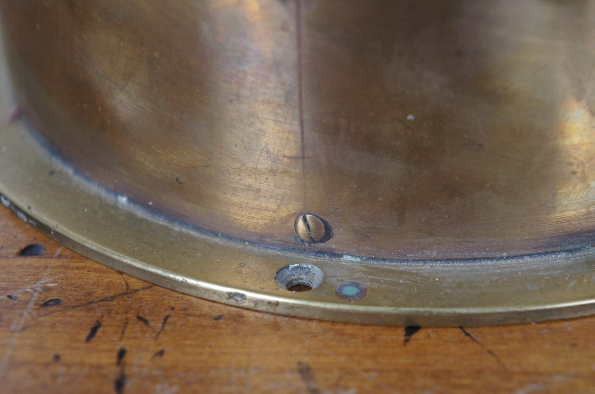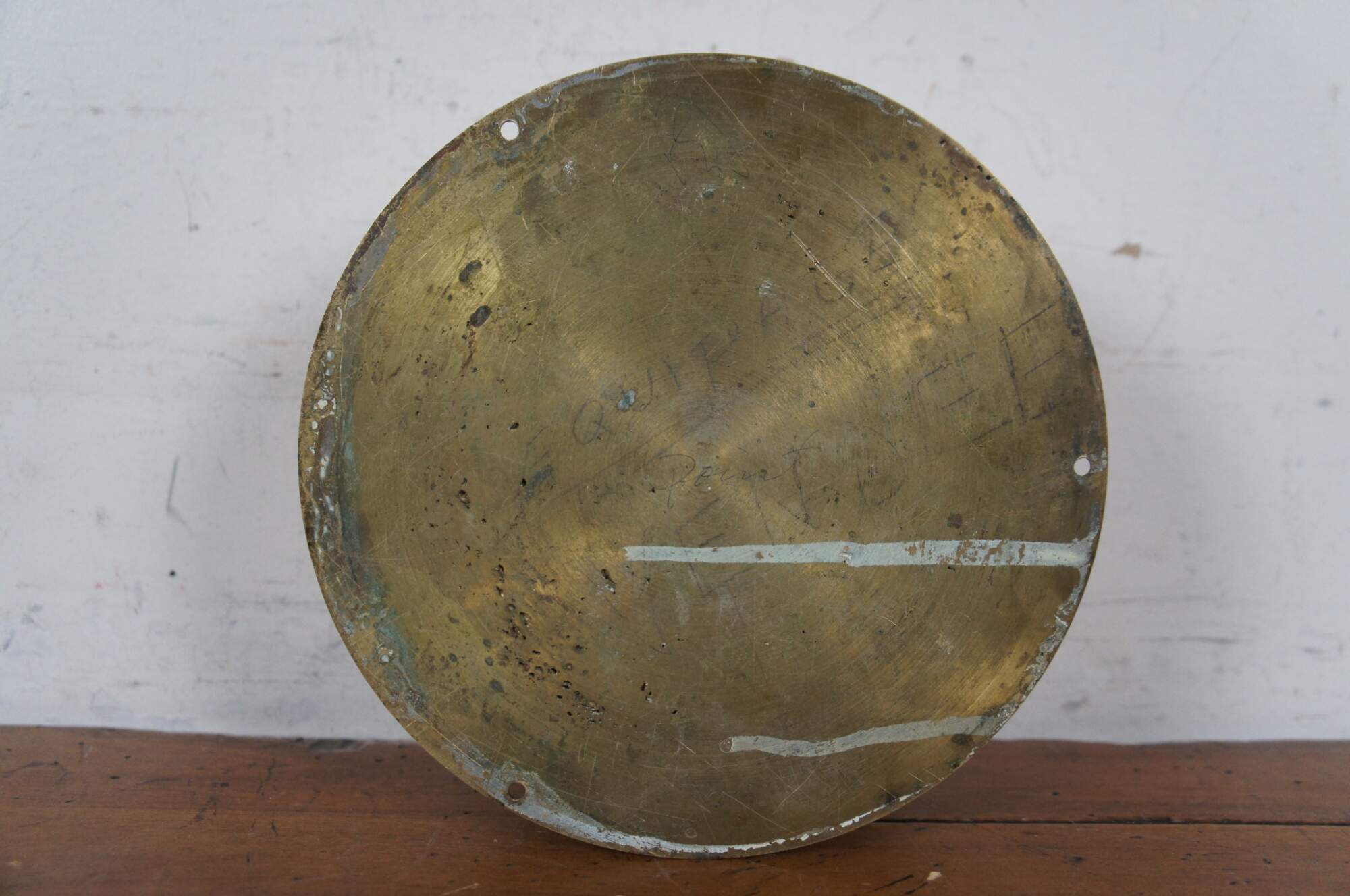 Mid Century French Degon rouen ship's clock. Wall mounted brass case with painted face, Roman numerals, copper hands, fronted with thick glass. Works numbered 6 56 005042. Made in France circa 1956.