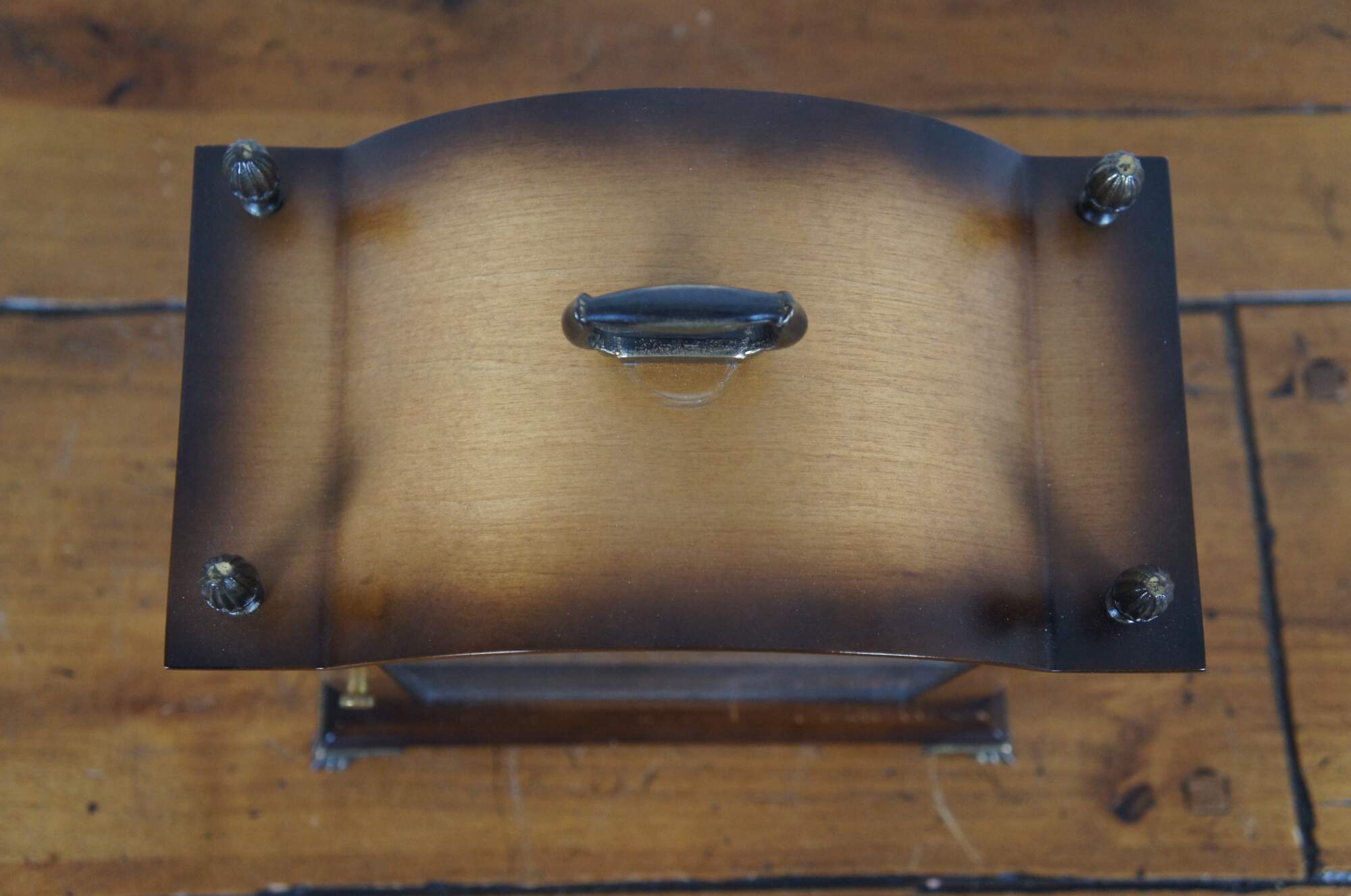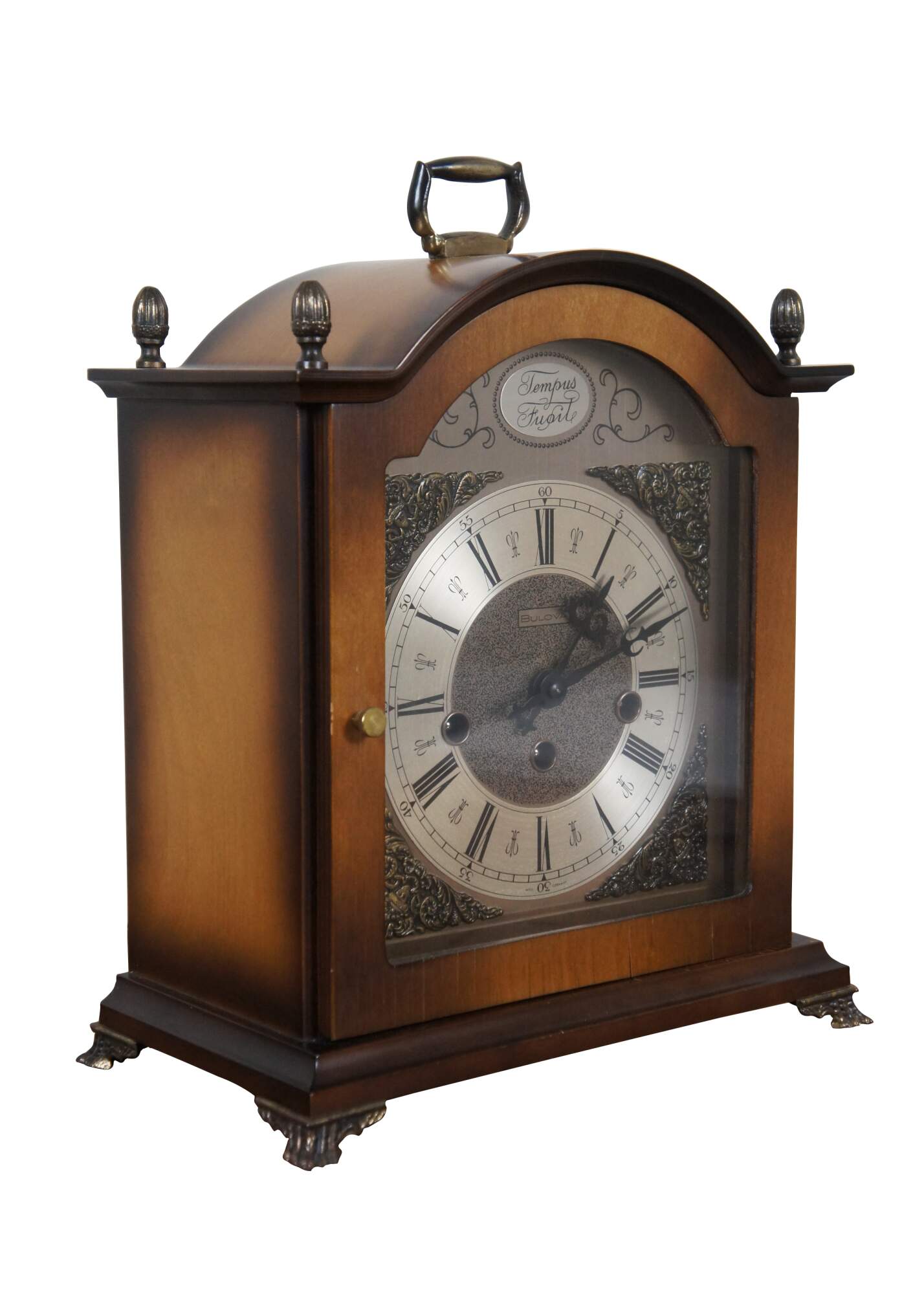 Vintage Bulova Tempis Figut mantel clock. Wooden case with oxbow top, brass feet, handle and finials. Silvered face with motto Tempis Fugit above, brass ormolu corners, black metal hands, Roman numerals. Franz Hermle works. Two jewels, unadjusted. Made in Germany. 340-020A. Includes key.