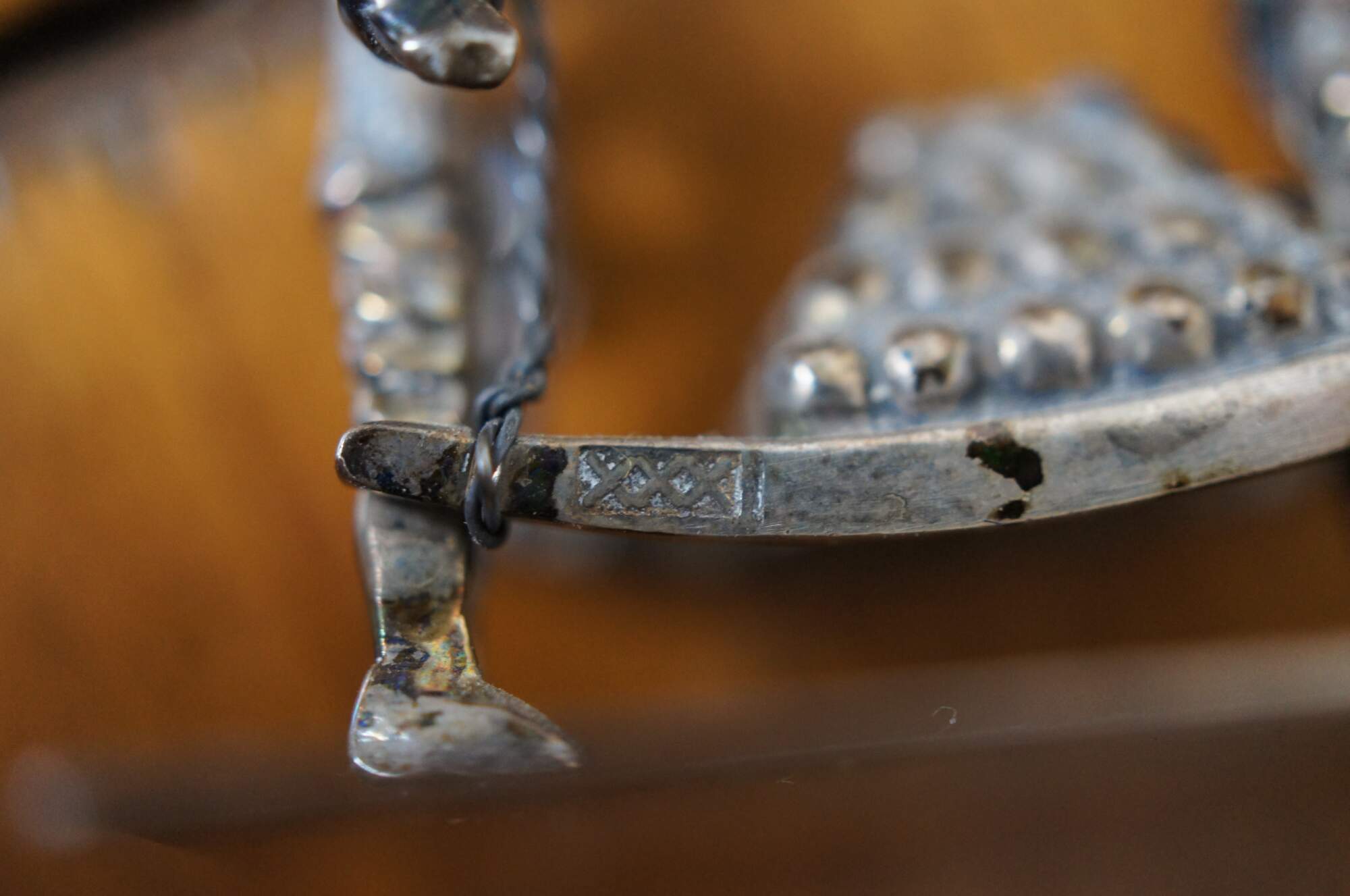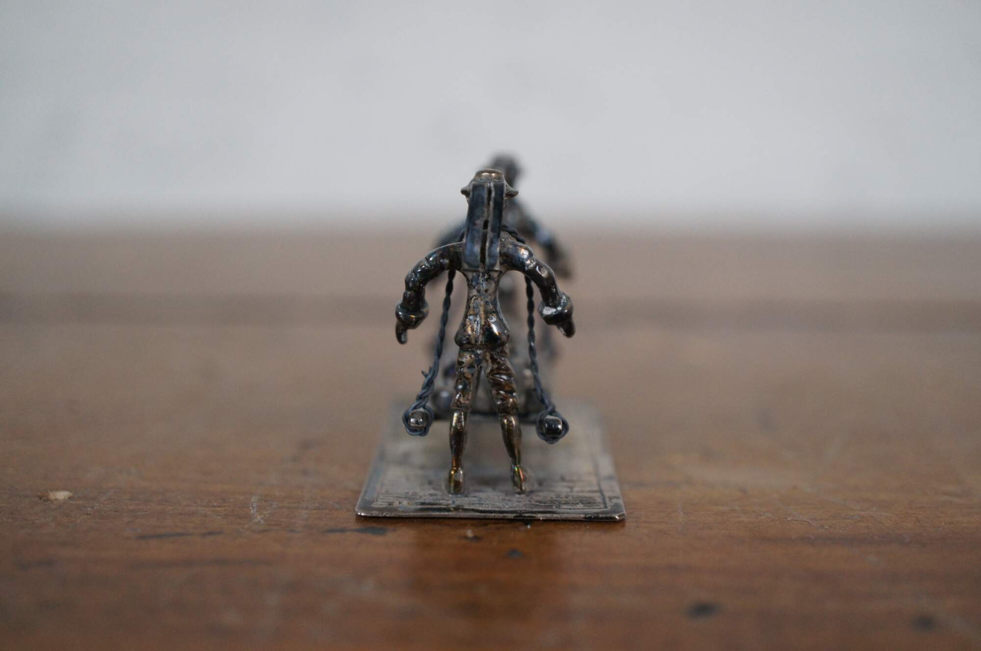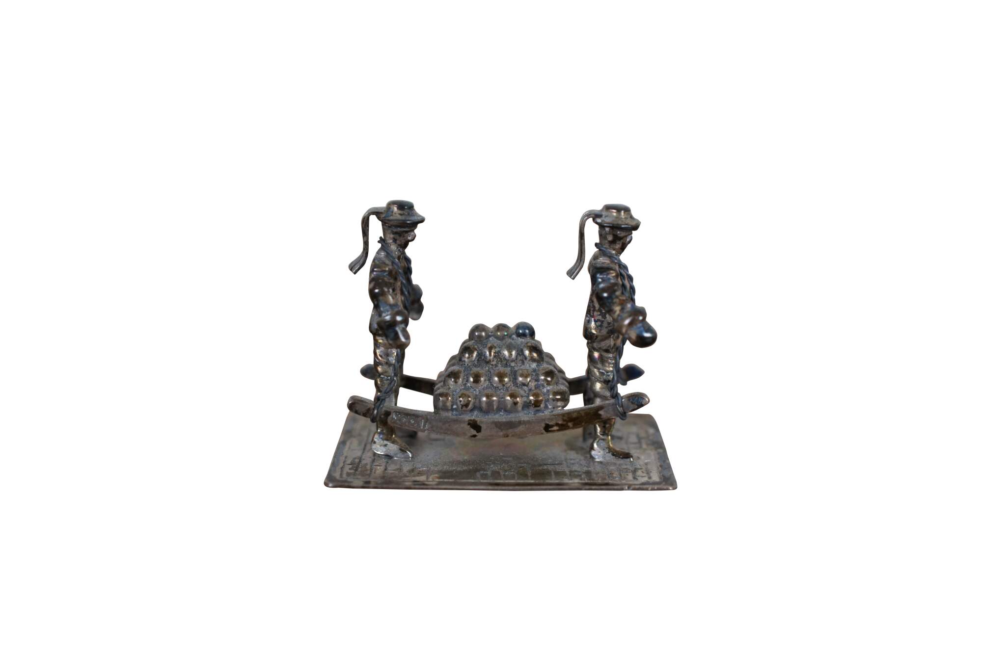 Mid to late 20th century 825 Dutch silver miniature figurine depicting a pair of men carrying a load of cannonballs between them. Single sword silver mark with the numerals 835 on the blade indicate manufacture after 1953. Also marked with three St Andrew's Crosses (XXX) in a rectangle, mimicking the 18th century assay mark of Amersterdam. Made in Holland / Netherlands.