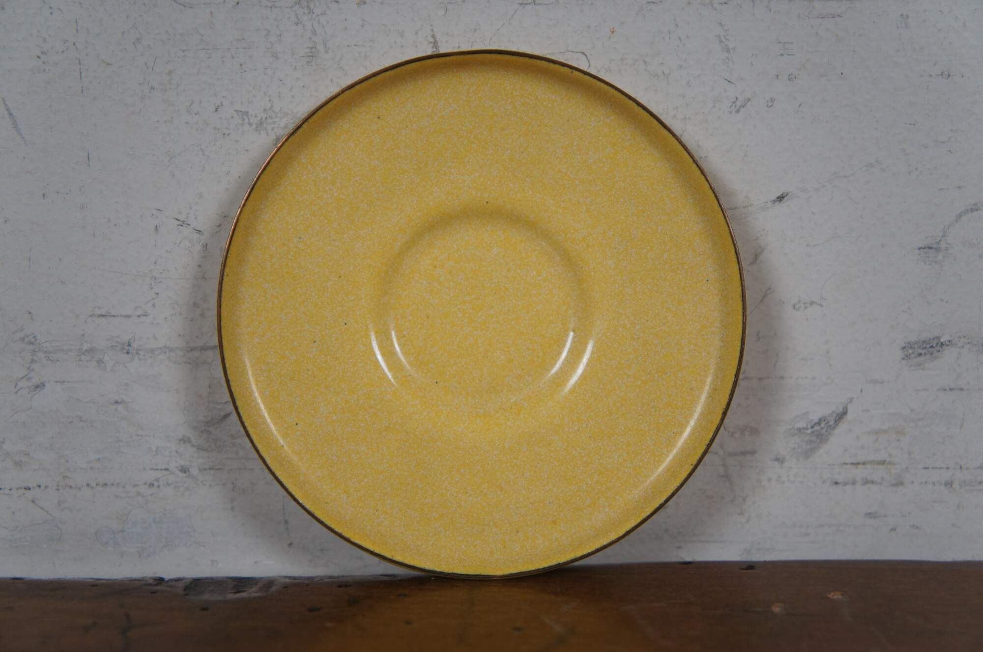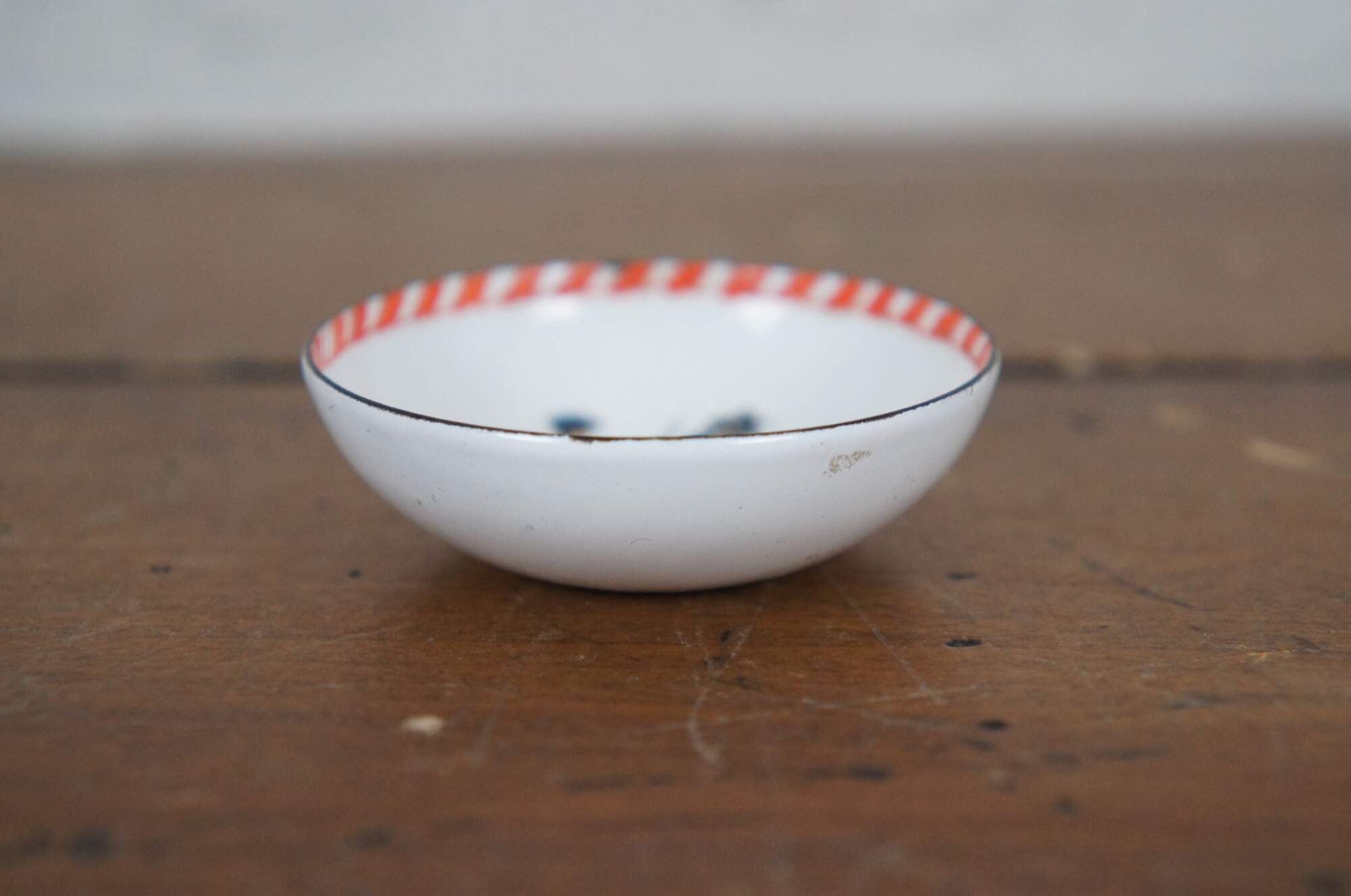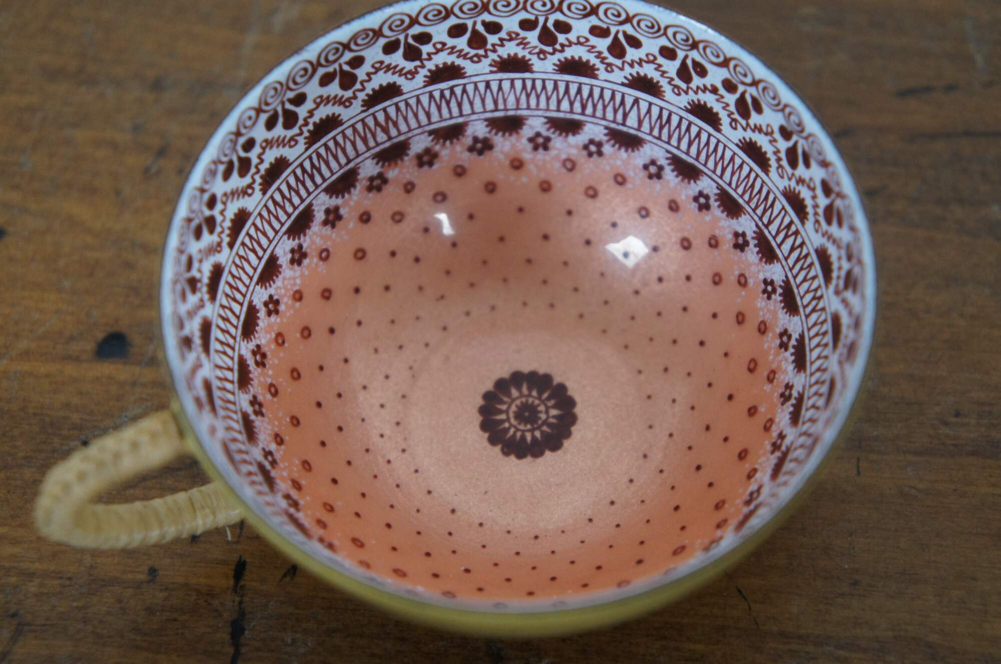 Mid to late 20th century hand painted enamelware pieces by Steinbock Email of Austria. Demitasse coffee / tea cup with yellow exterior and peach ombre and burgundy patterned interior; handle wrapped in cord. And a small round trinket dish with red and white striped edge and image of a man in red colonial style jacket on a rearing white dressage horse with the word Courbette.