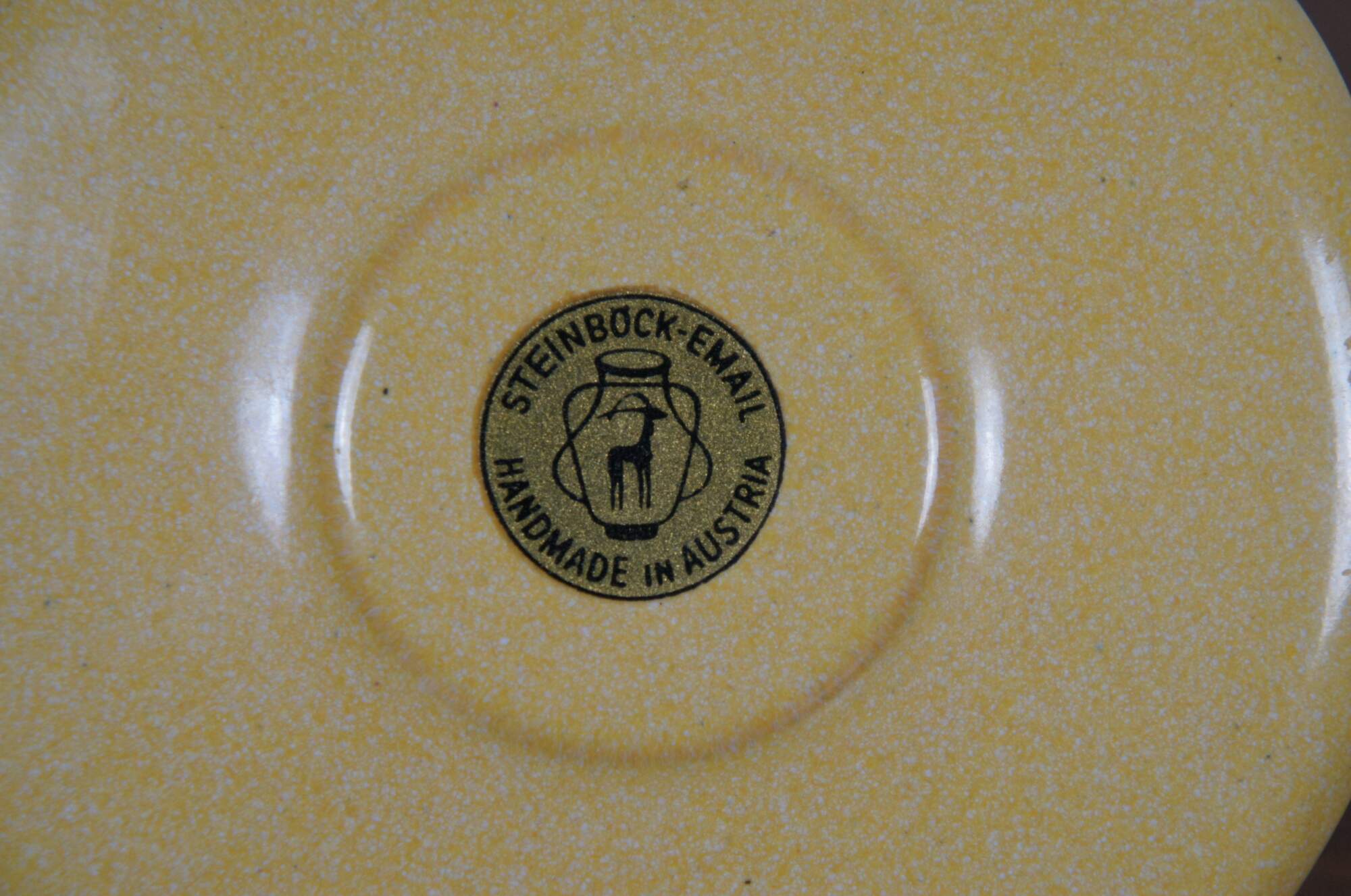 "Enamel Studio Steinböck was founded in the early 50’s by the students Hannes (John) & Haimo Steinböck, two brothers from Carinthia (southernmost Austrian state), who both joined the Academy of Art in Vienna, Austria. Nothing like this exsisted before that time so they became self-made-men. They produced various articles like jewelry, trays, vases, shop portals, artwork for churches and other special orders. Vienna’s famous artists (like Fuchs, Staudacher…) met there also and experimented with this material. The Studio was known all over the world and was also a secret tip in tourist guides. Until the 80’s (with emerging terrrorism and fear to travel), they had about one hundred employees who painted each piece by hand. Later there were only 20 with all the family members. The production switched to handprint combined with handpainting. But as always metals, enamels and 24 carat gold (printed and plated) were used. A former employee and kind of trainee was Michaela Frey, who later founded famous “Frey & Wille." Other copies were “Arta” and very shortly “Brimmer.” Because of the retirement of the two seniors “Studio Steinböck” was run for 2 years by their sons, Michael & Peter Steinböck but then sold. The factory finally crashed after more than 45 year of succesful exsistence in 1993 and closed for ever." (Source: Miss Bargain Huntress / Steinbock Family)