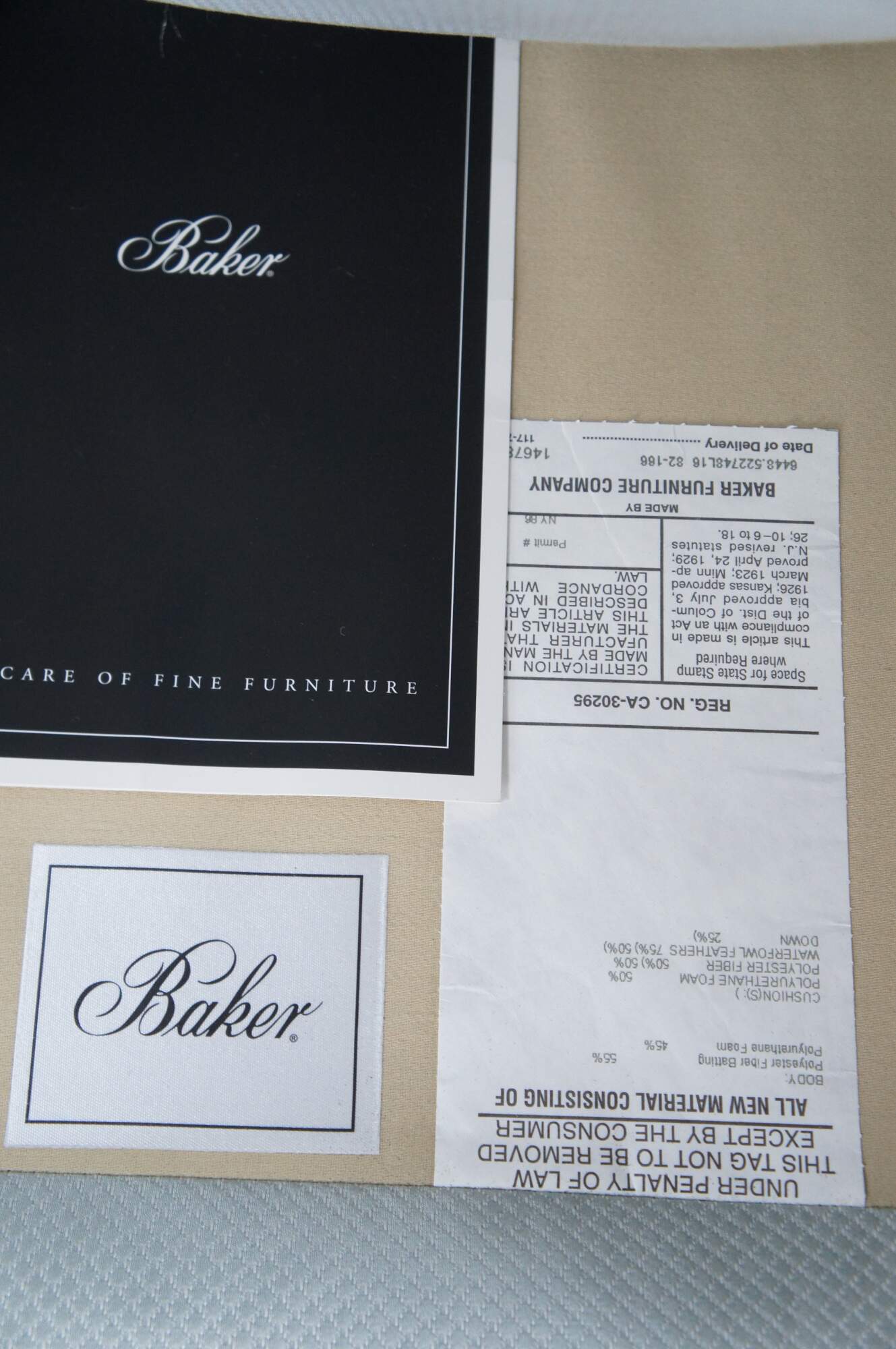 Vintage pair of down filled lounge chairs by Baker Furniture Company featuring William and Mary styling with high arched back, rolled arms and ornate scrolled frame.
