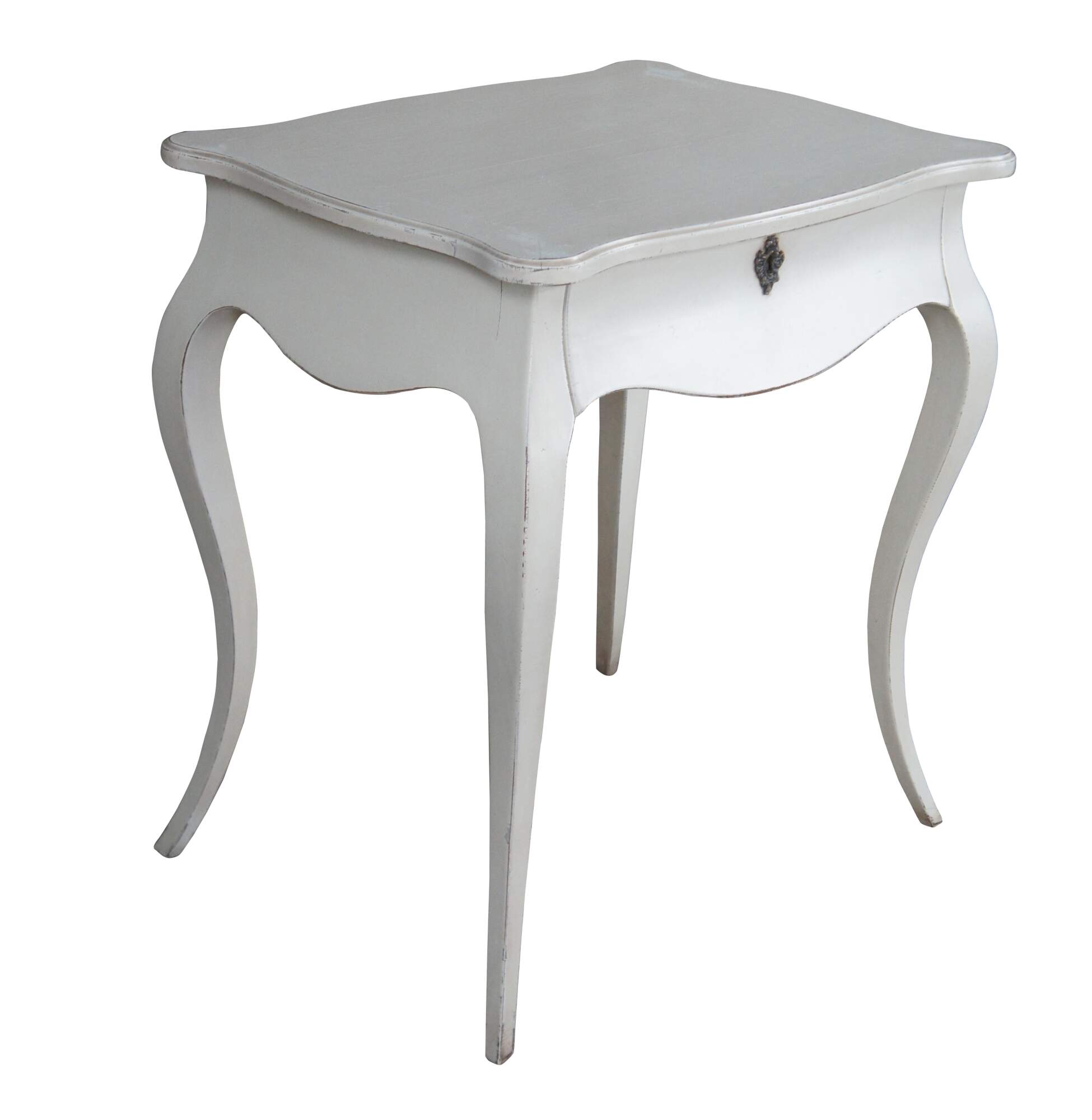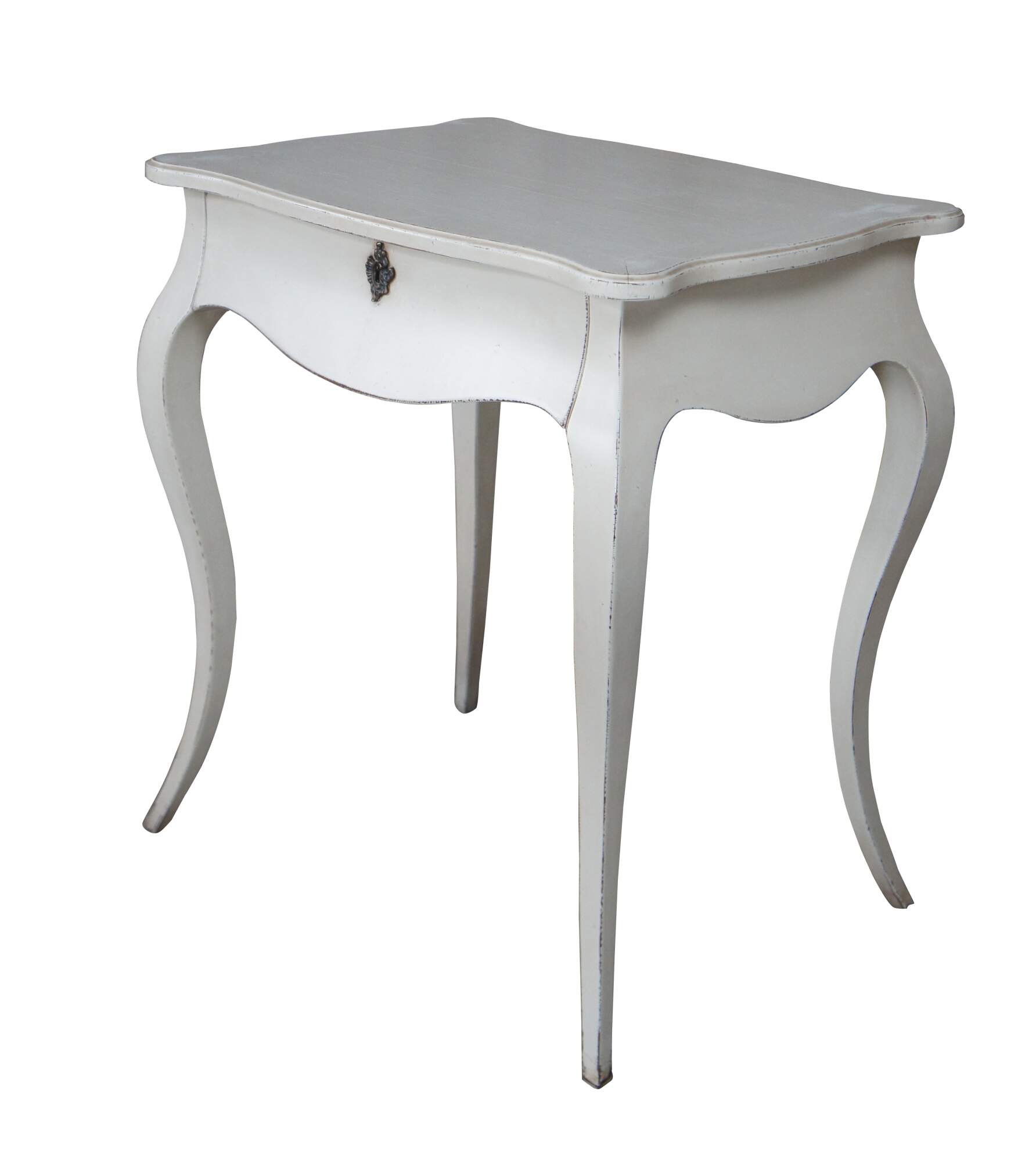 French Victorian style desk / console / table featuring chic white painted exterior with scalloped serpentine form and one drawer.