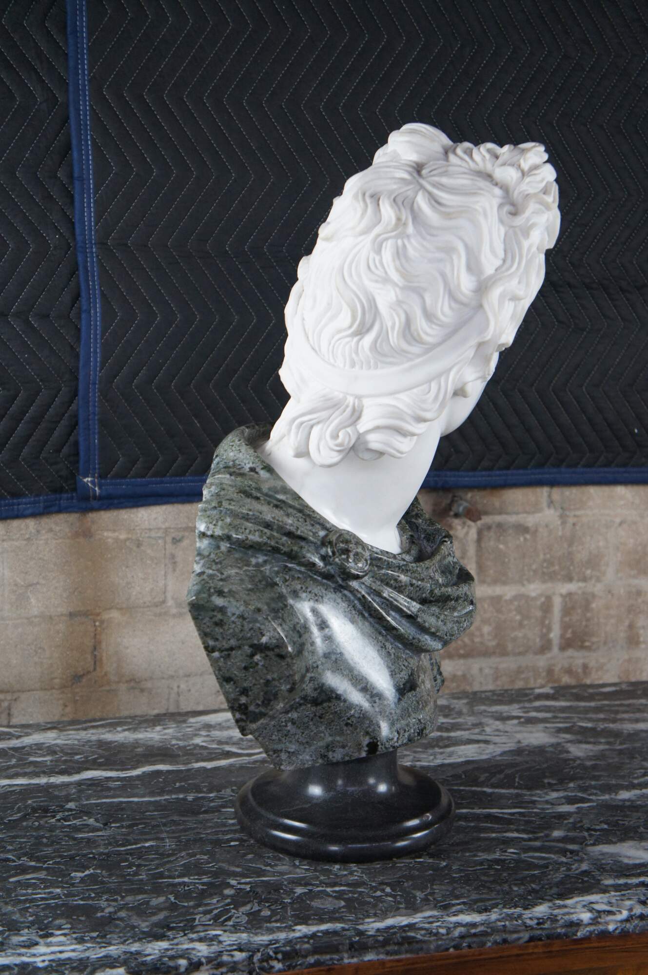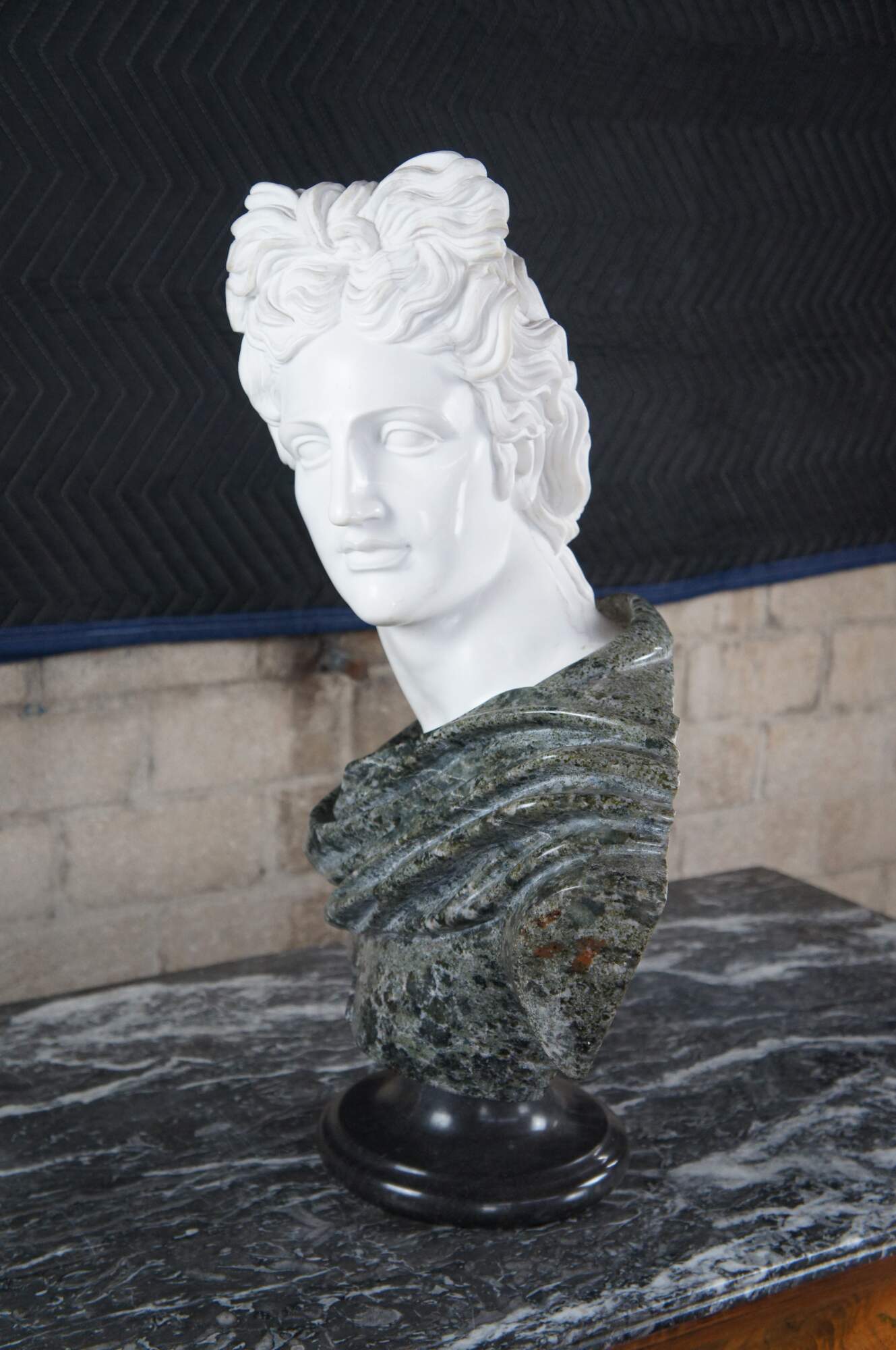 A carved two-toned marble bust depicting the image of Apollo with draped garb details. Mounted to a round tapered marble plinth. circa 20th century. Very heavy and stately. Made in Italy. Perfect for display on a table, bookcase or stand.