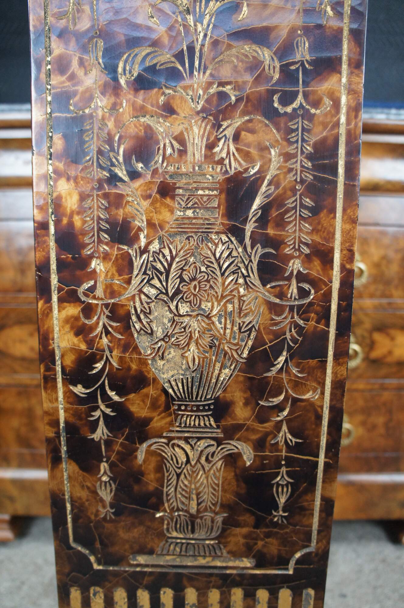 A Chinese Coramandel Faux Tortoise Shell pedestal or sculpture stand by Maitland Smith, Circa 1980s. Features a traditional grecian form with decorative foliate motifs, a floral urn and fluted accents. Marked along underside. Great for display of a clock, sculpture, bust vase or plant.