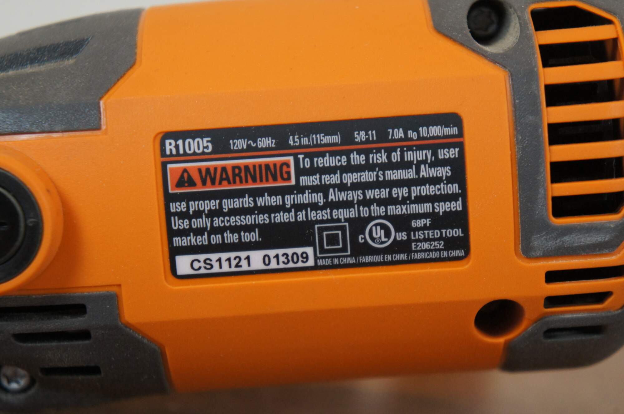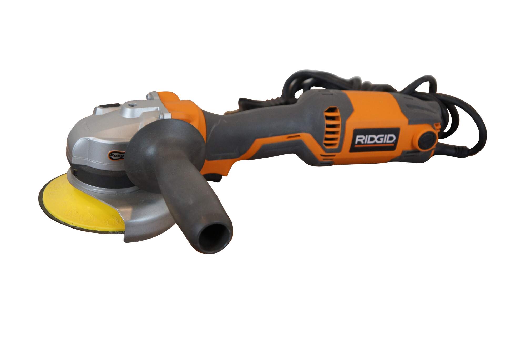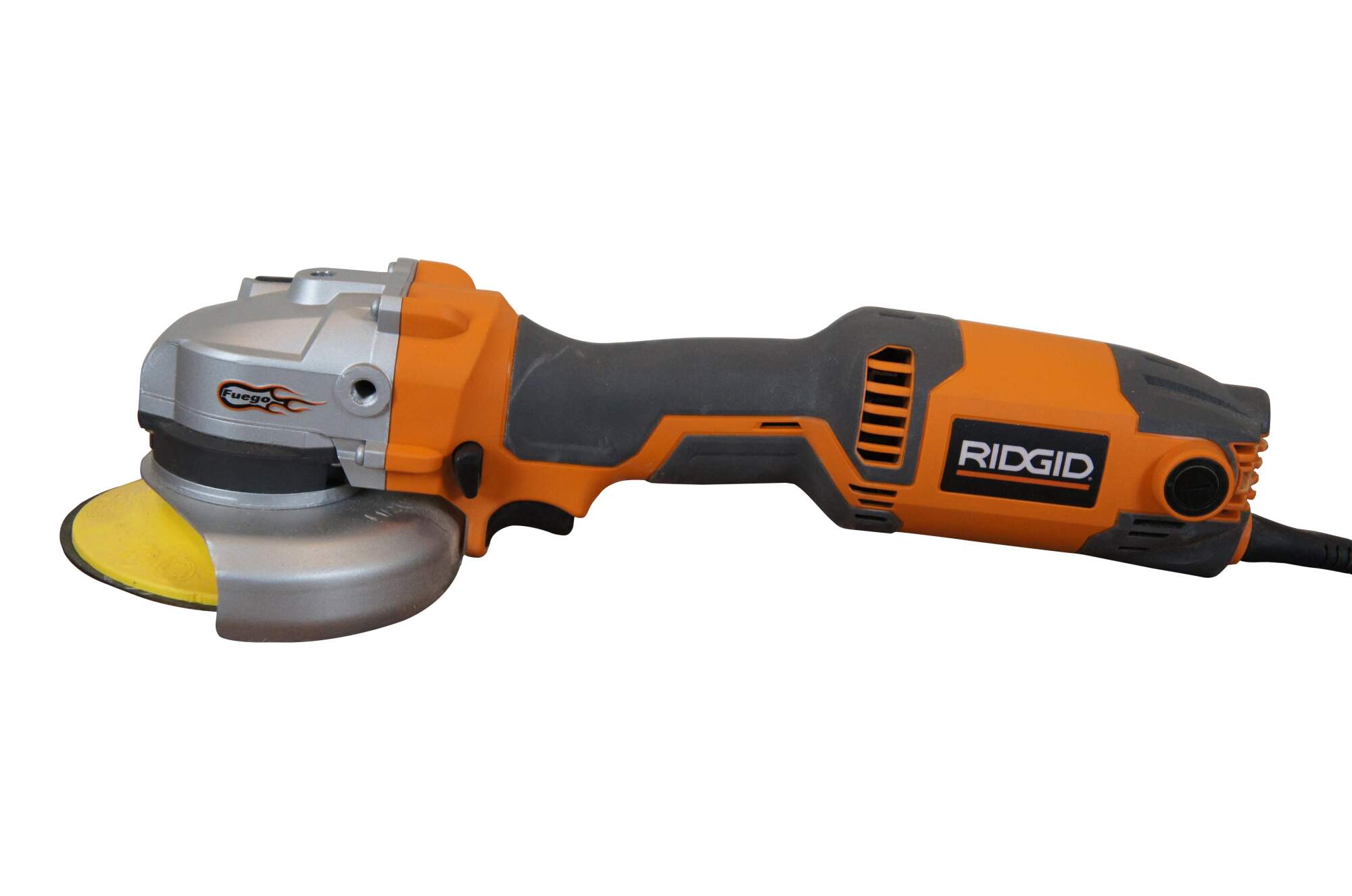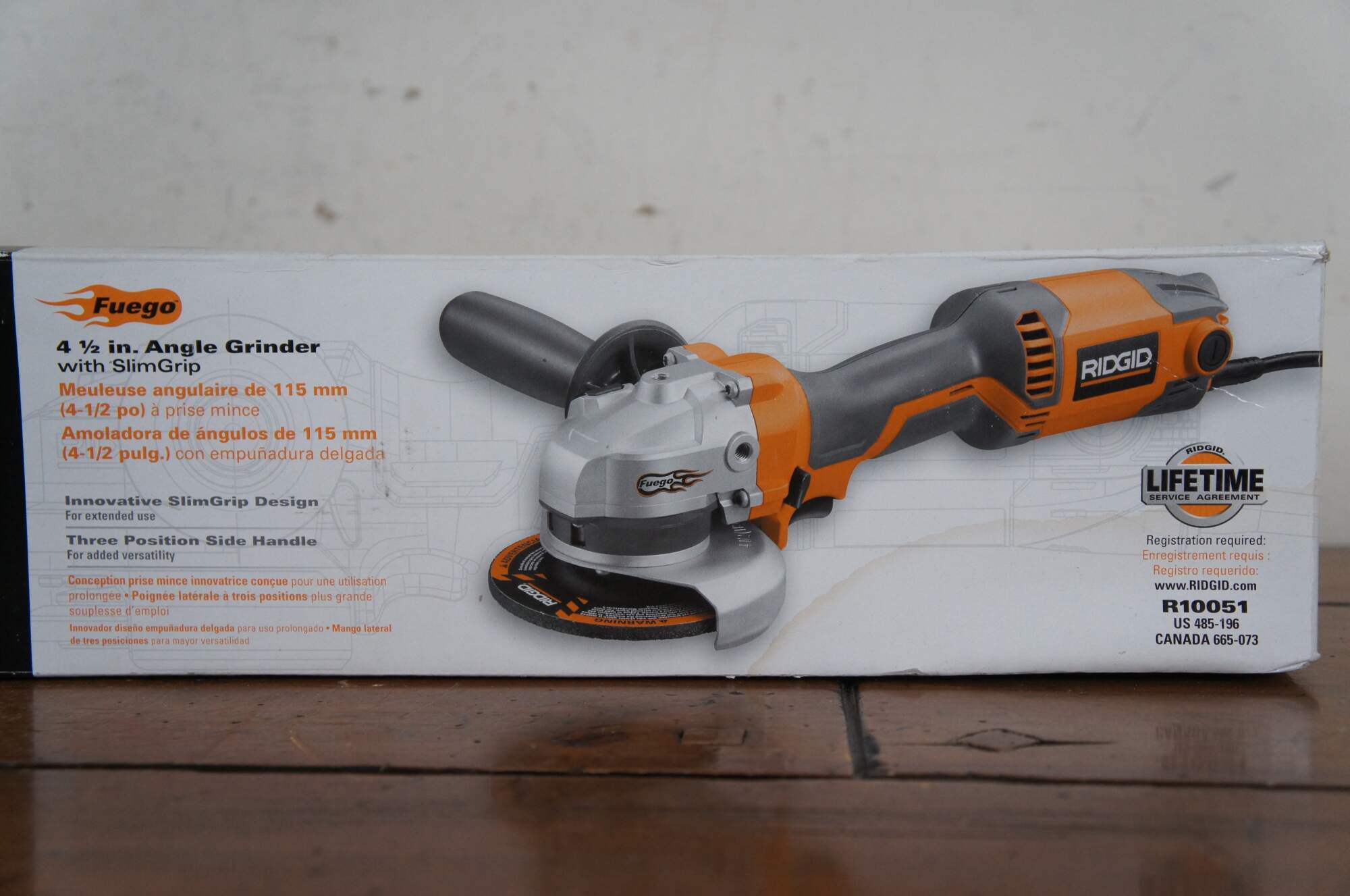 Ridgid Fuego 4.5" Angle Grinder with Slim Grip. R10051 - 120V~60Hz - 4.5 in. (115mm) - 5/8-11 - 7.0A no 10,000/min - CS1121 01309. Grip can be screwed onto three different sides of tool for optimal grip. Corded power. Includes original box and Operator's Manual.