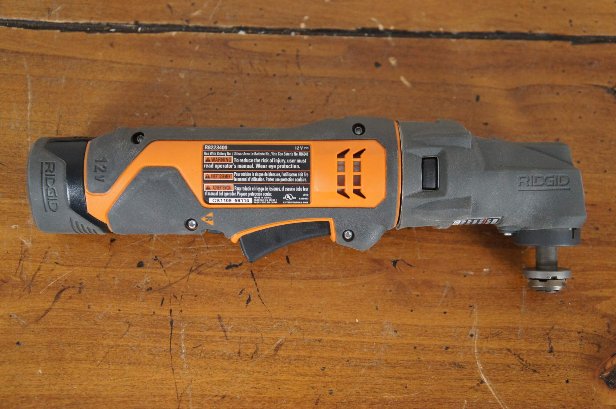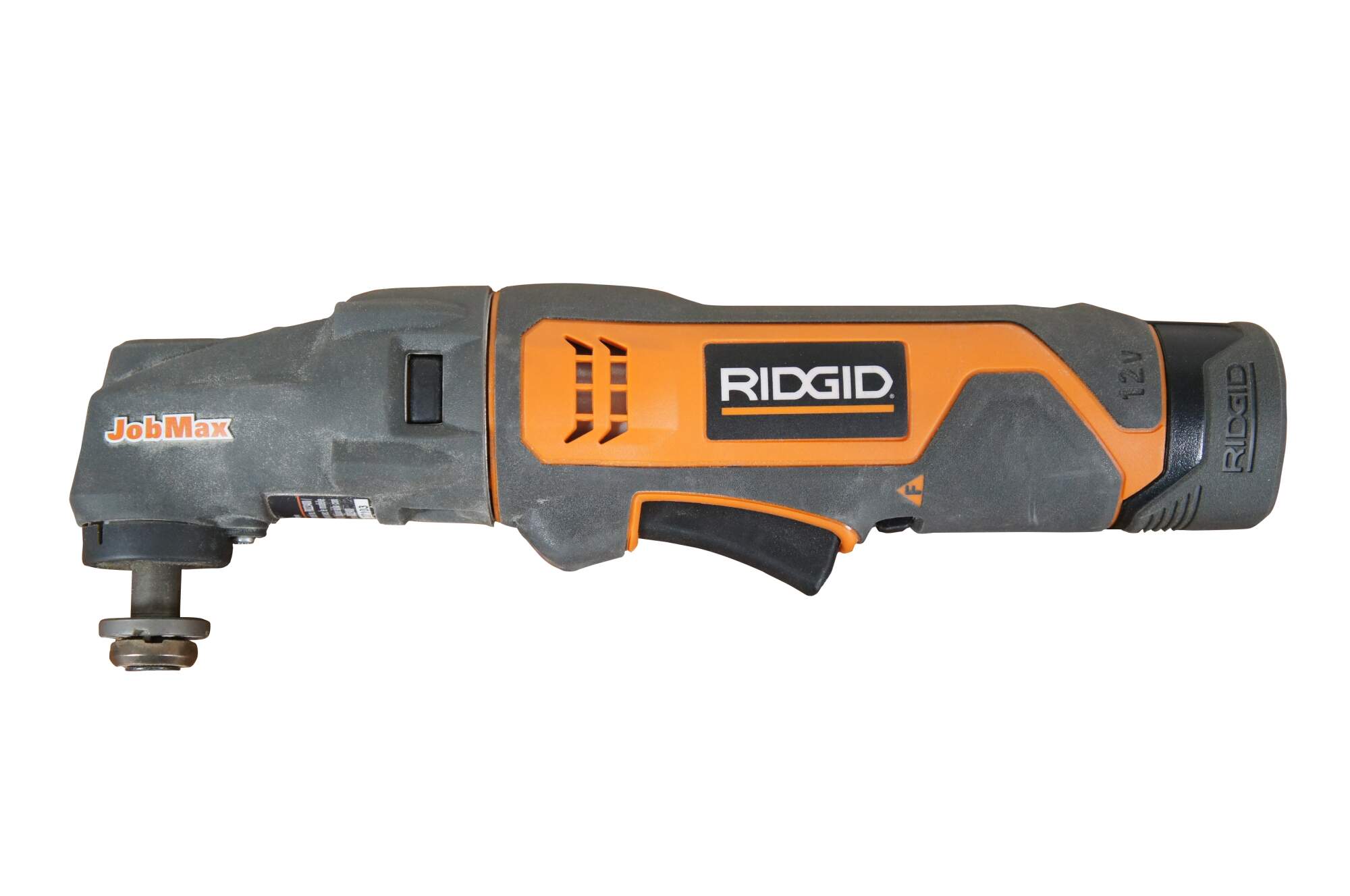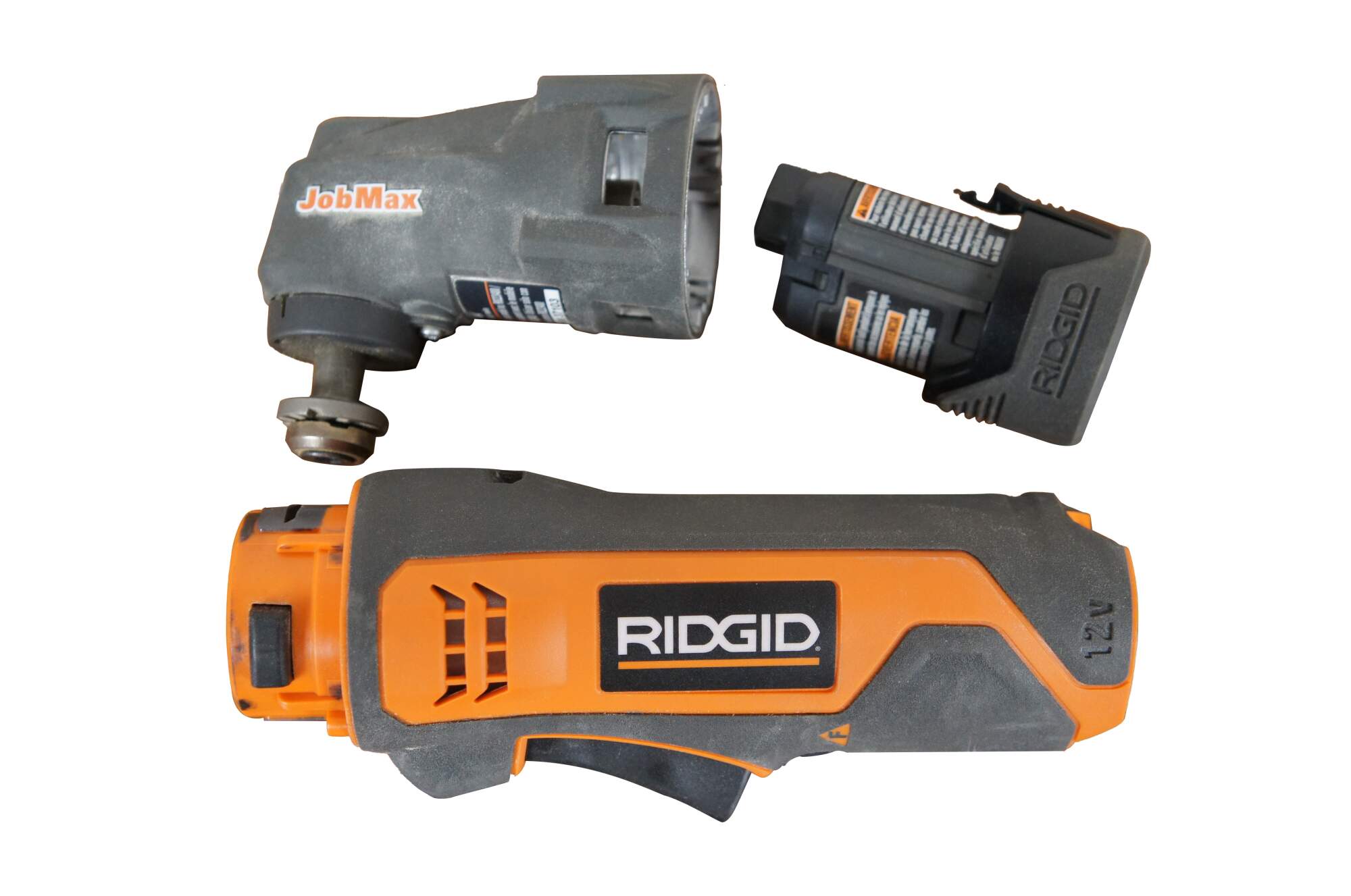Ridgid JobMax cordless multi-tool kit / set. 12V Lithium Ion Jobmax Power Handle R8223400 - CS1109 59114. JobMax Multi-Tool Head R8223404 - CS1108 37103. 12V Lithium Ion Battery Pack R86048 - CS11085N474414. Includes charging base, storage bag, blade, sandpaper sheets, Operator's Manuals.