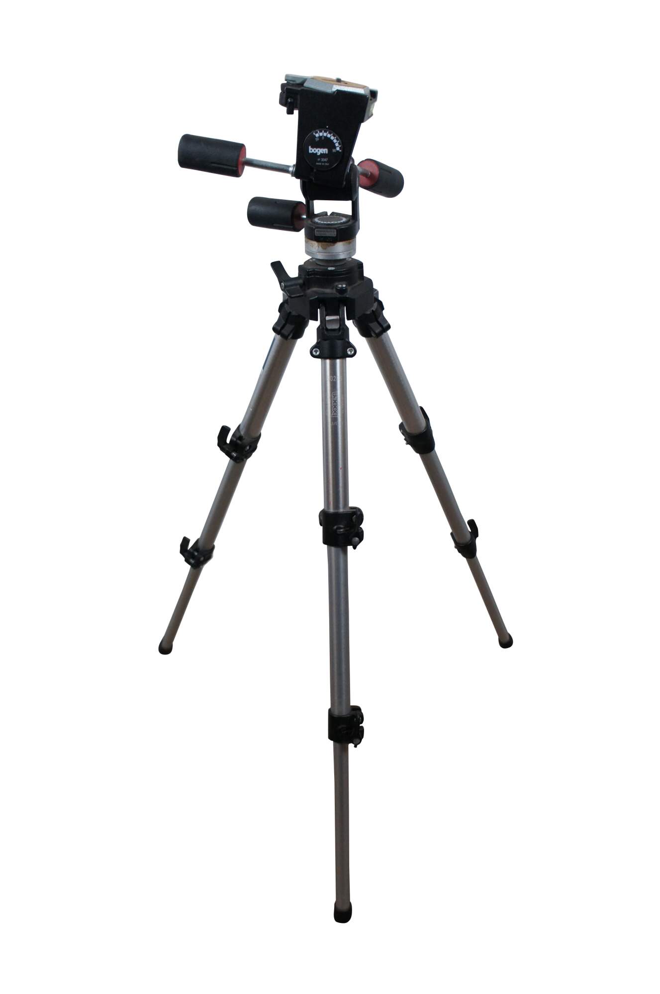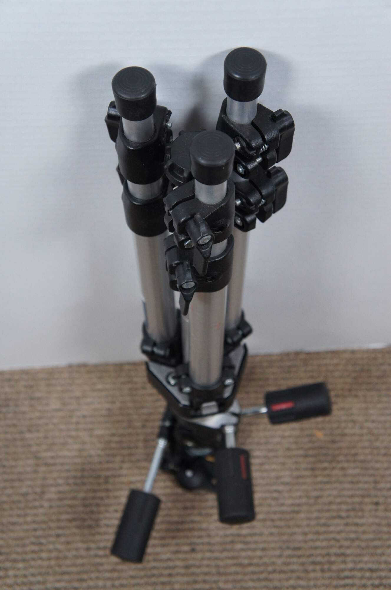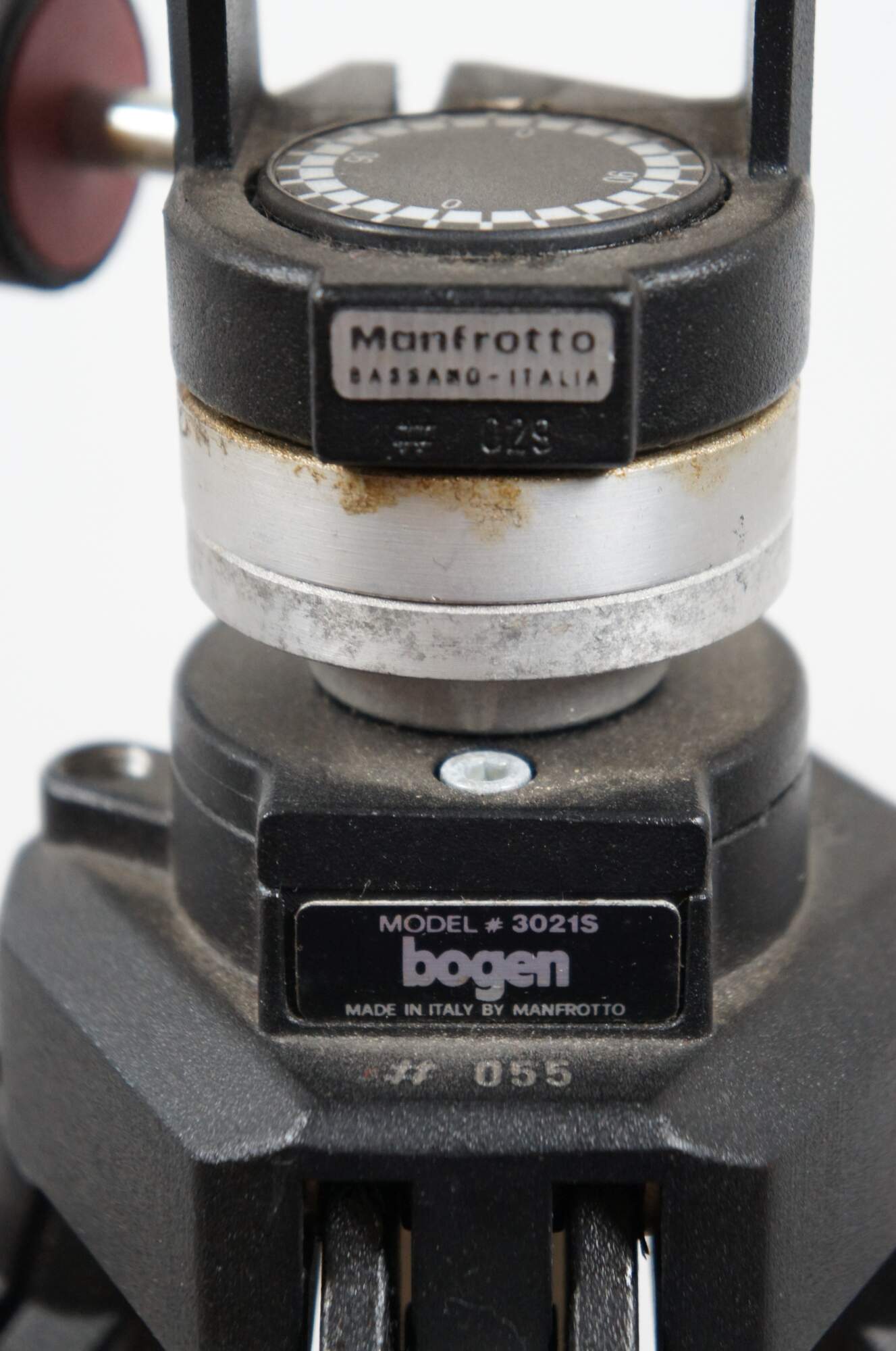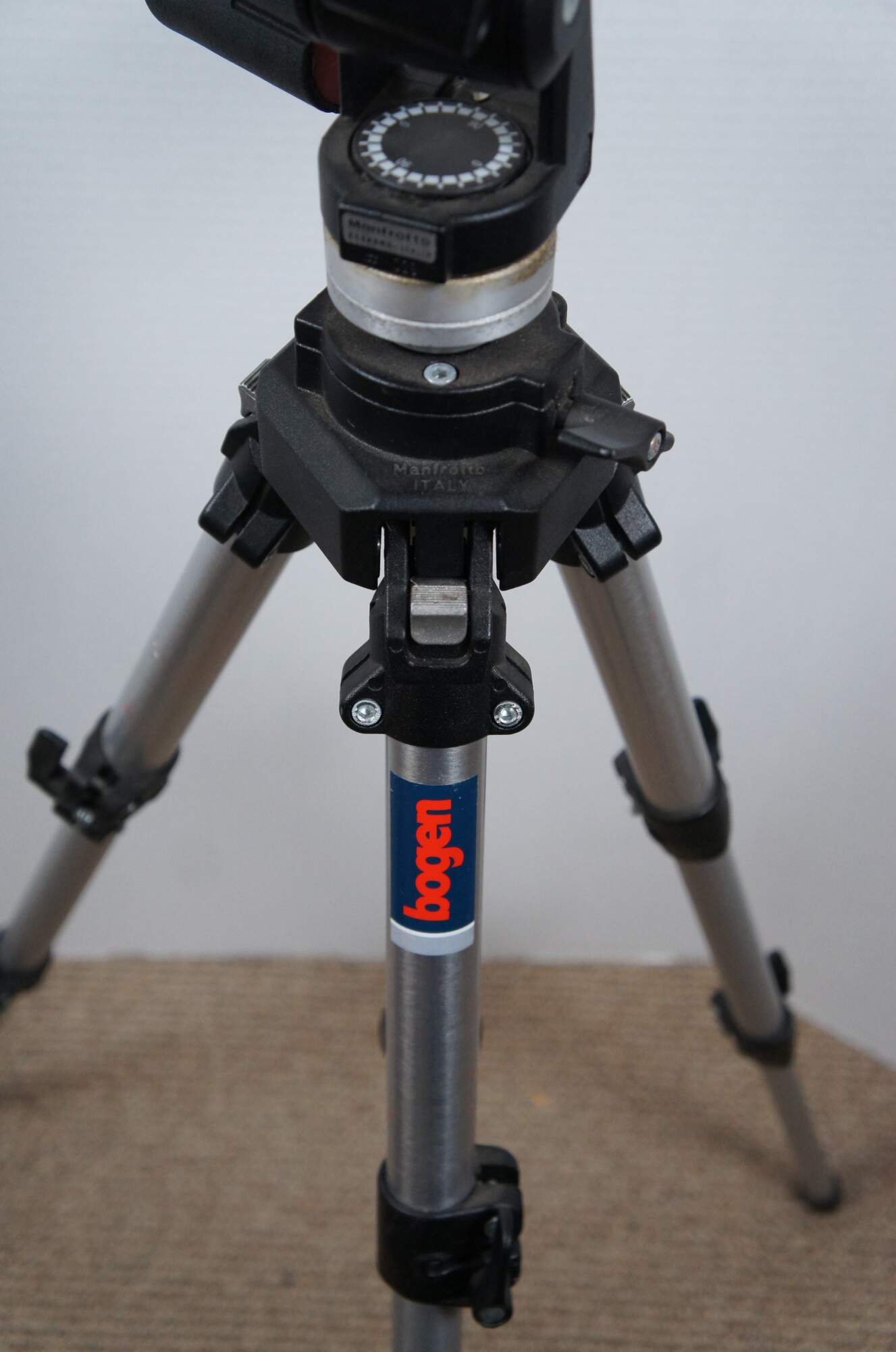 Late 20th century Bogen model #3021S professional tripod. Aluminum and plastic with folding / retractable legs. 055/EG29. Panning / tilting head #3047. Made in Italy by Manfrotto.