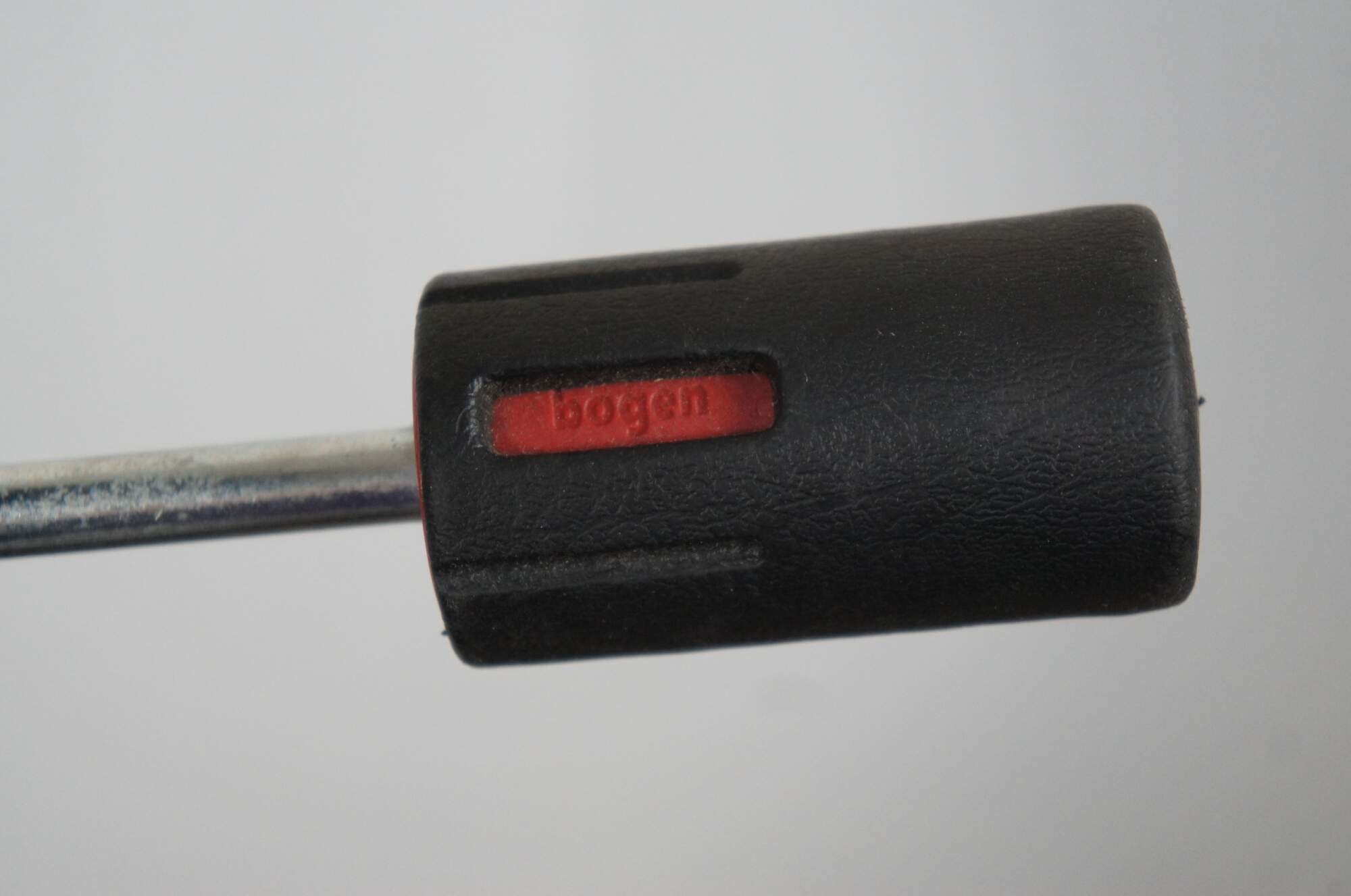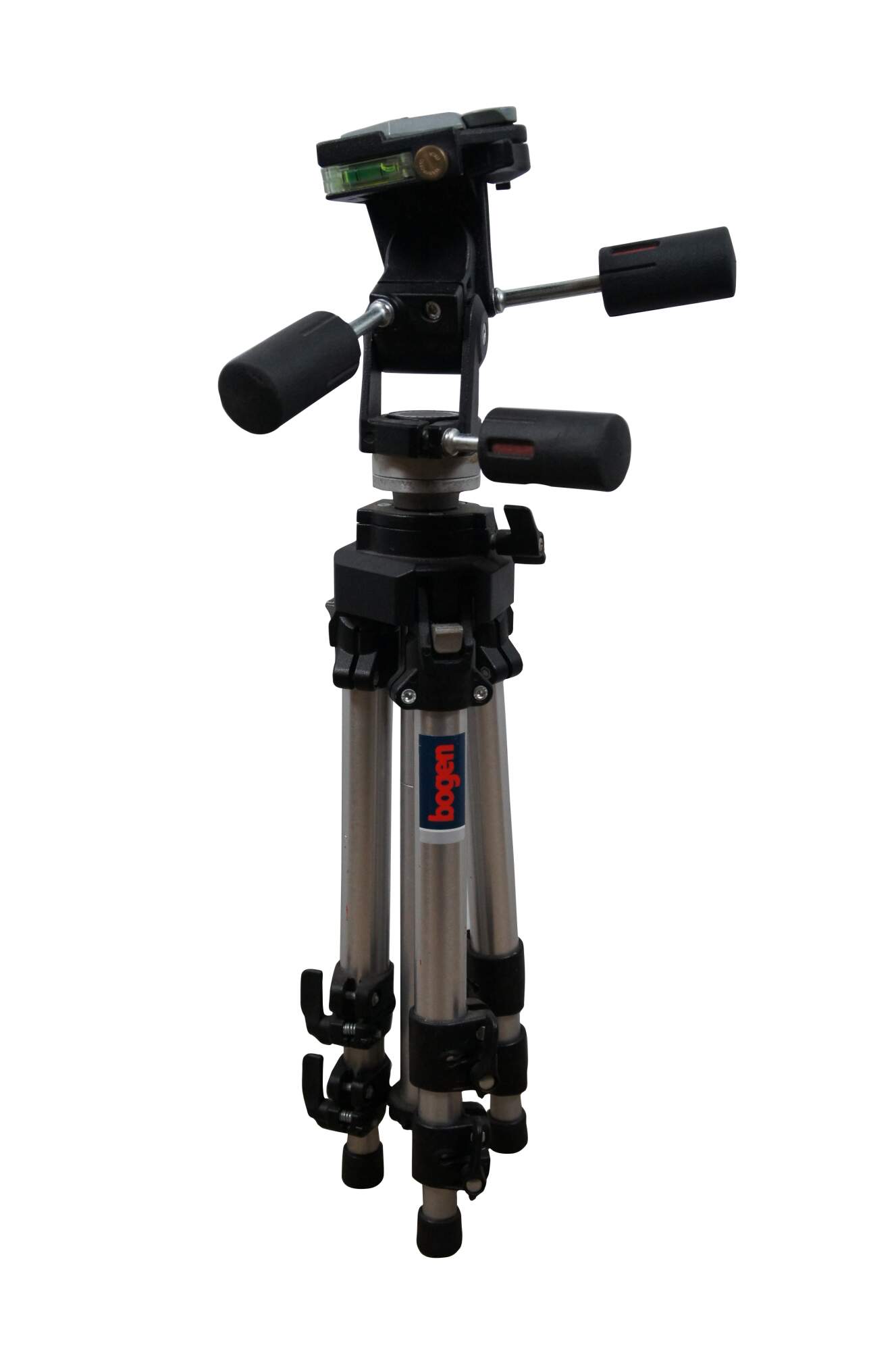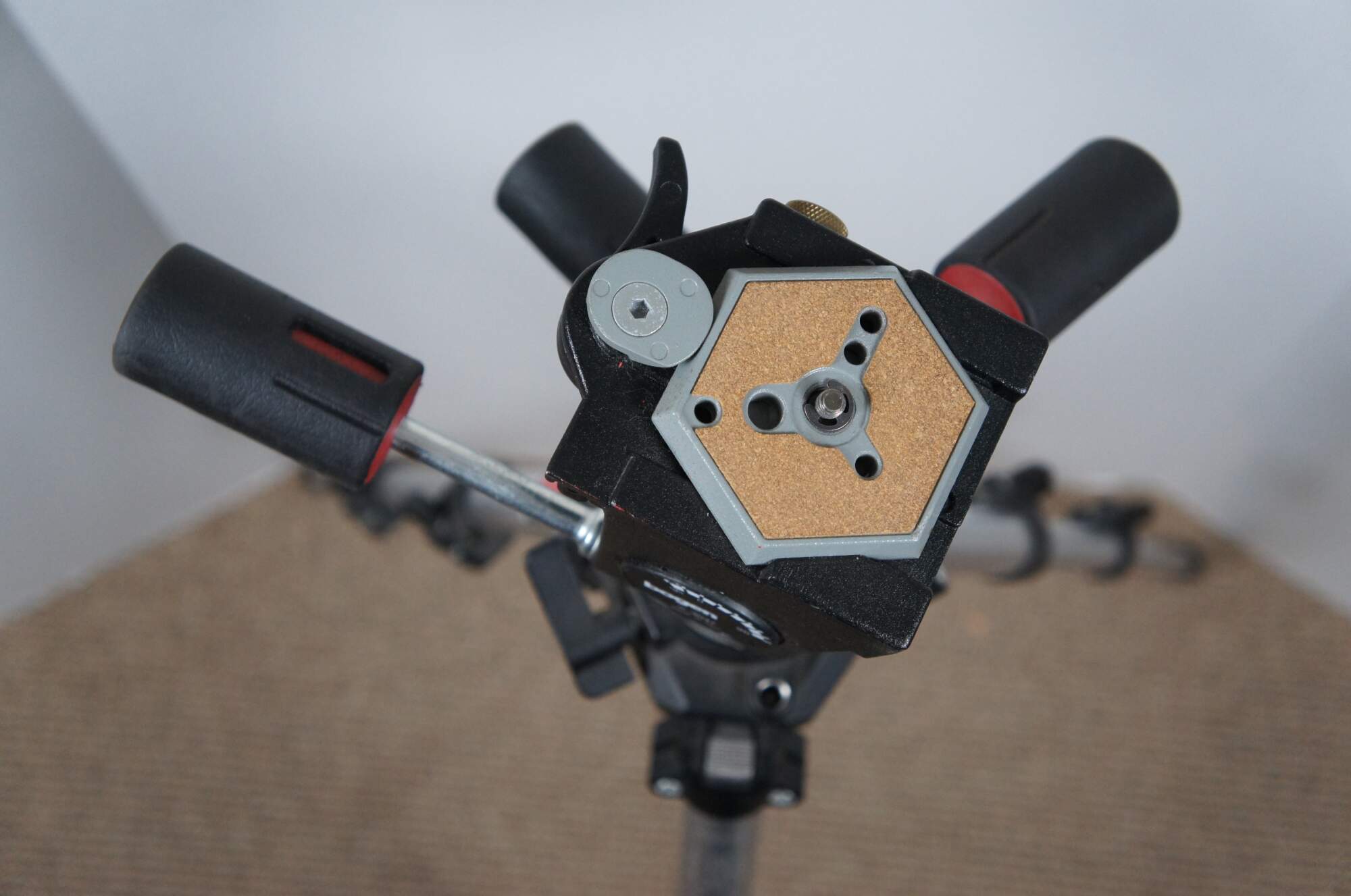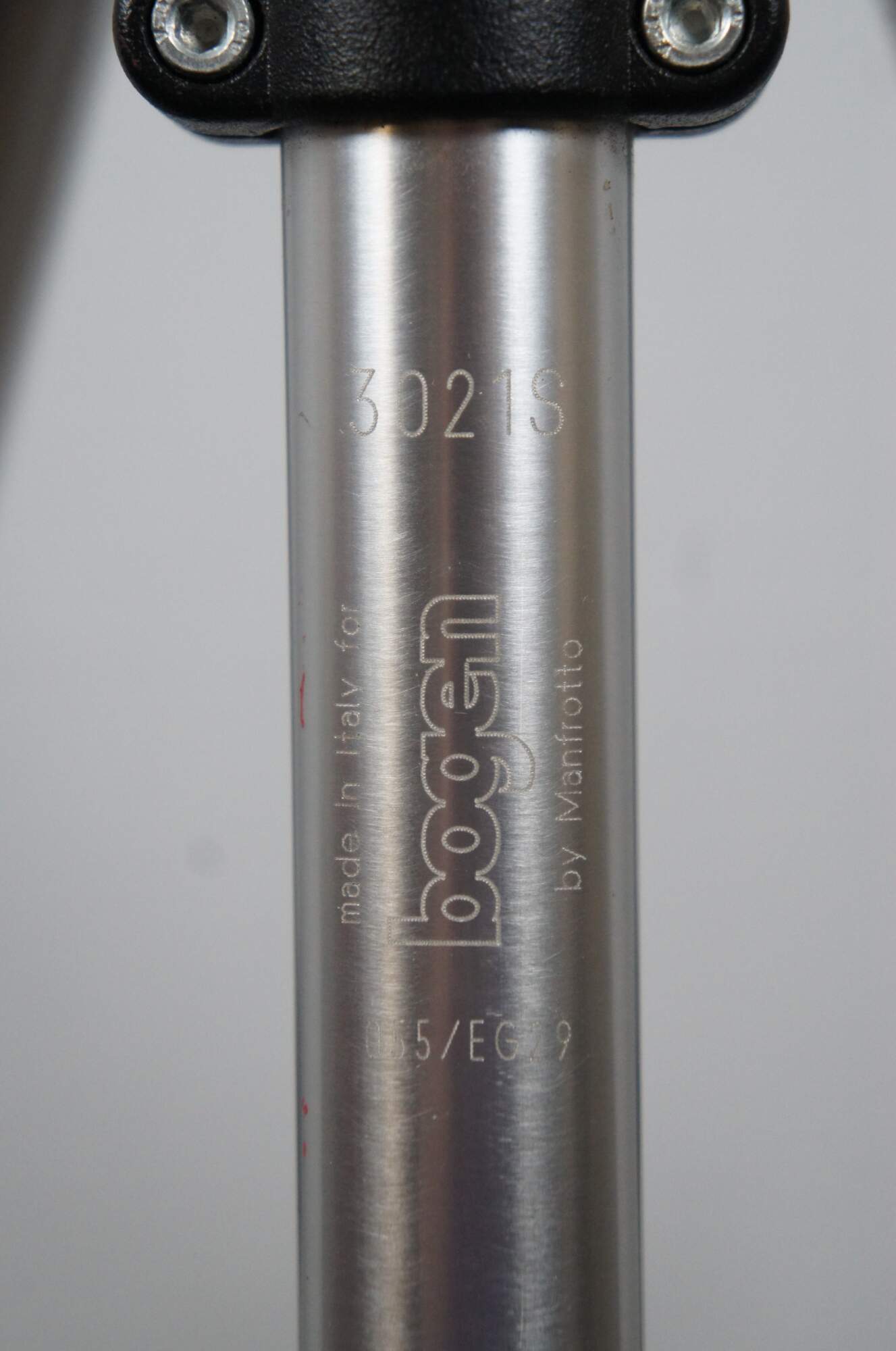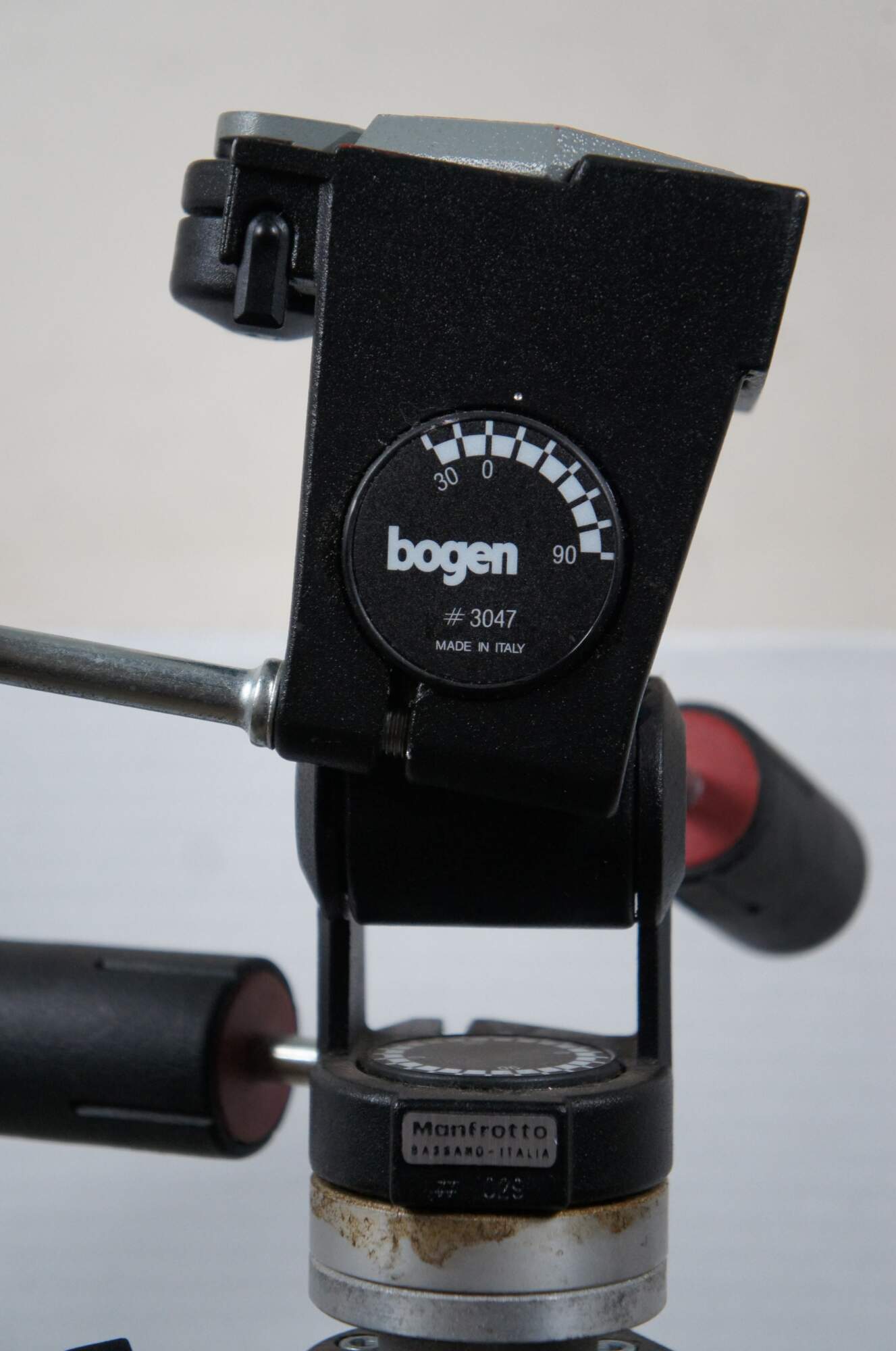 Late 20th century Bogen model #3021S professional tripod. Aluminum and plastic with folding / retractable legs. 055/EG29. Panning / tilting head #3047. Made in Italy by Manfrotto.