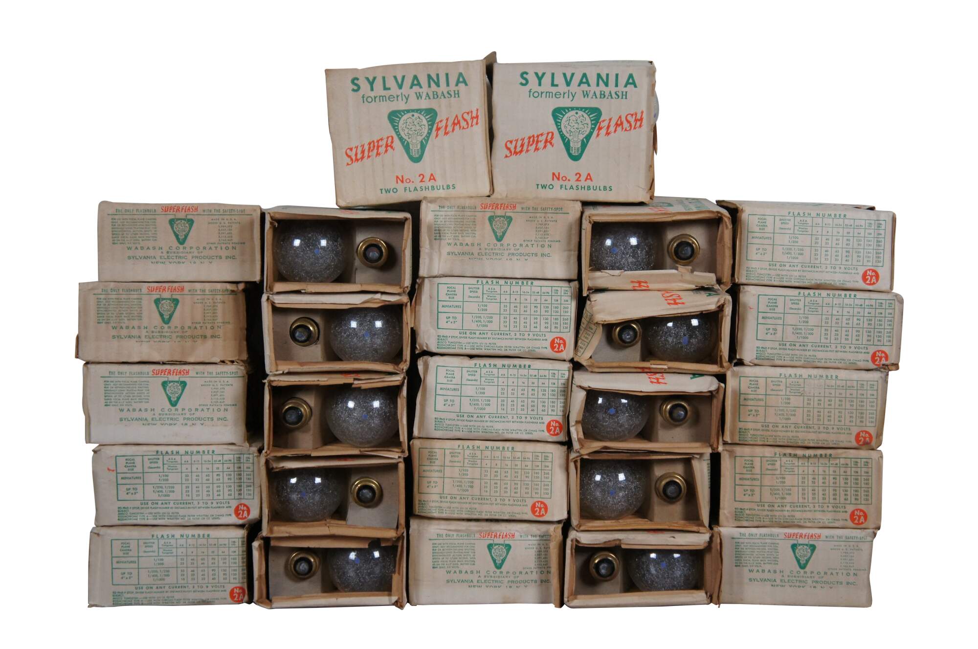 Lot of 67 vintage mid to late 20th century camera photolamps / camera flash bulbs in original packaging - 13 Wabash Super Flash / Sylvania Blue Dot No 2 Class M, 54 Sylvania Superflash No 2A.