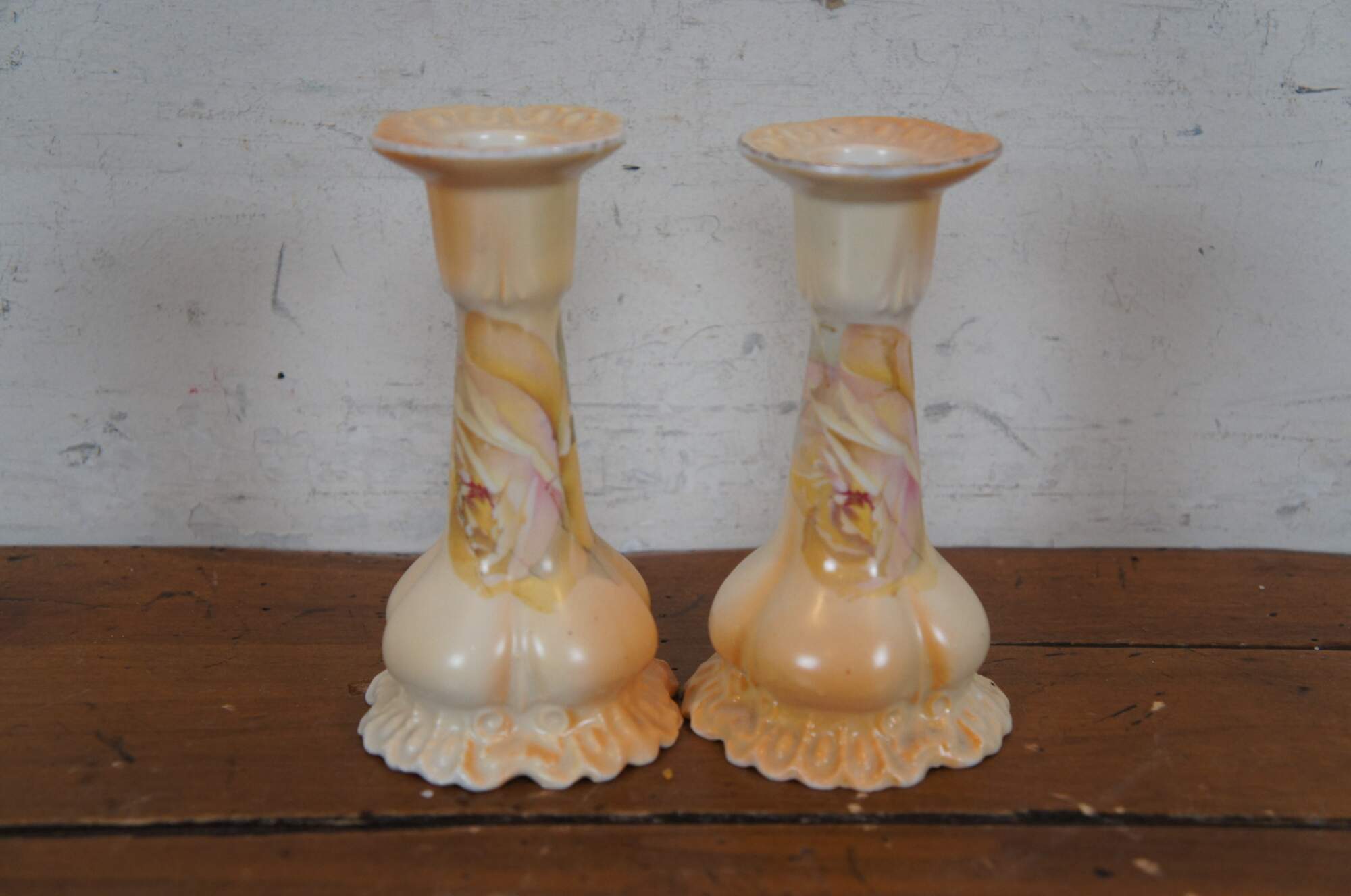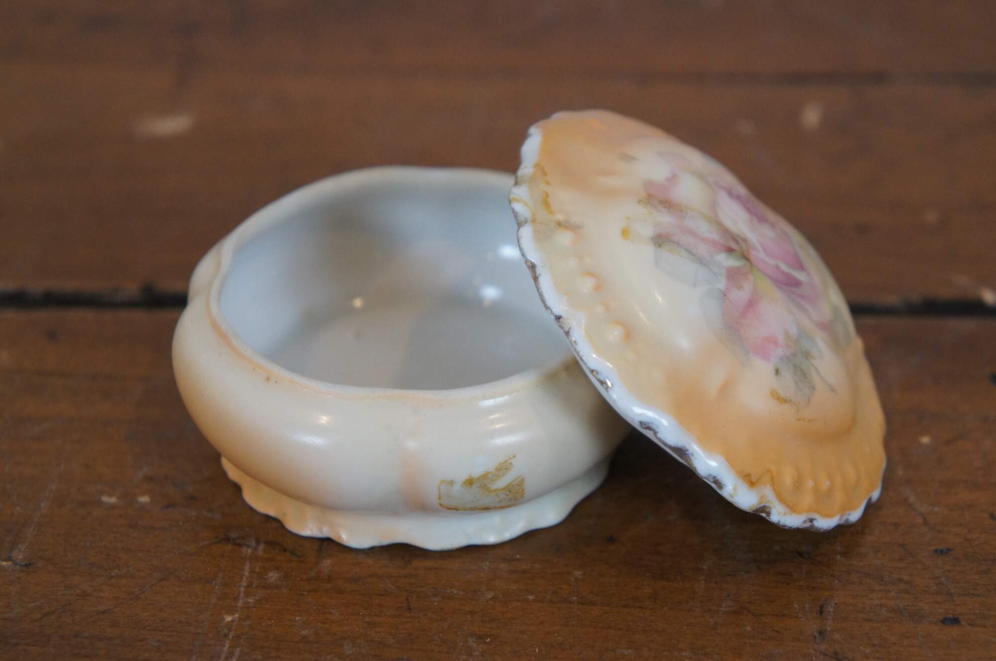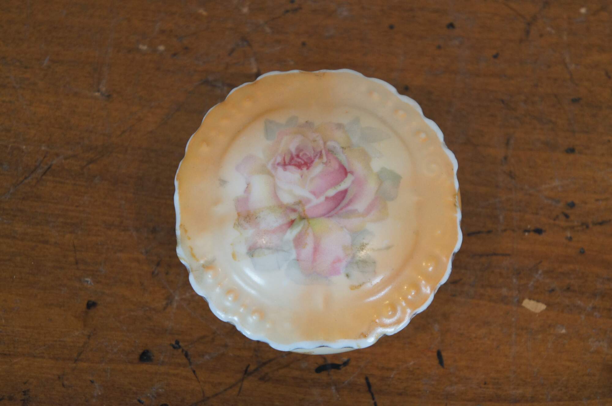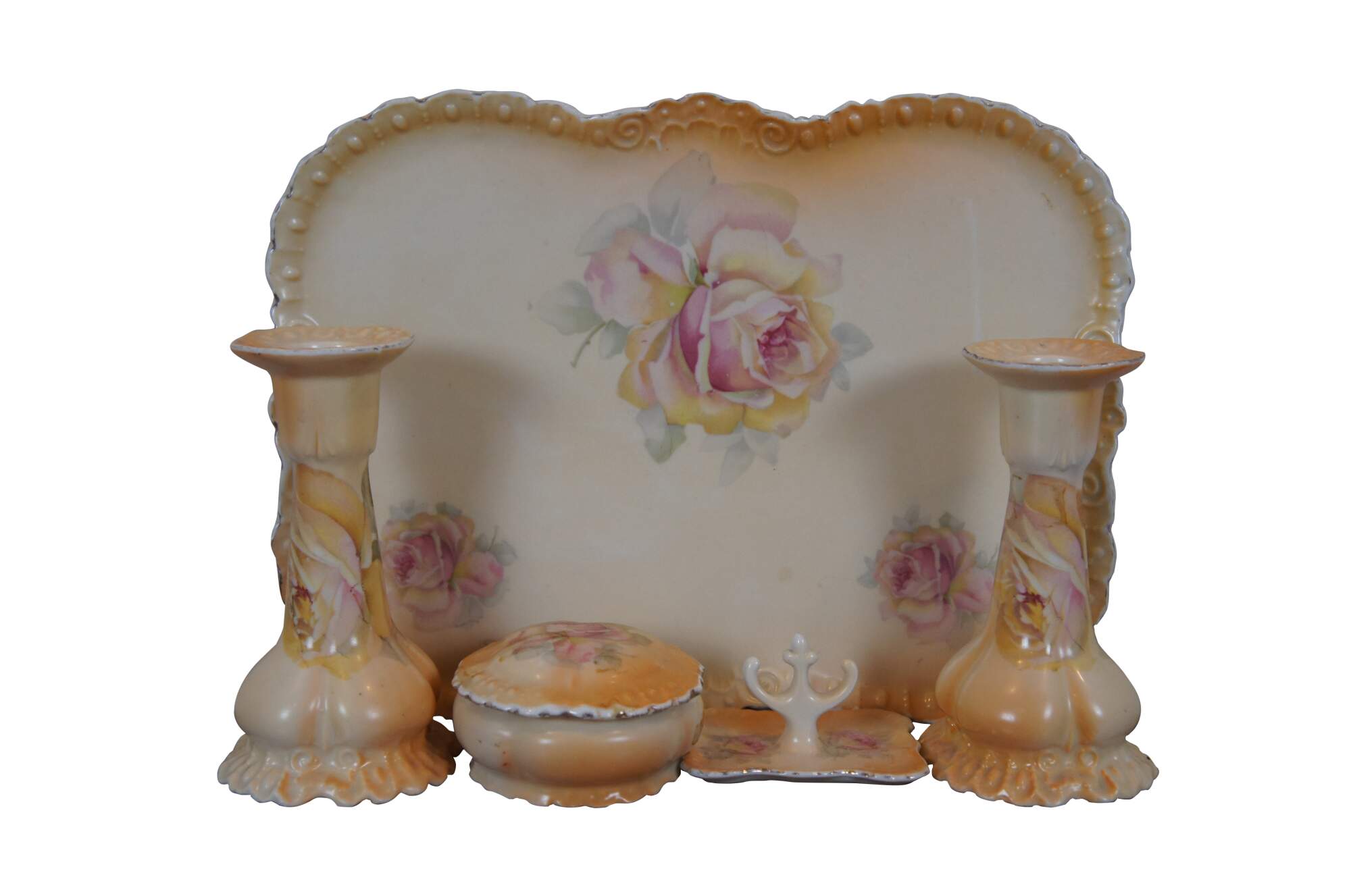 Early 20th century six piece Victoria Czech - Slovakia porcelain dressing table / vanity set including a tray, two candlesticks, lidded dish, and ring dish. Pieces feature molded, scalloped edges and peachy coloring, litho printed with pink and green roses. Mark used circa 1918-1939.