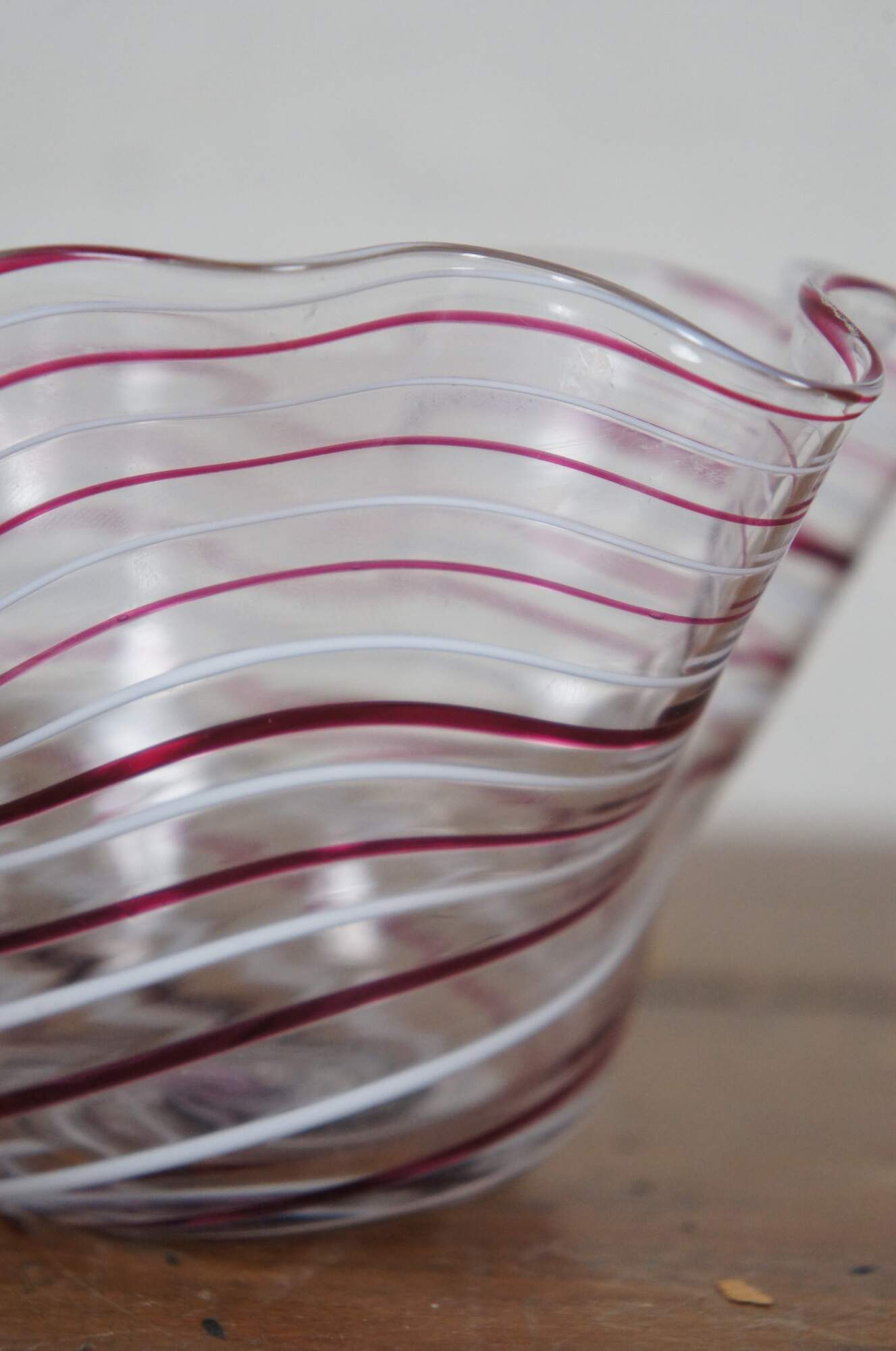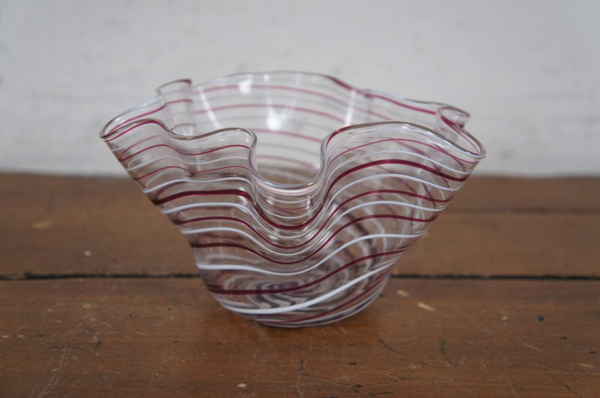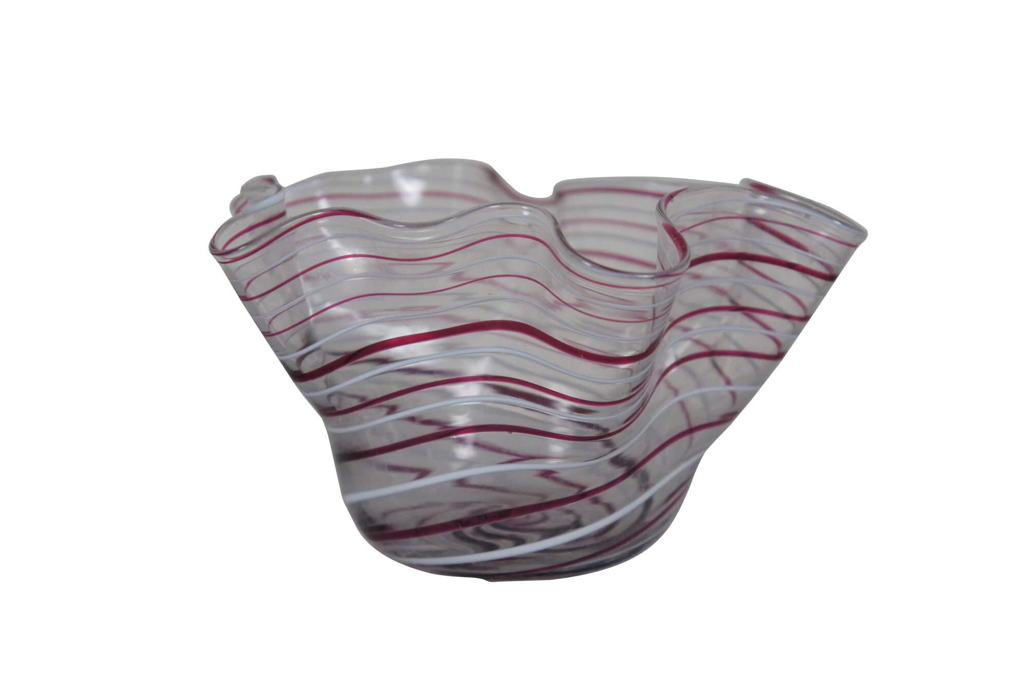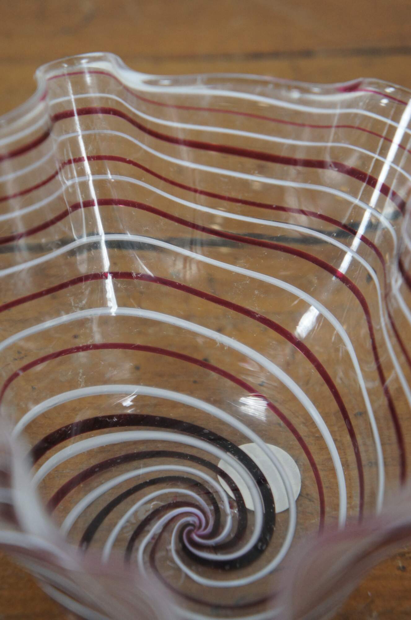 Late 20th century Pairpoint hand blown art glass ruffled handkerchief bowl / dish - clear body with with red and white pepermint candy swirl.
