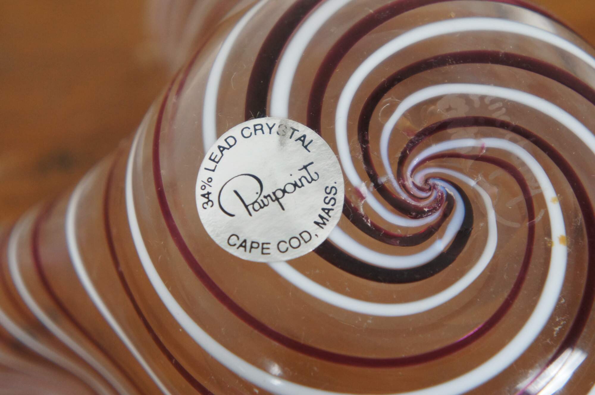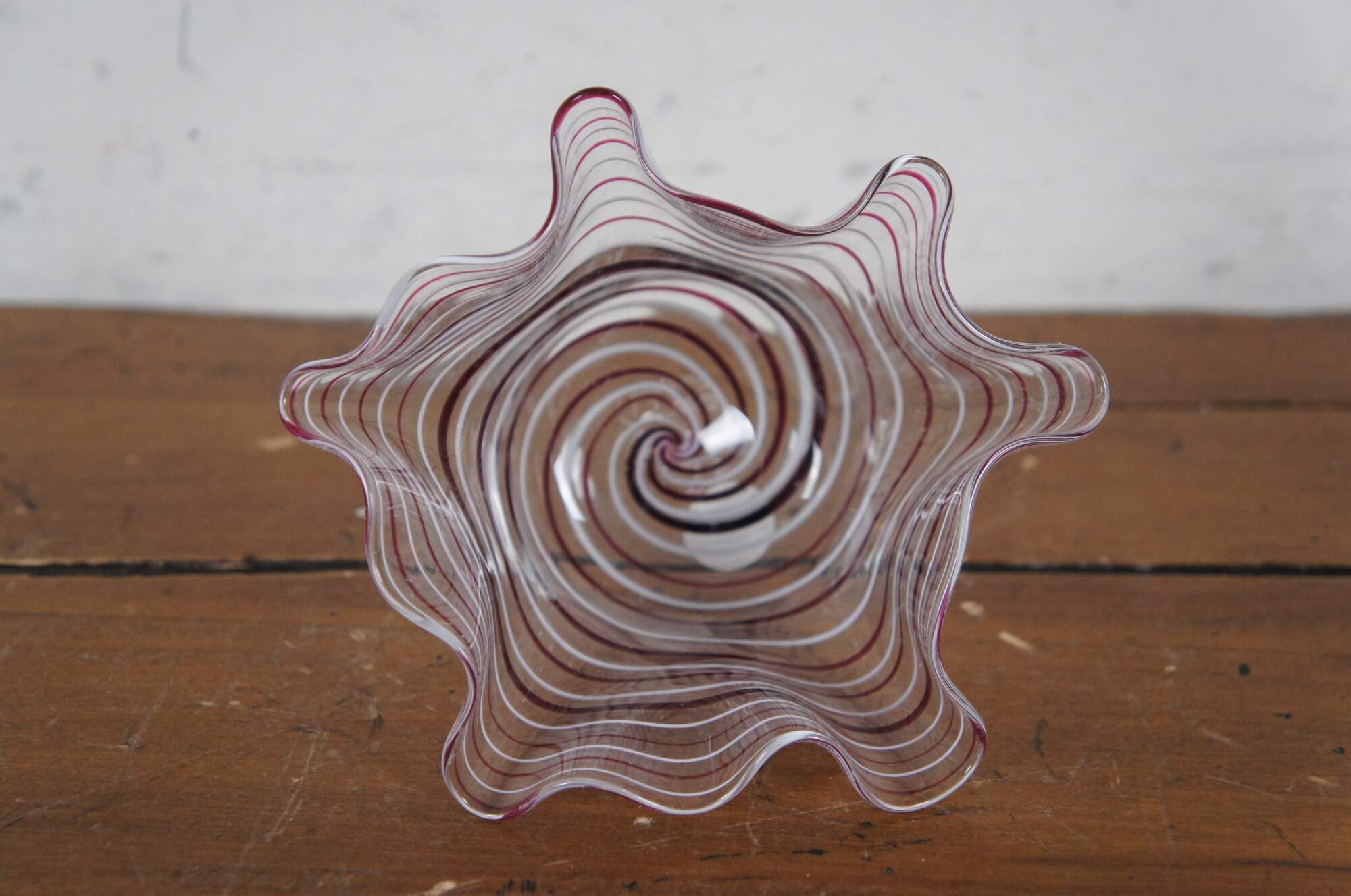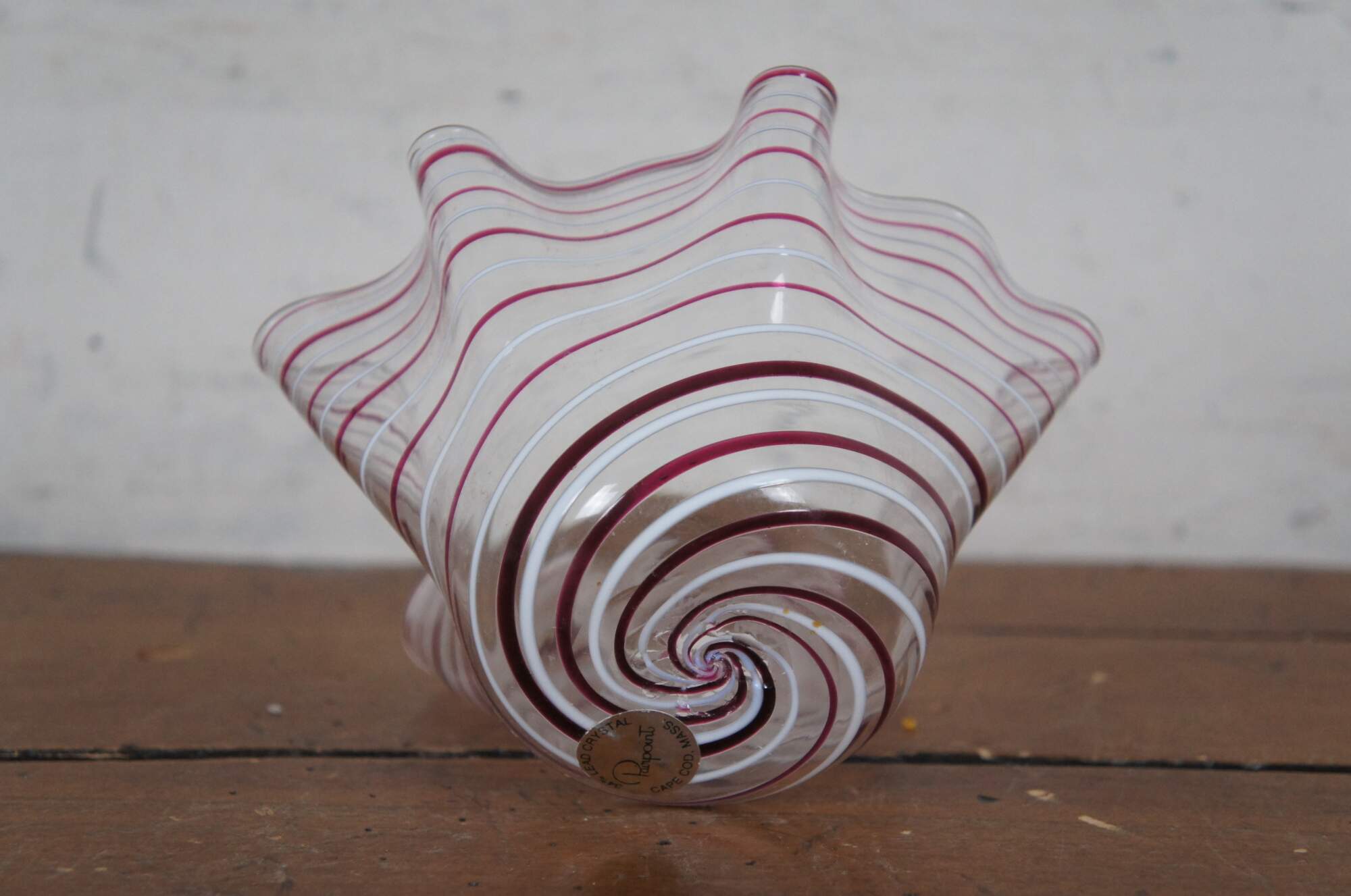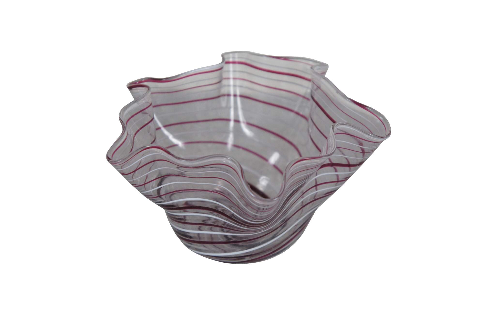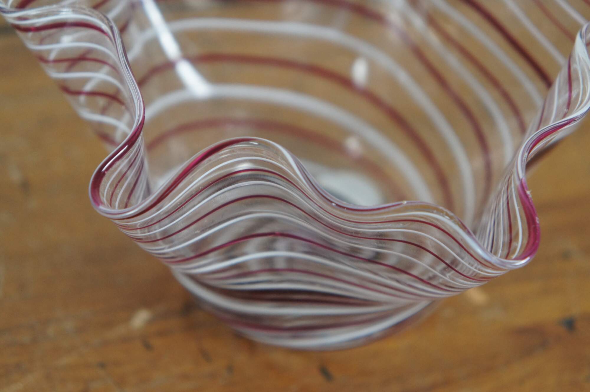 Late 20th century Pairpoint hand blown art glass ruffled handkerchief bowl / dish - clear body with with red and white pepermint candy swirl.