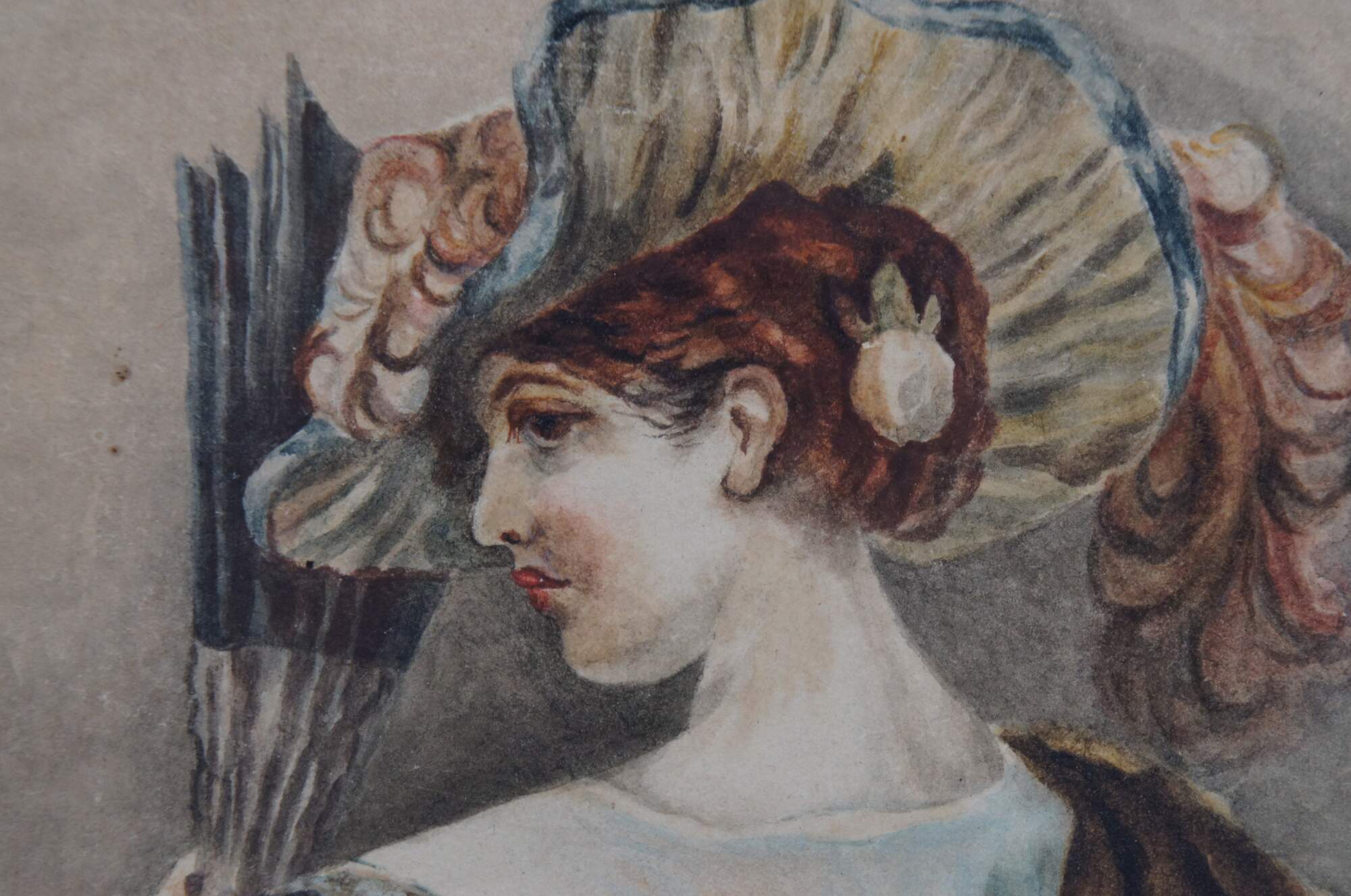 Antique circa 1912 folk art oval watercolor on paper portrait paintings, showing a woman and a girl in elaborate Victorian dress. Girl signed A.H. (A.S.H) in lower right and white mat.